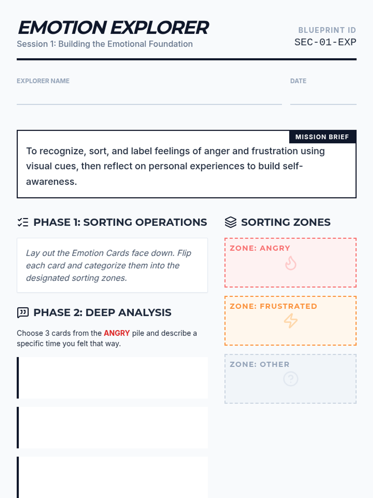 Focuses on identifying and labeling complex emotions to build a foundation for self-regulation.