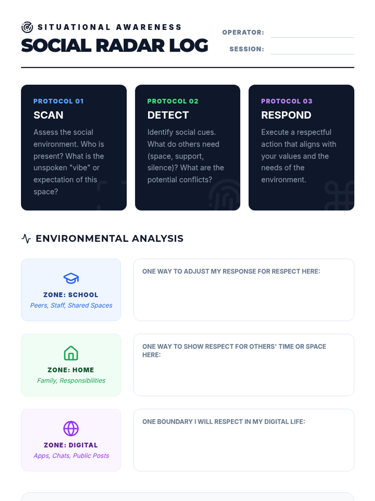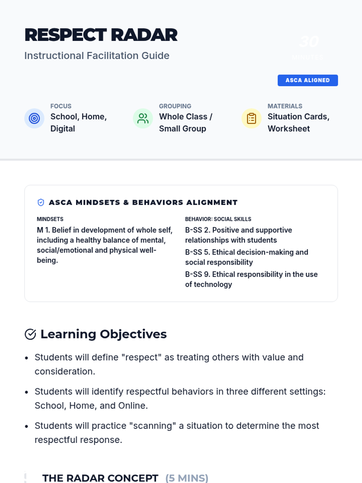 A 30-minute interactive lesson focused on identifying and practicing respectful behaviors across three key environments: school, home, and the digital world. Students use a 'radar' metaphor to scan their surroundings and choose the best way to show respect.