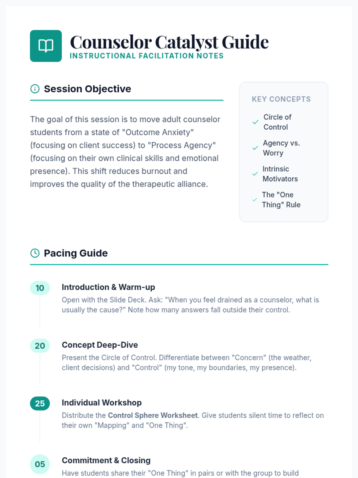 This lesson introduces adult counselor students to the Motivation Map framework, focusing on the Circle of Control and identifying internal versus external motivators to improve client outcomes and self-care.