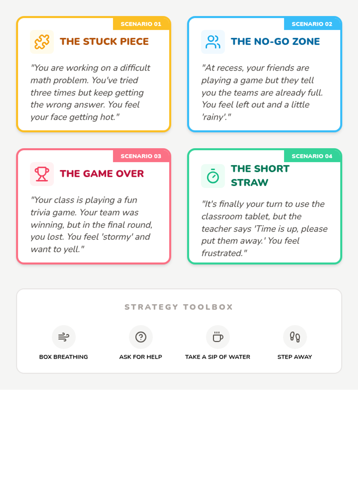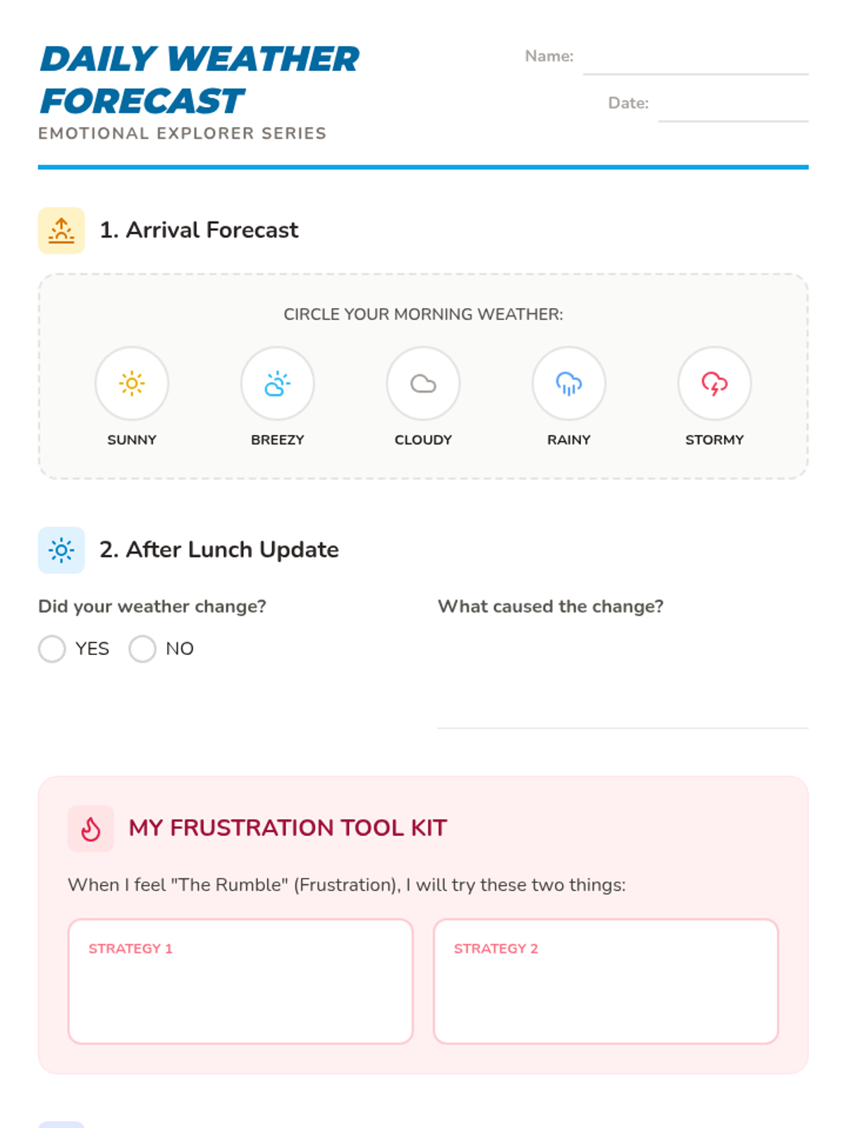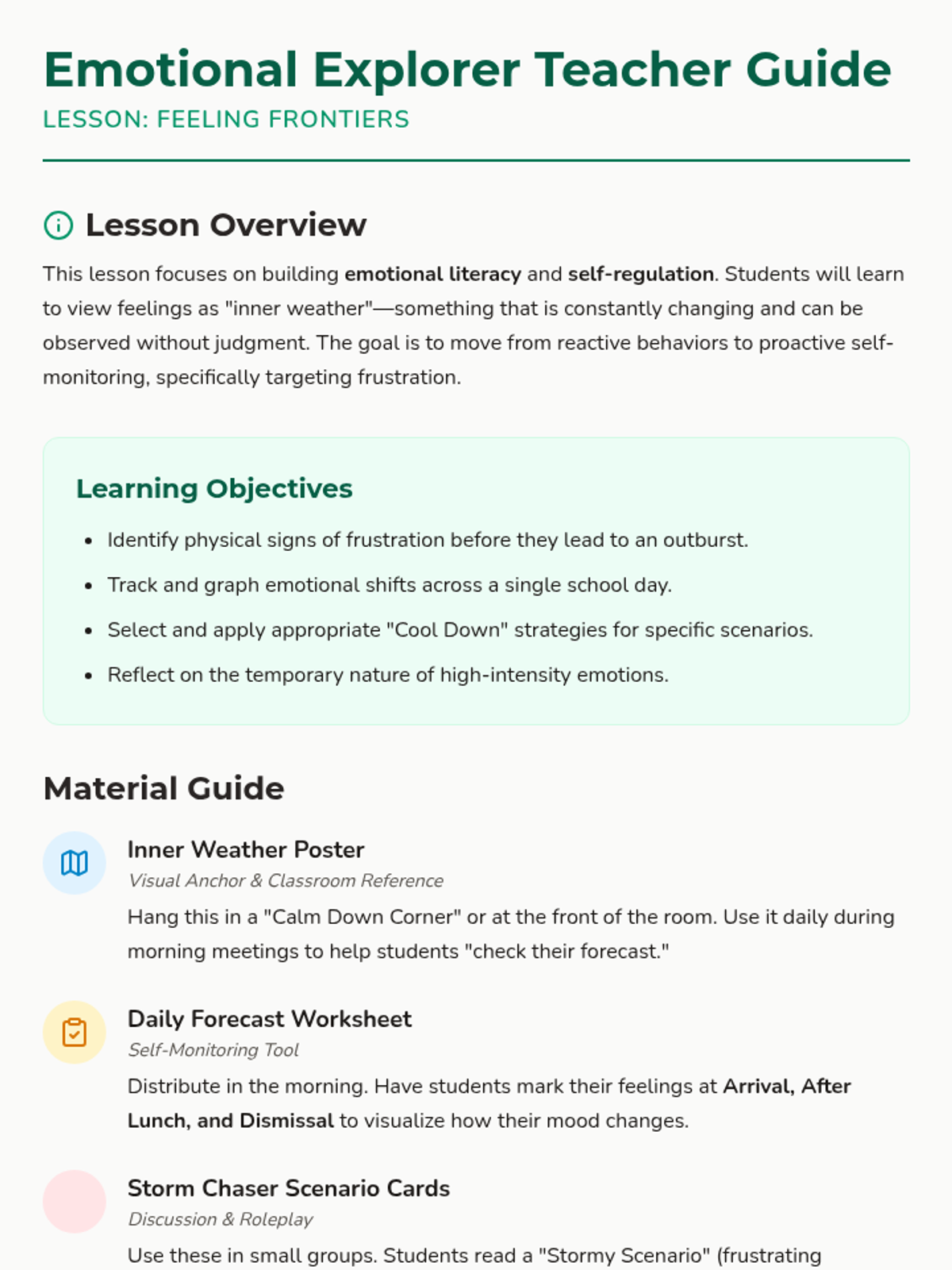 A comprehensive lesson designed to help students identify their emotional states, track how feelings change throughout the day, and develop concrete coping strategies for frustration.