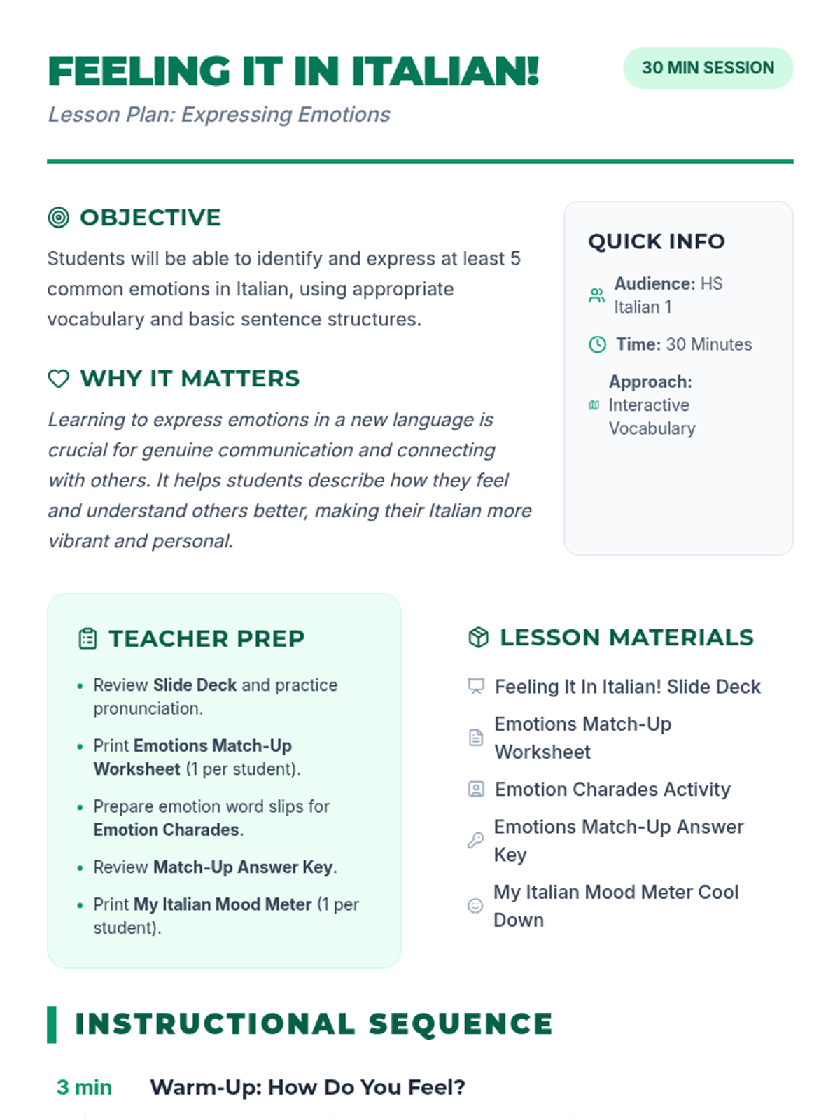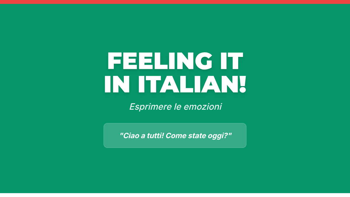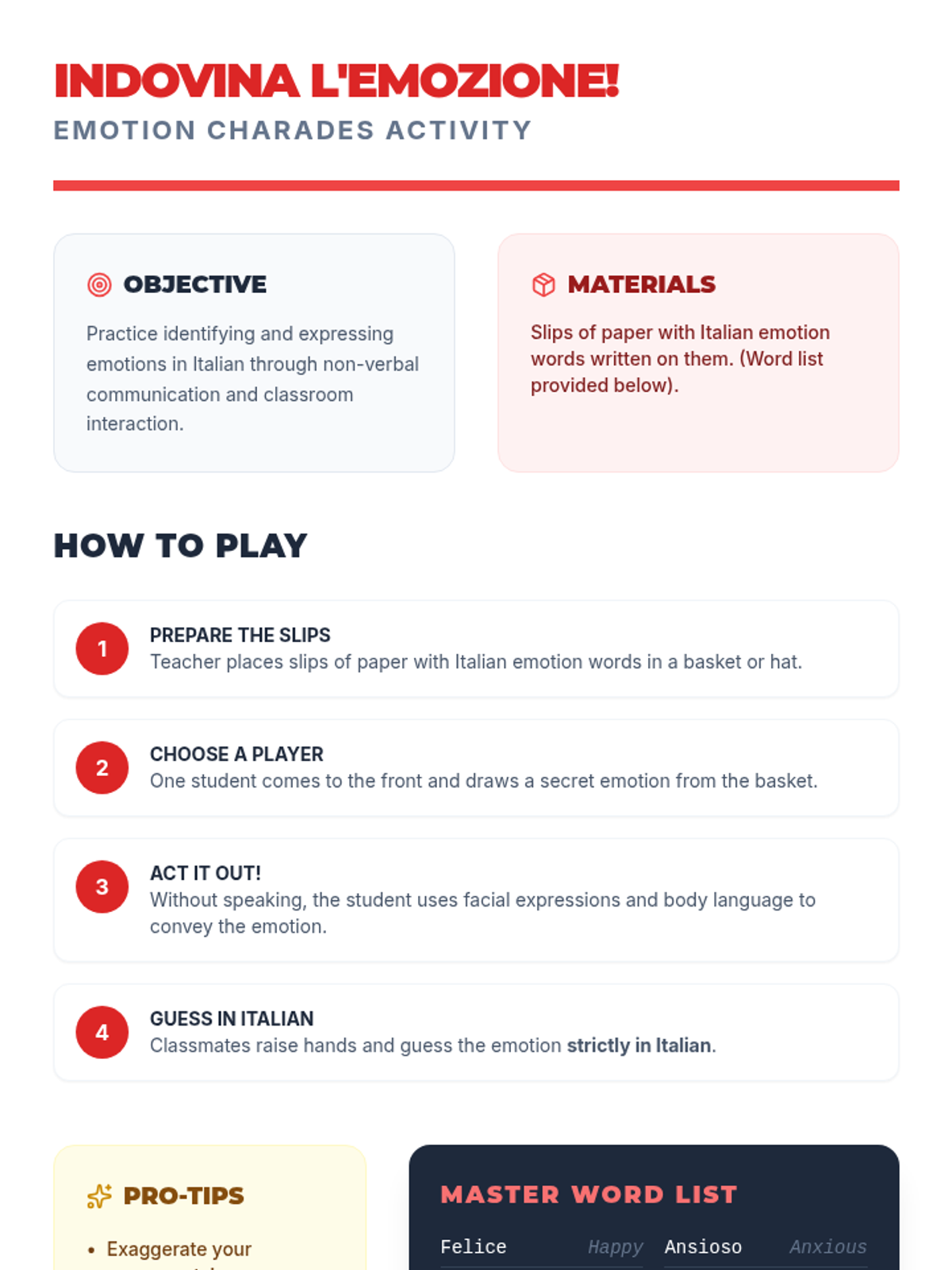 An introductory Italian 1 lesson focused on identifying and expressing common emotions through interactive slides, matching activities, and a charades game.