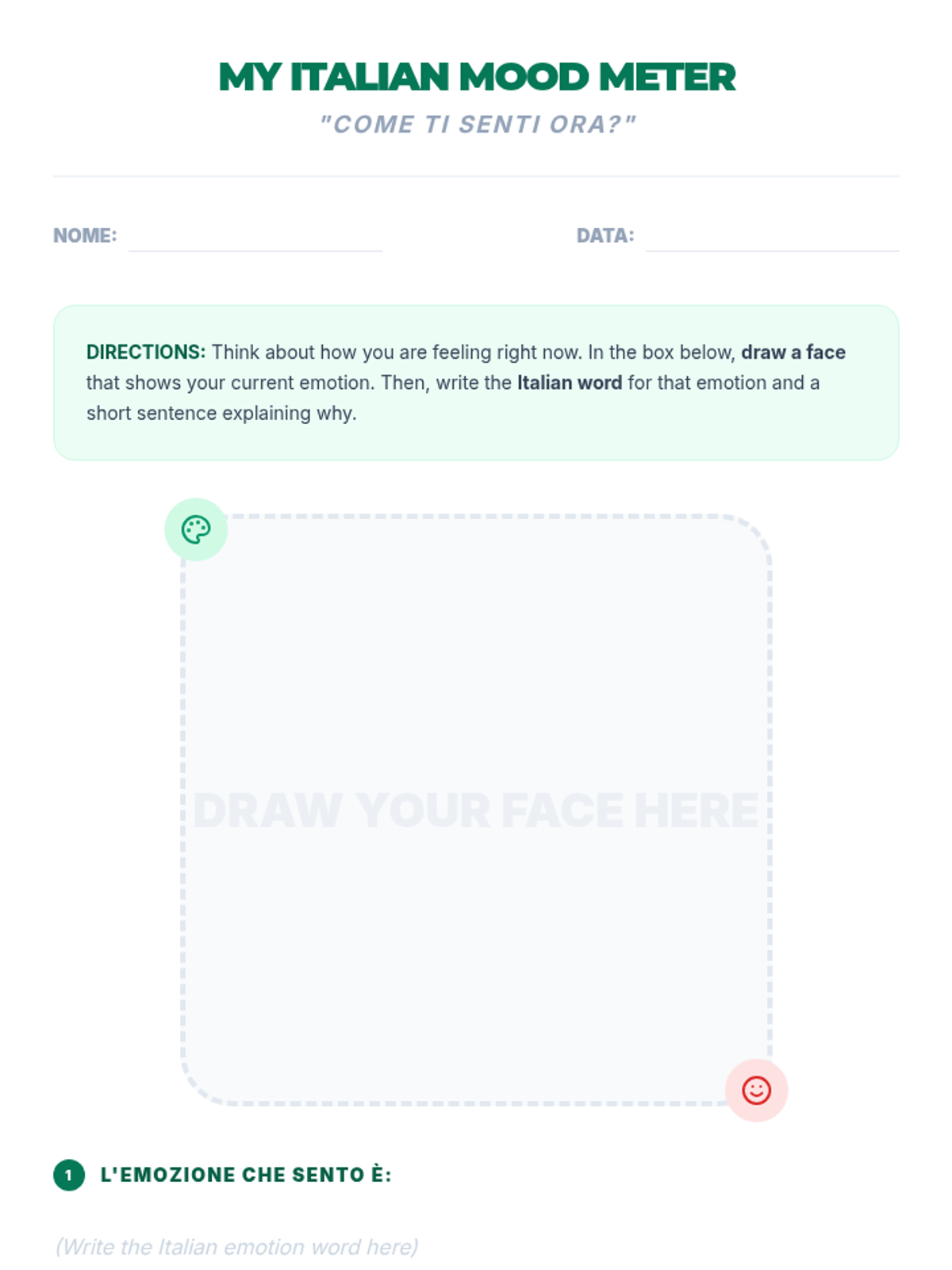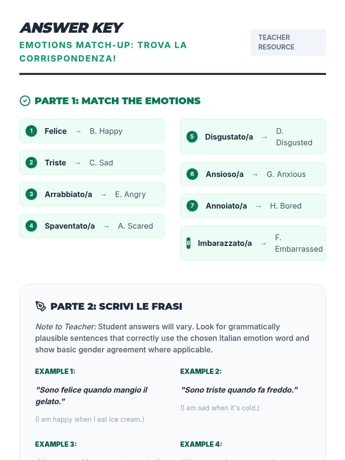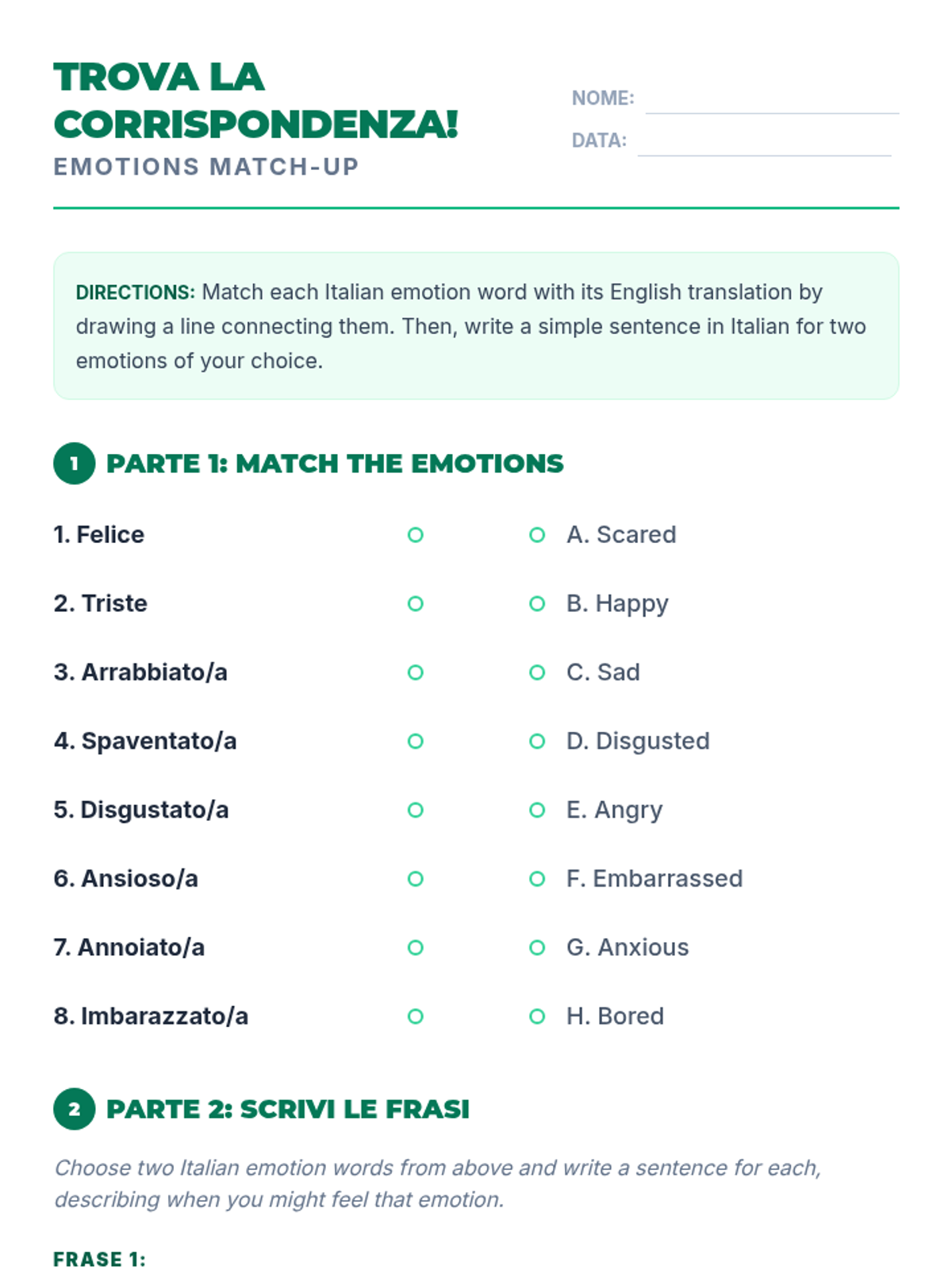 An introductory Italian 1 lesson focused on identifying and expressing common emotions through interactive slides, matching activities, and a charades game.
