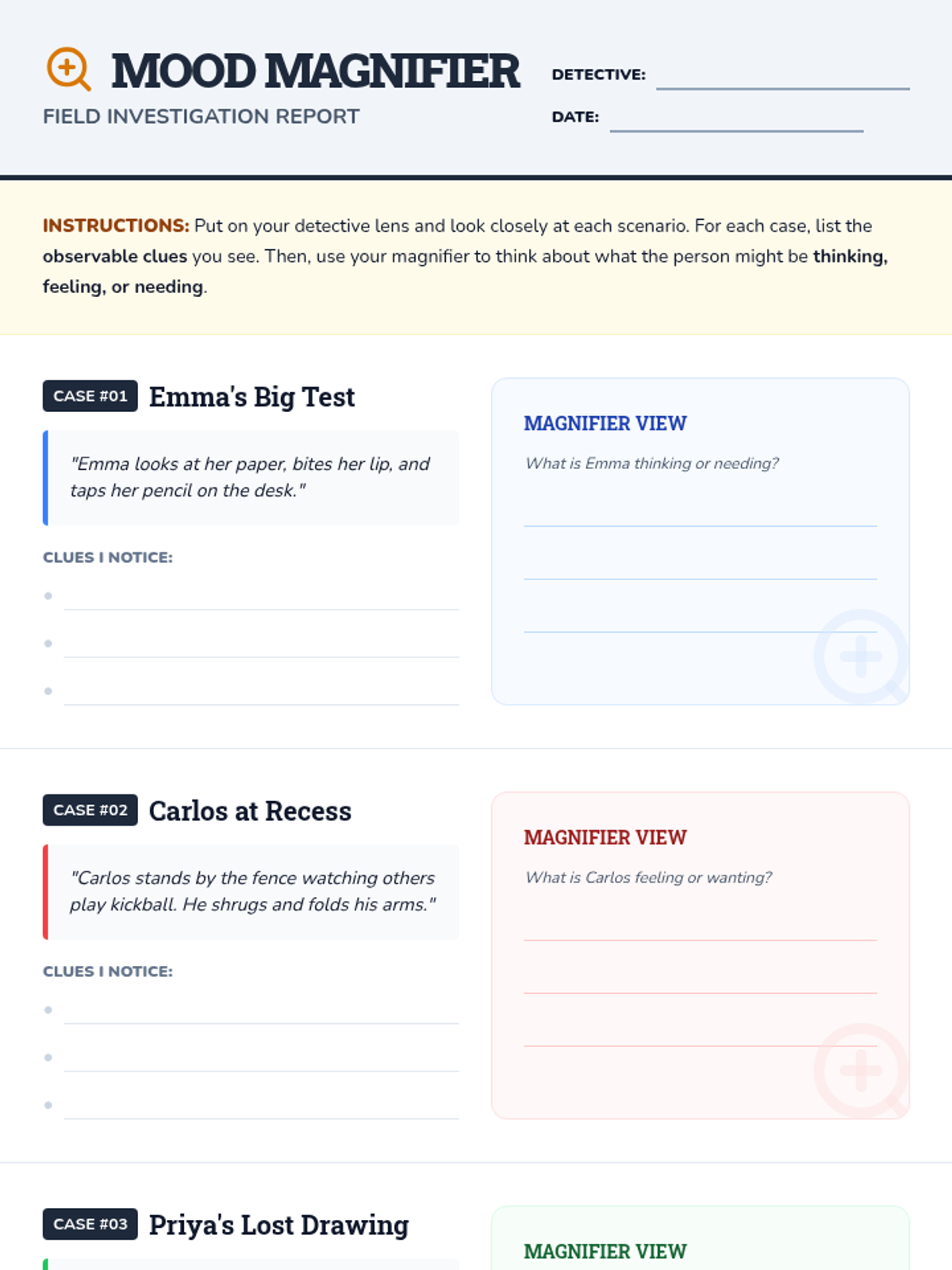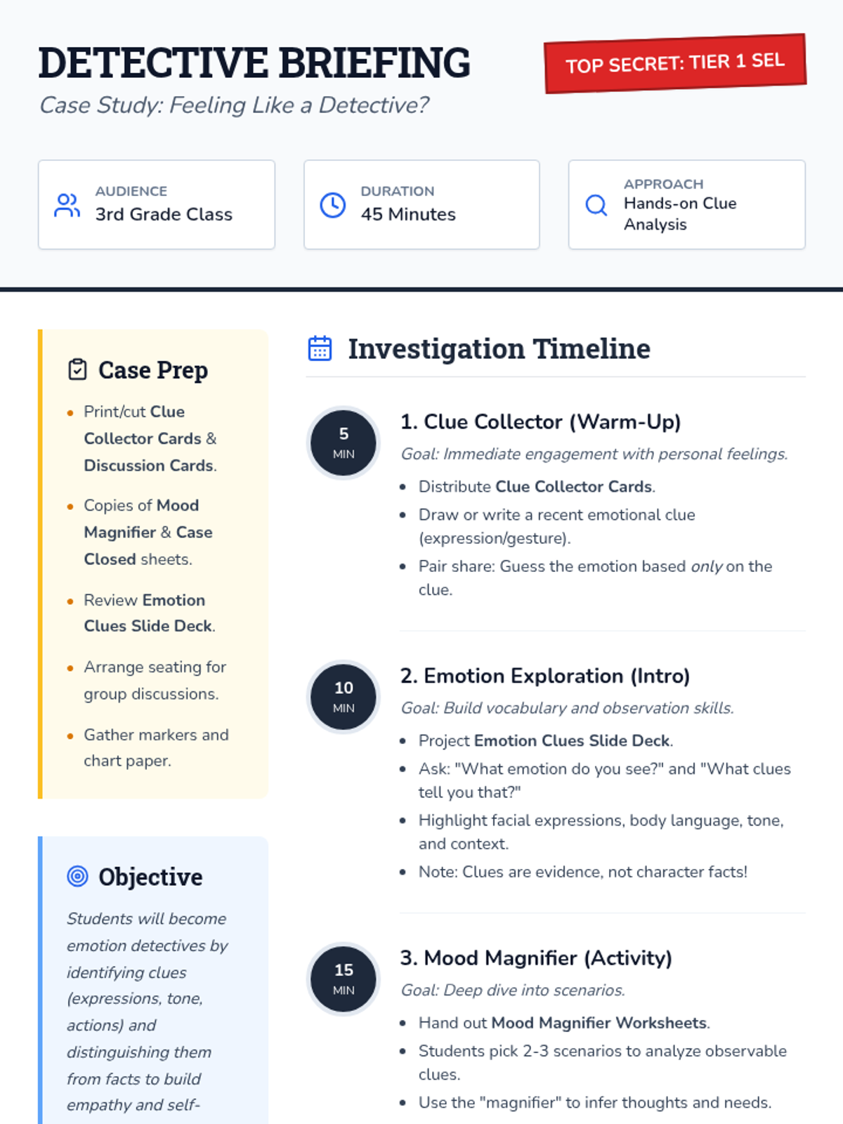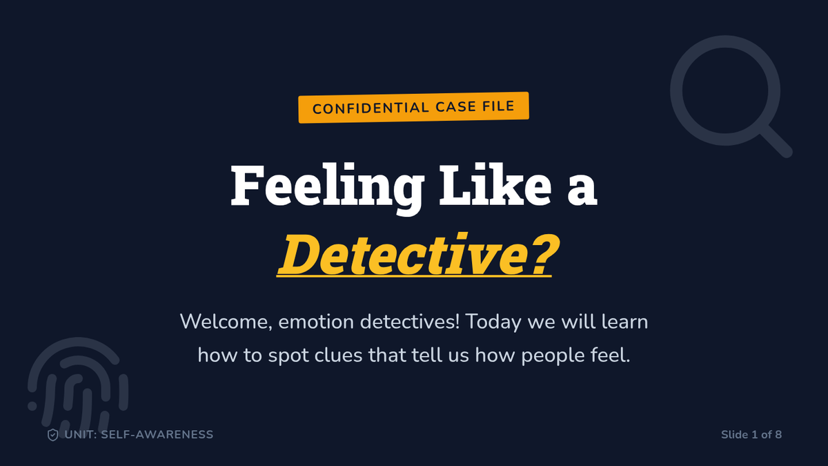 A 45-minute Tier 1 SEL lesson for 3rd graders focused on identifying and investigating emotions through observable clues like facial expressions and body language. Students build empathy and self-awareness by distinguishing emotional clues from objective facts.