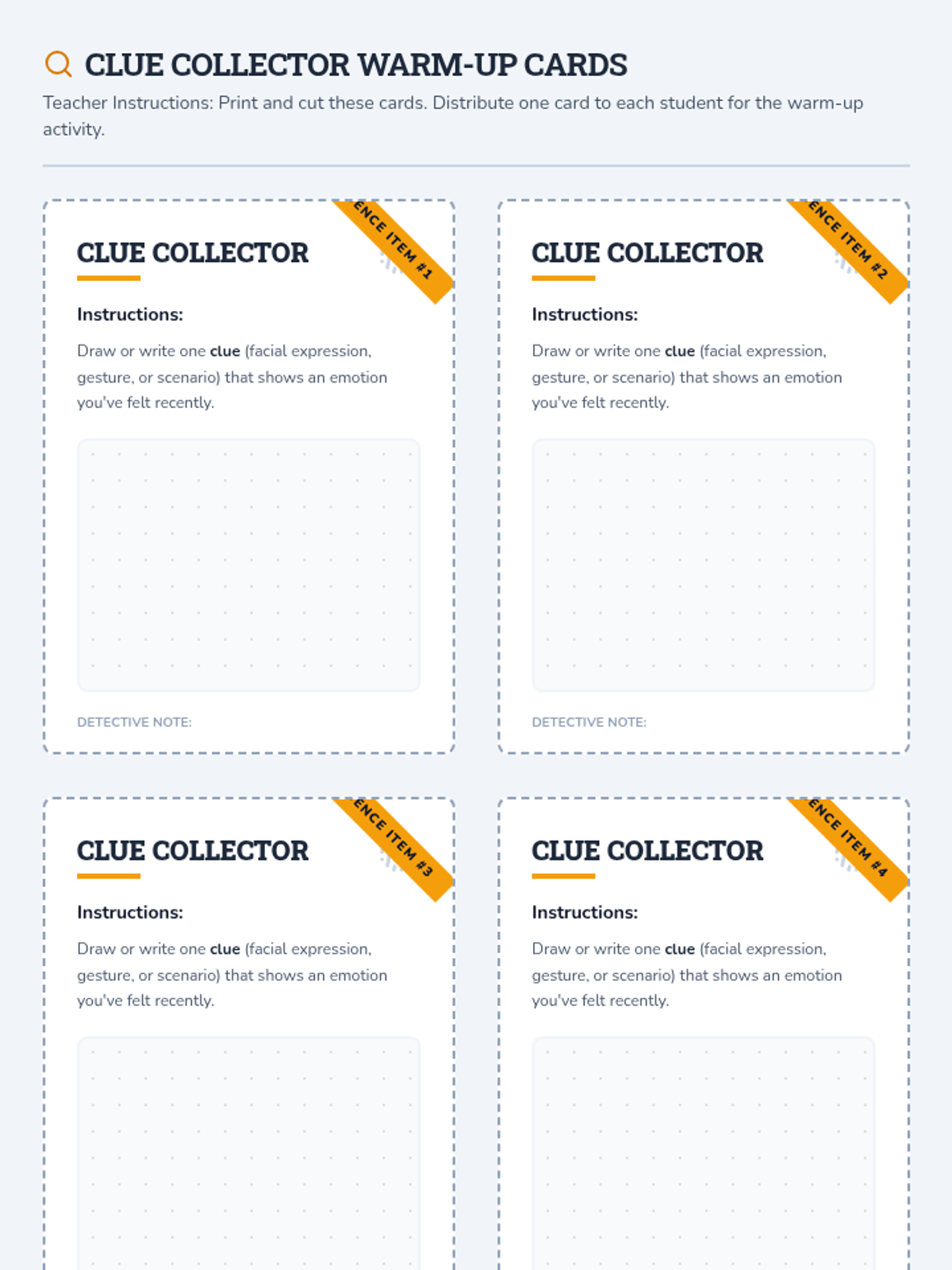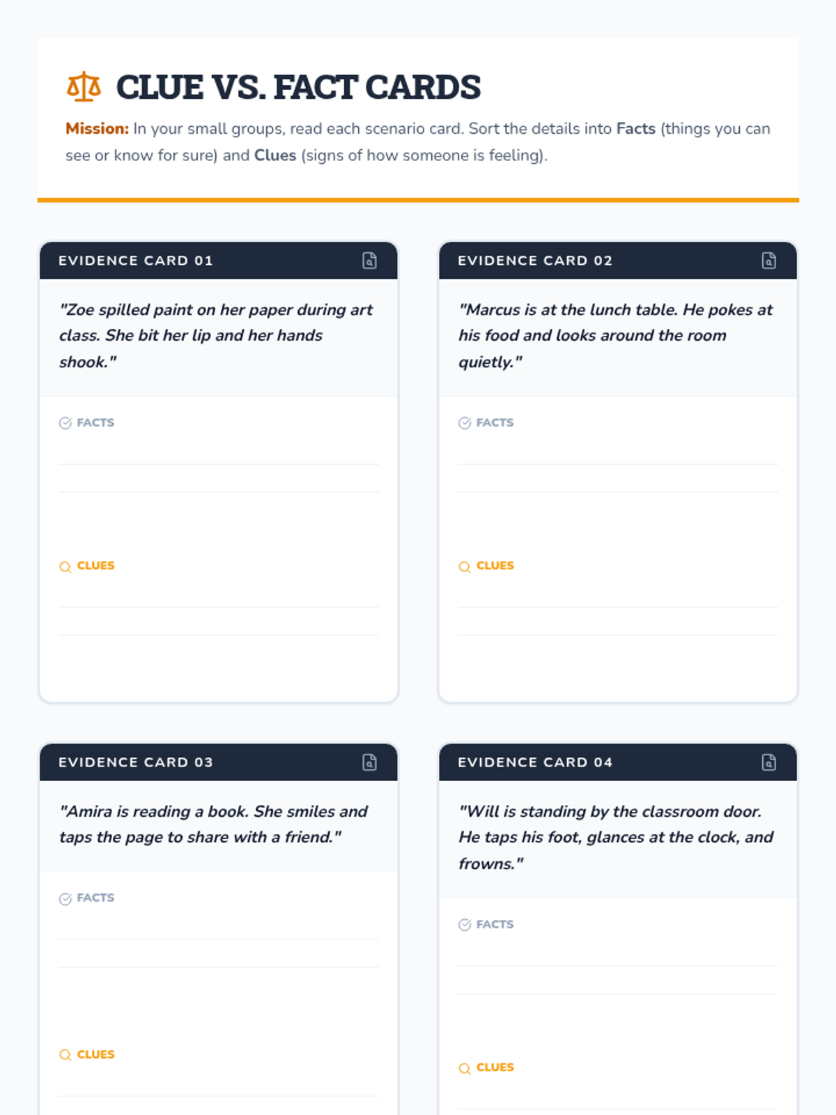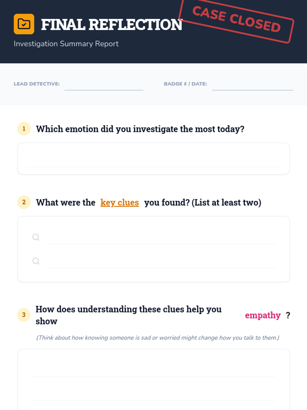 A 45-minute Tier 1 SEL lesson for 3rd graders focused on identifying and investigating emotions through observable clues like facial expressions and body language. Students build empathy and self-awareness by distinguishing emotional clues from objective facts.