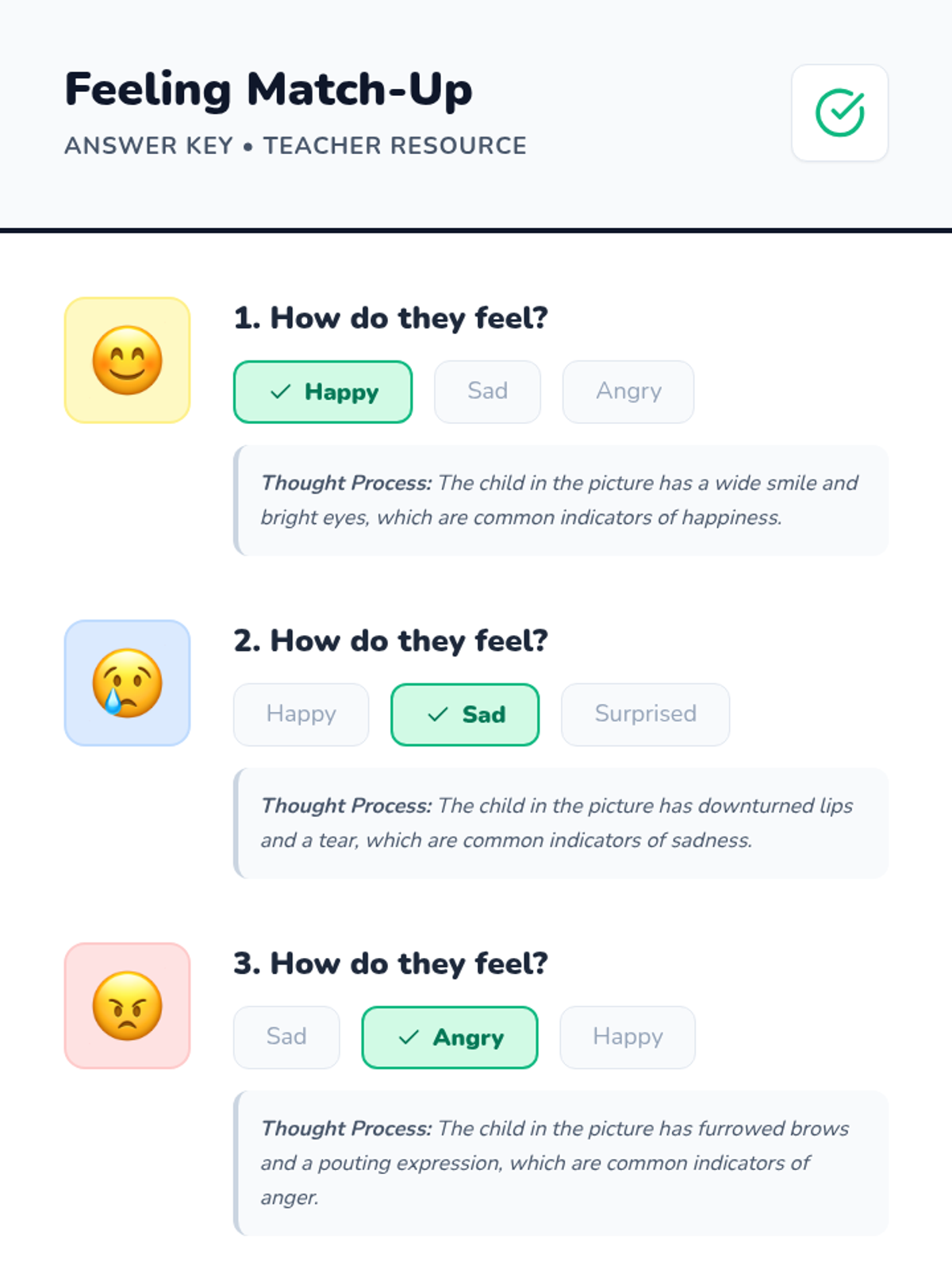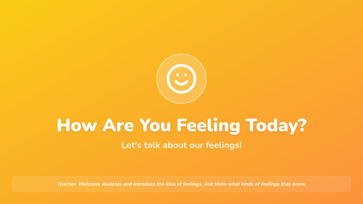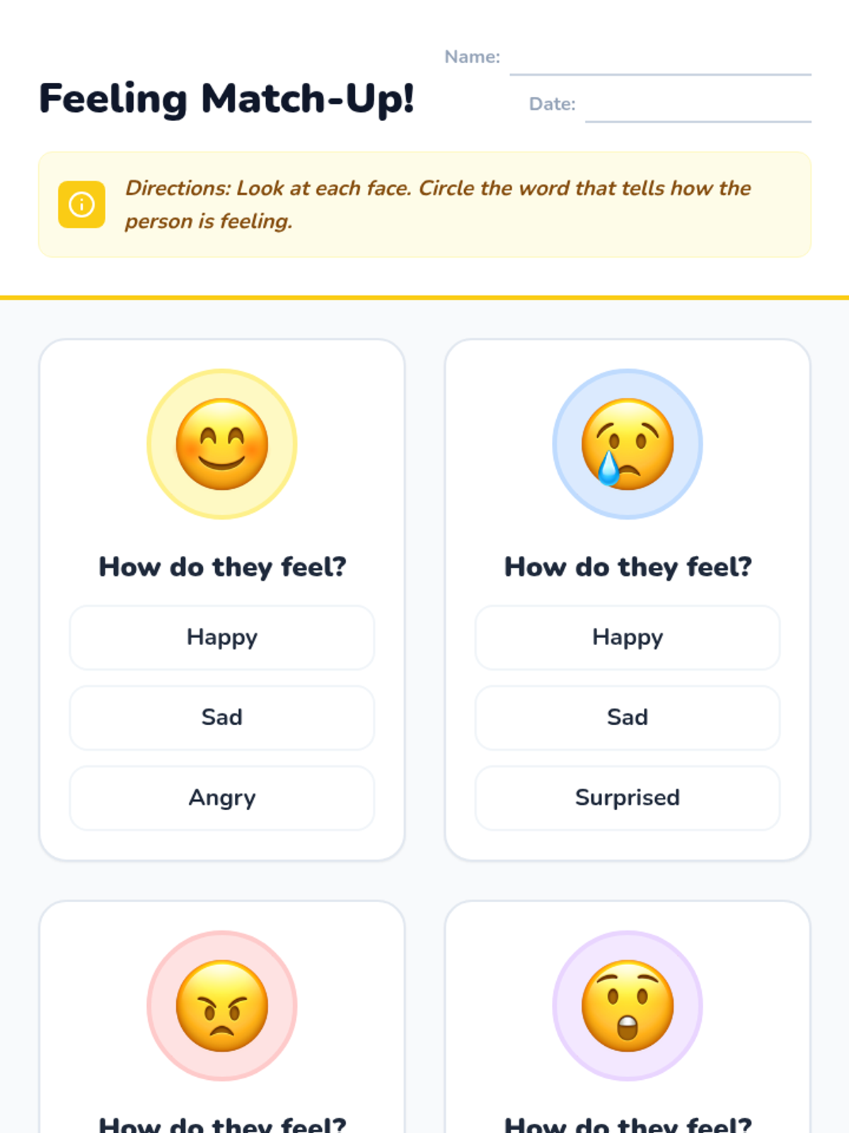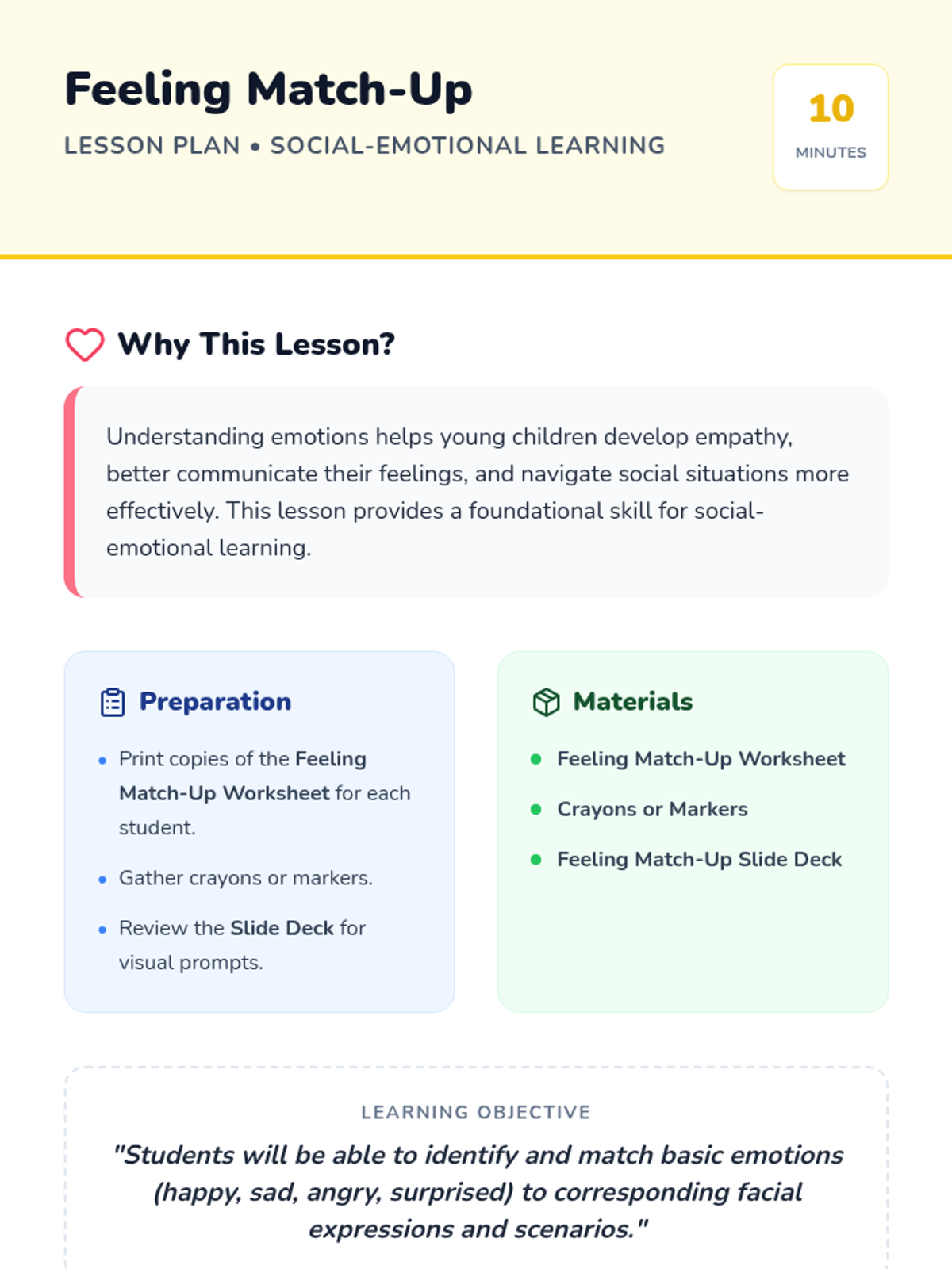 A social-emotional learning lesson for Pre-K students focused on identifying and matching four basic emotions: happy, sad, angry, and surprised. Students engage with a visual slide deck and complete a matching worksheet to build empathy and communication skills.