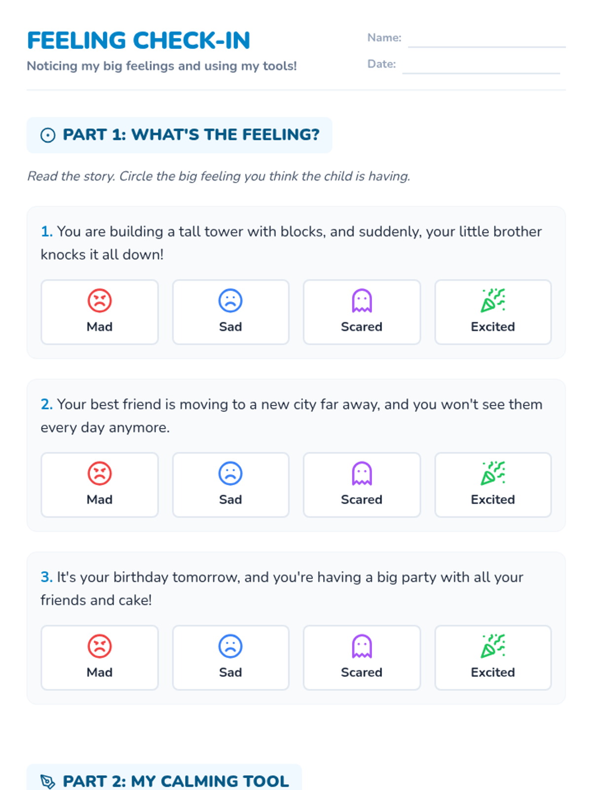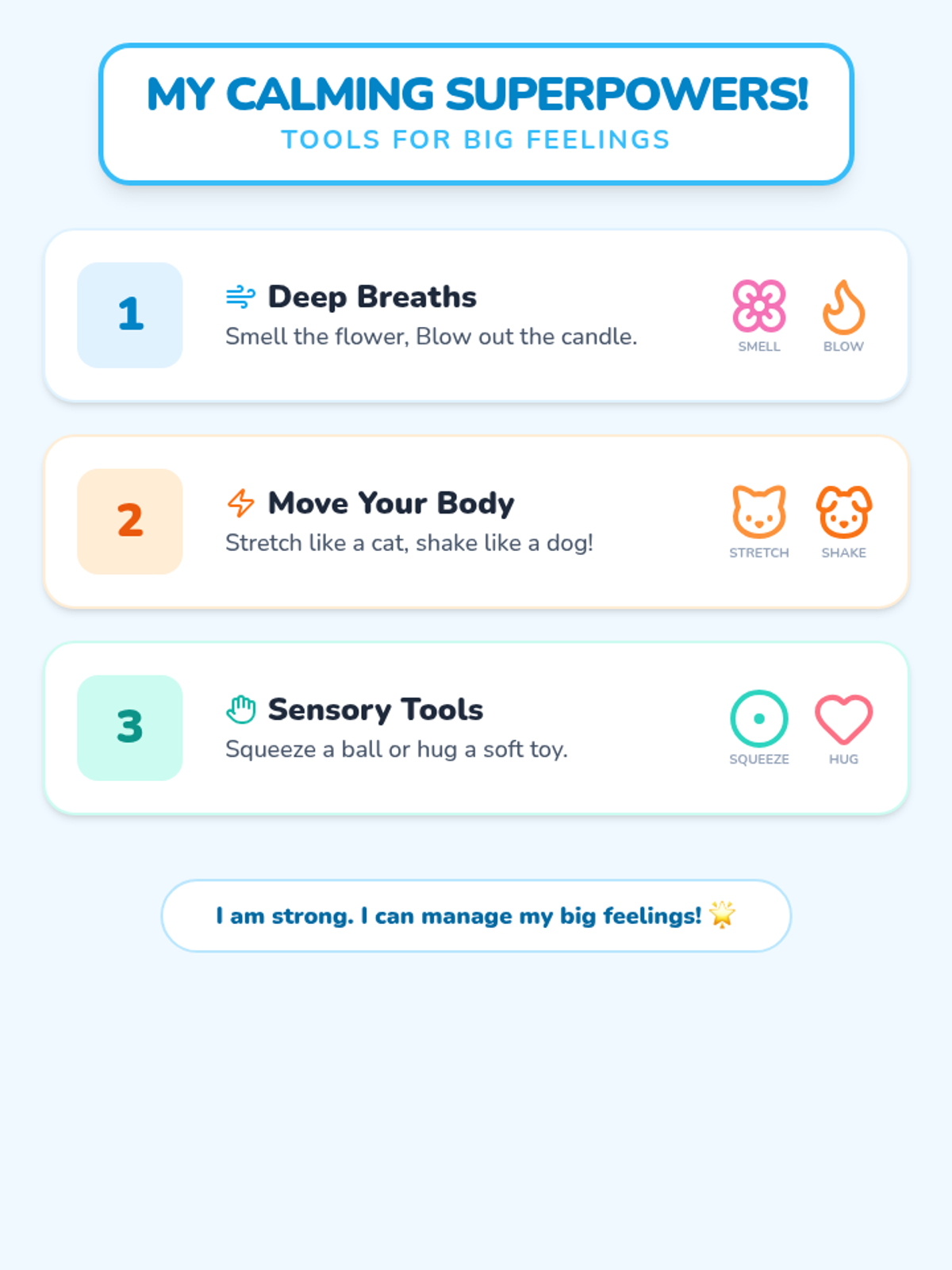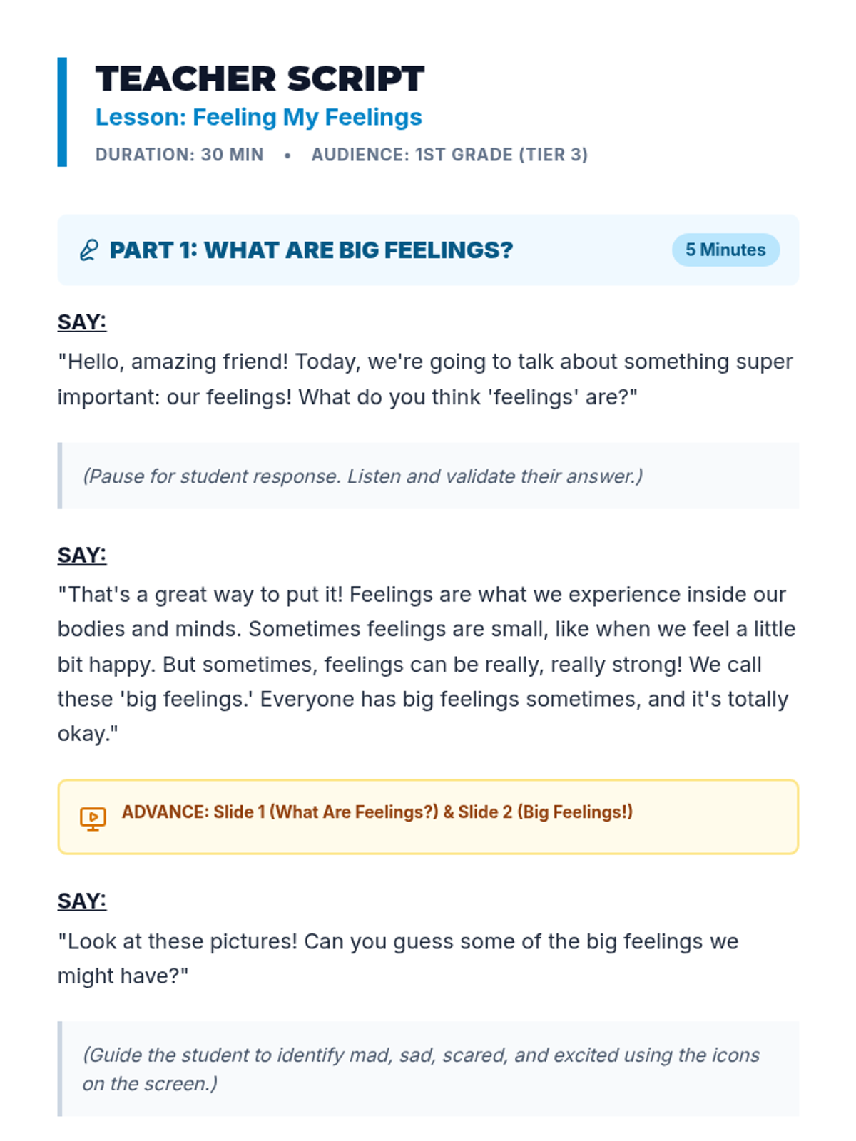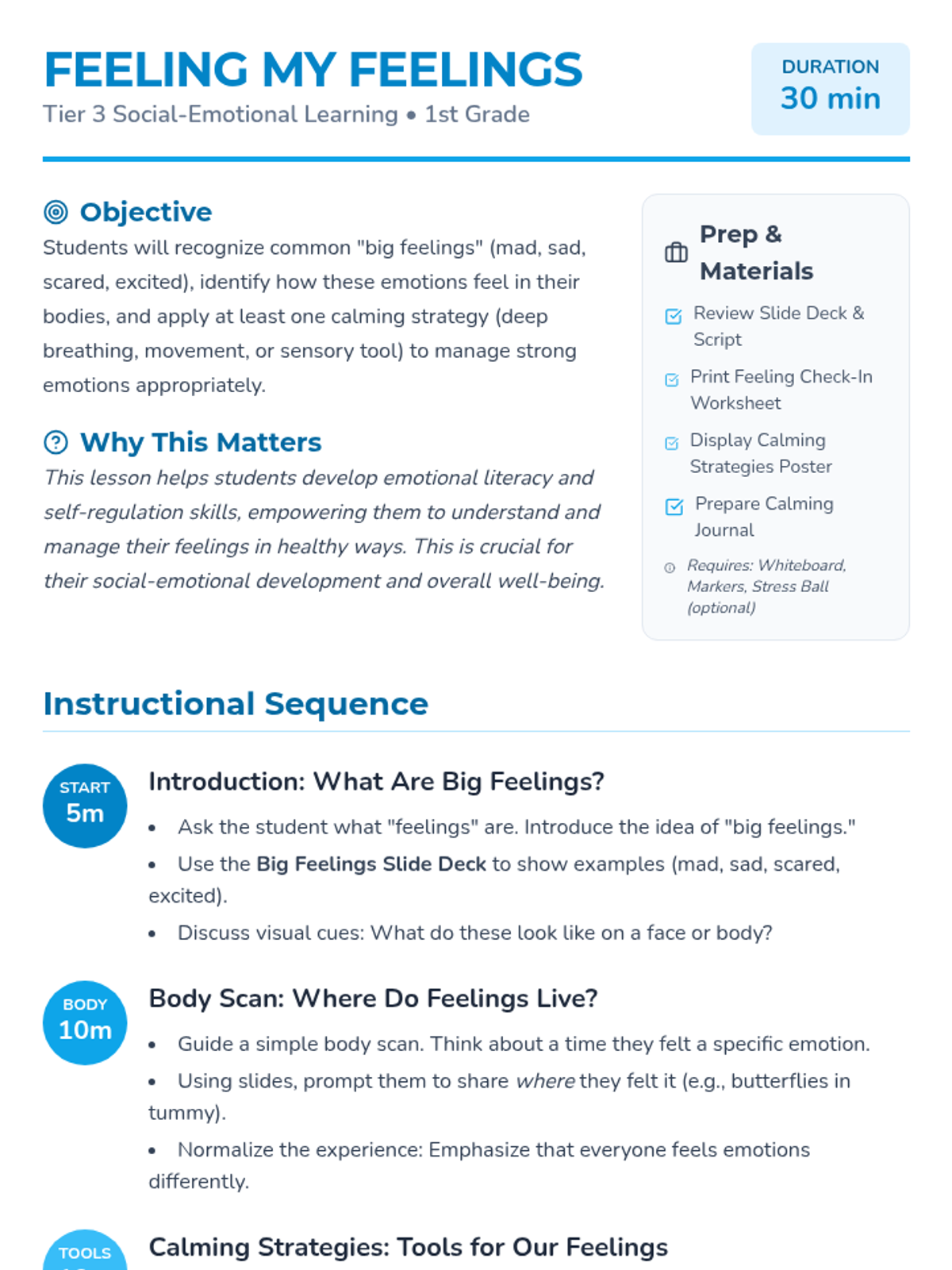 This 30-minute, Tier 3 lesson helps 1st Grade students recognize 'big feelings,' understand how these emotions manifest physically, and learn calming strategies like deep breathing and sensory tools.