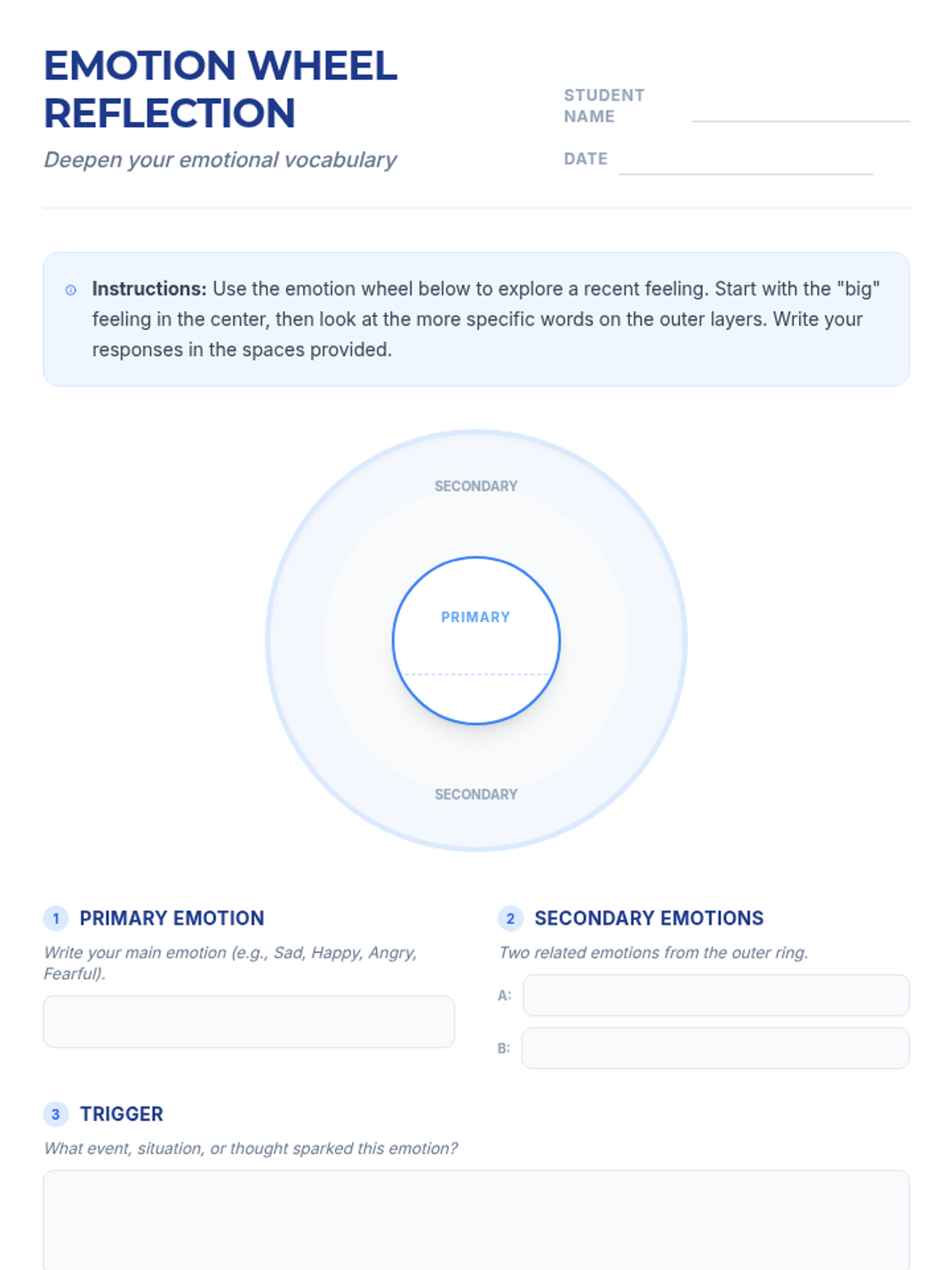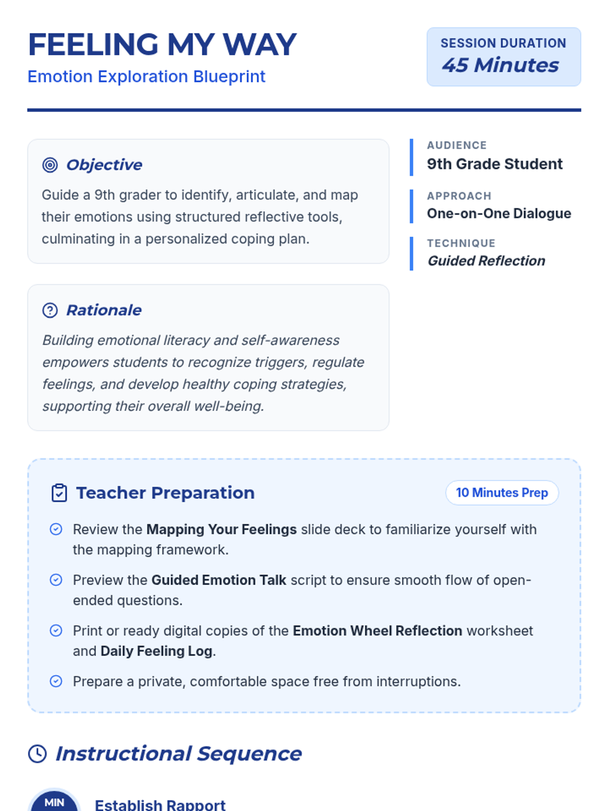 An individualized counseling plan for a 9th grader focusing on emotional literacy, mapping triggers to outcomes, and developing healthy coping strategies through one-on-one dialogue.