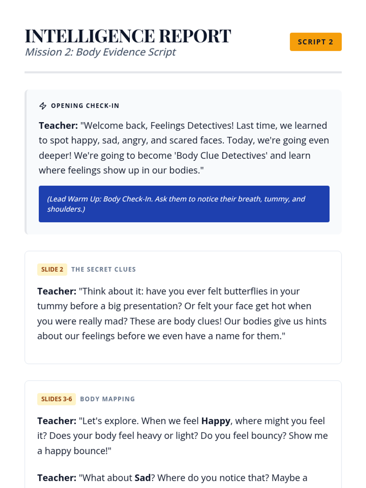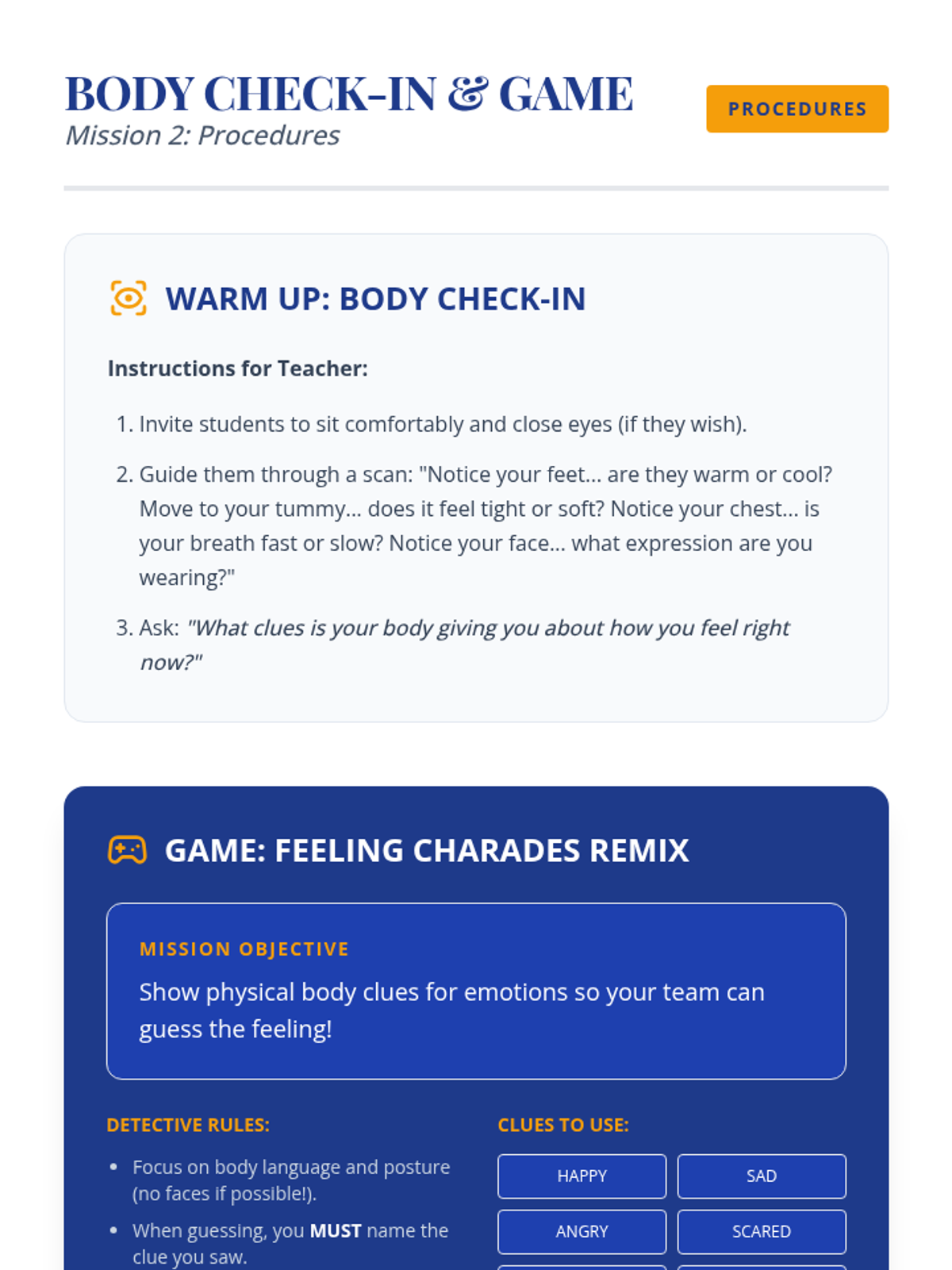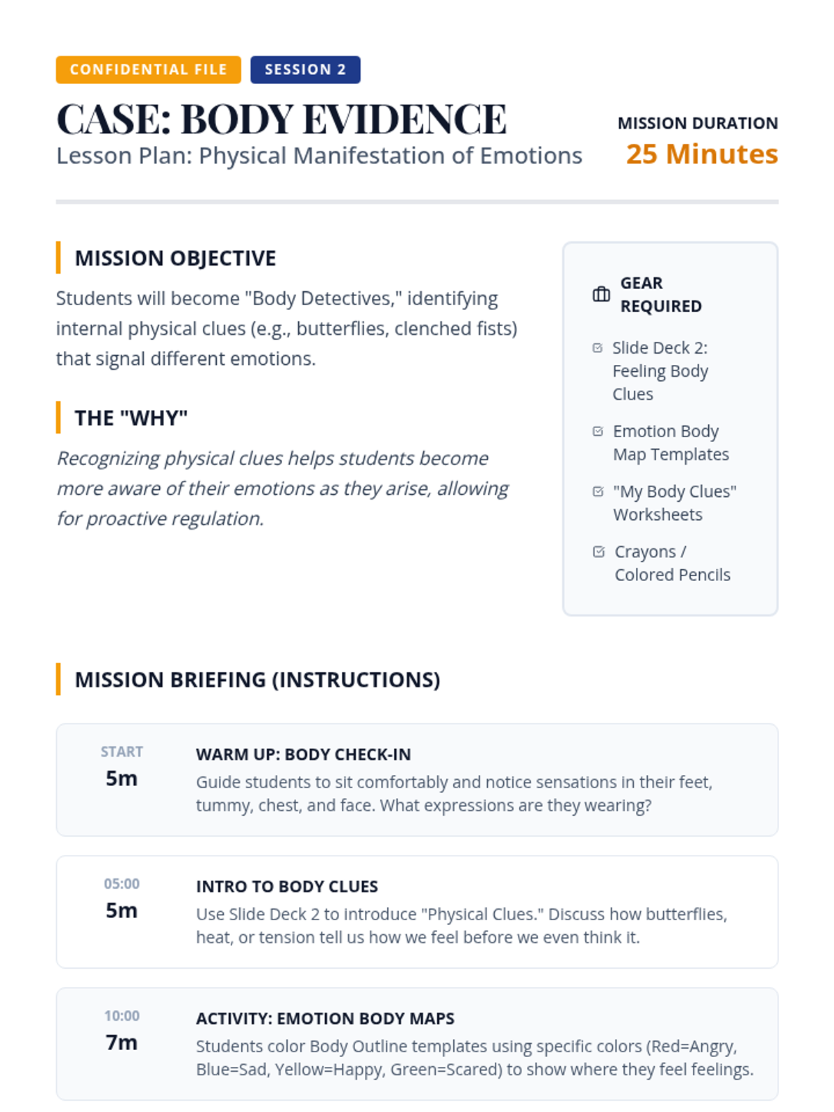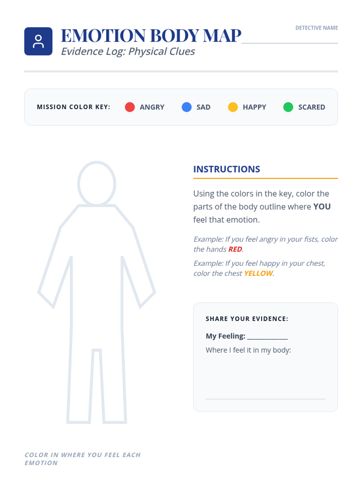 Students explore how emotions manifest physically in the body, learning to recognize internal "clues" for different feelings.