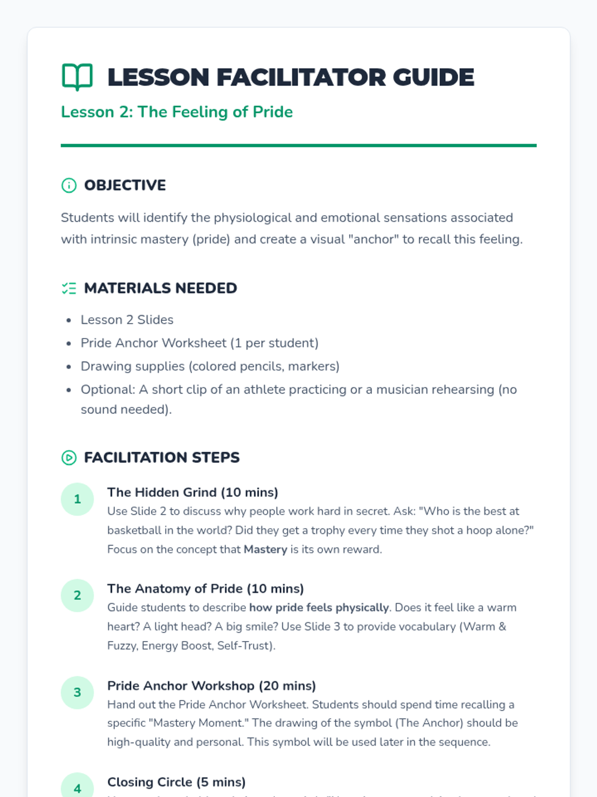 Students explore the internal feeling of pride and mastery by reflecting on accomplishments achieved without external rewards.