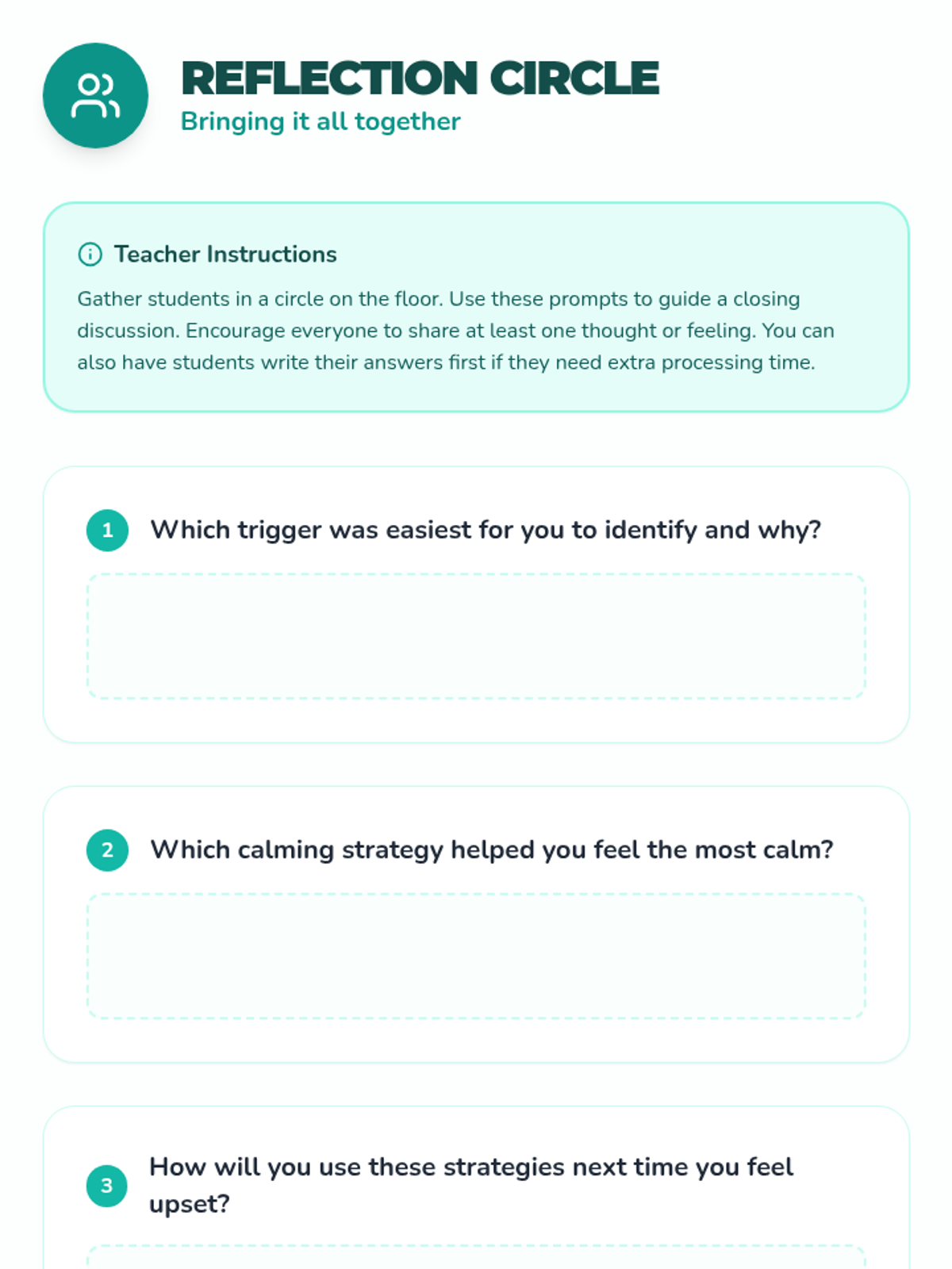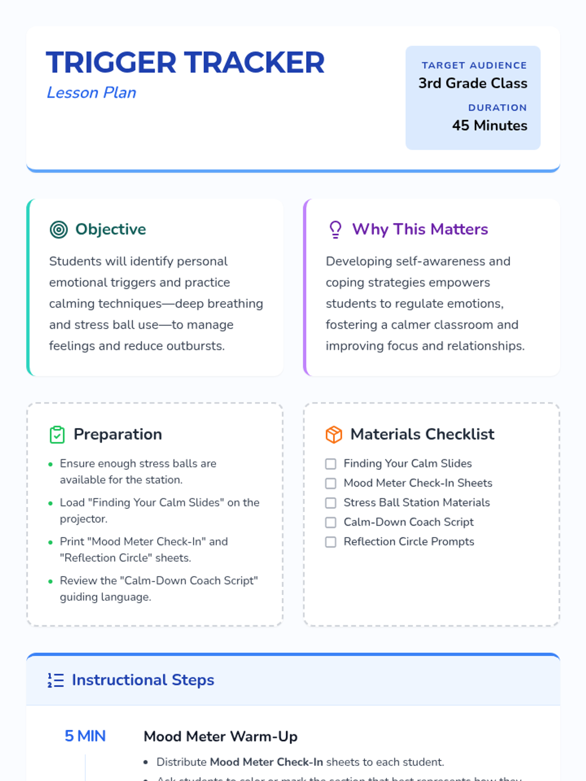 An engaging whole-class lesson that helps students identify triggers for outbursts and learn calming techniques, promoting a more peaceful classroom environment for 3rd graders. This Tier 1 behavioral support lesson spans one 45-minute session, equipping students with self-awareness and coping strategies.