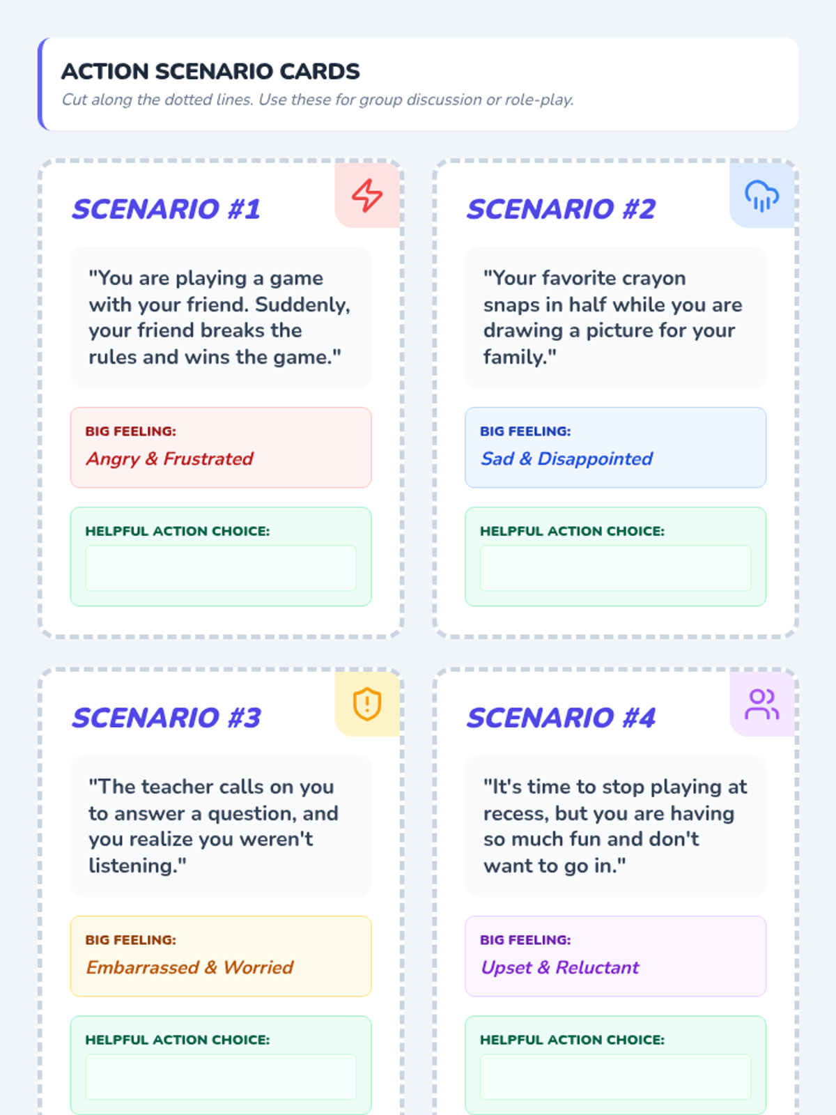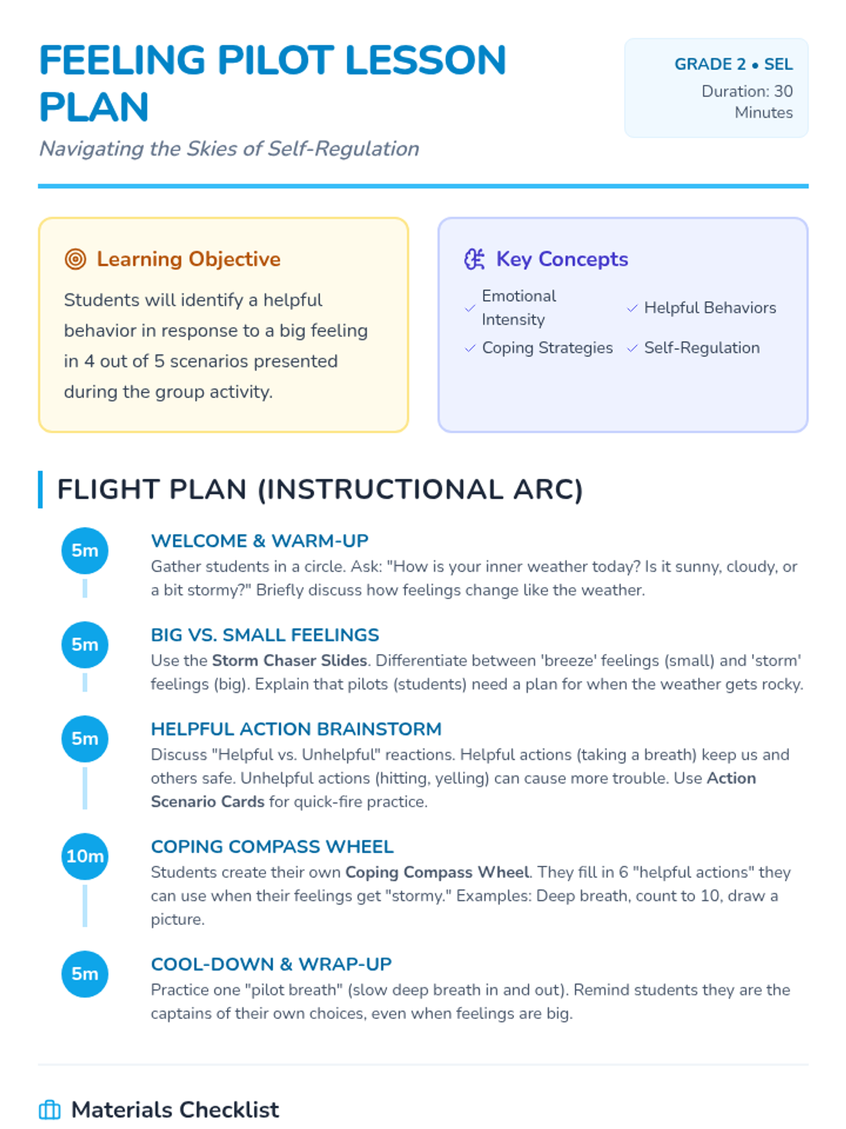 A social-emotional learning lesson for 2nd graders to help them identify and practice helpful behaviors when experiencing intense emotions. Through a weather-themed lens, students learn to navigate 'big feelings' and build a personal 'Coping Compass' for self-regulation.