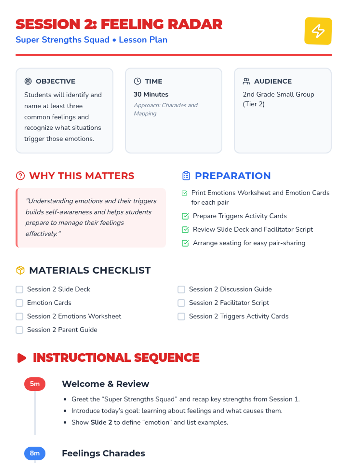A social-emotional learning lesson designed to help students identify 'big feelings' and practice safe replacement behaviors for physical aggression. Includes a narrative story, situational practice, and a personalized reflection plan.