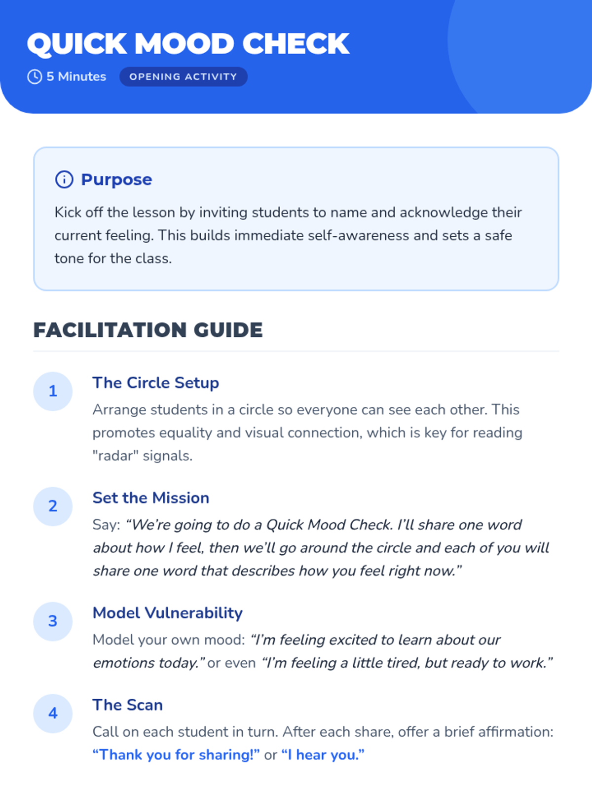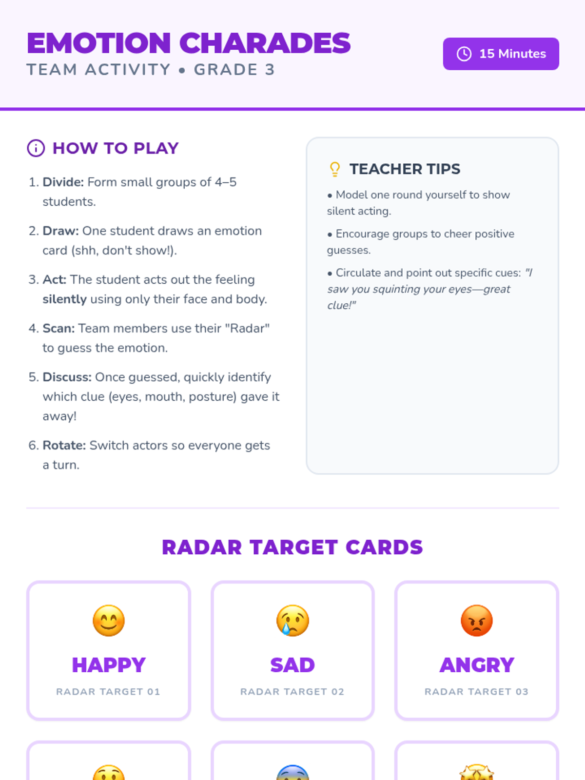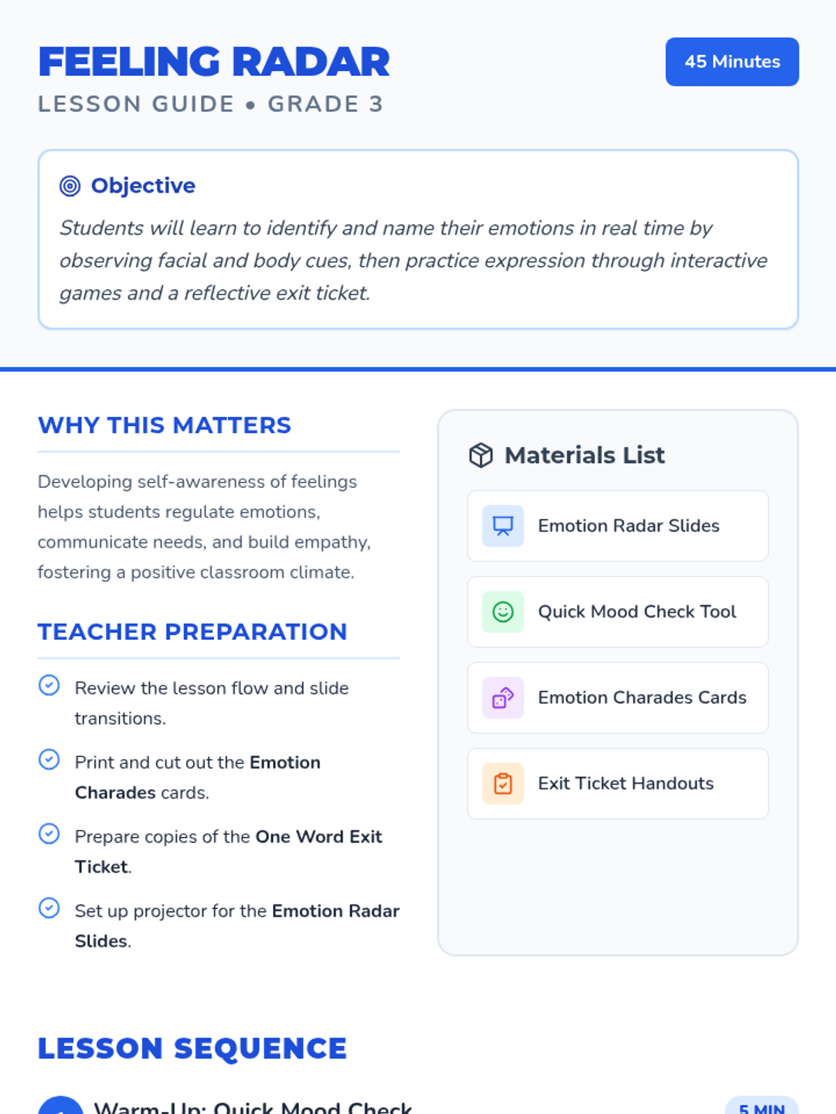 An interactive 45-minute lesson where 3rd graders learn to spot and name emotions using facial and body cues, building foundational self-awareness.