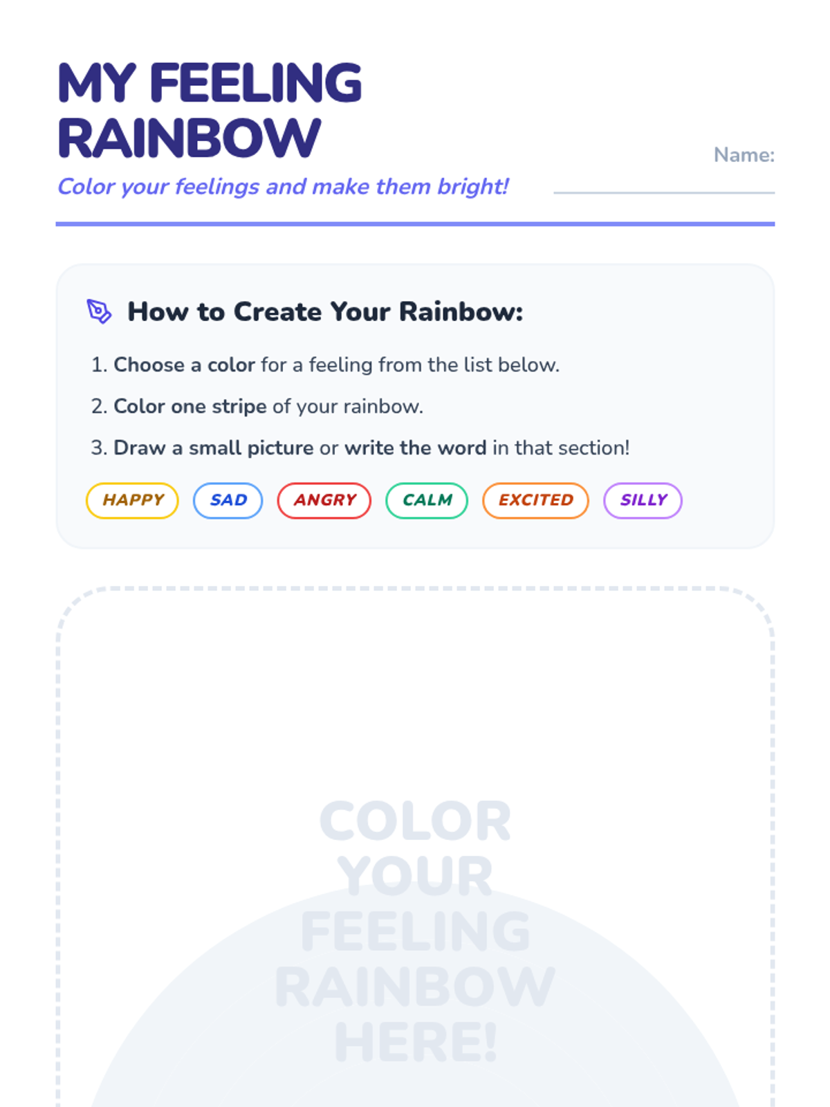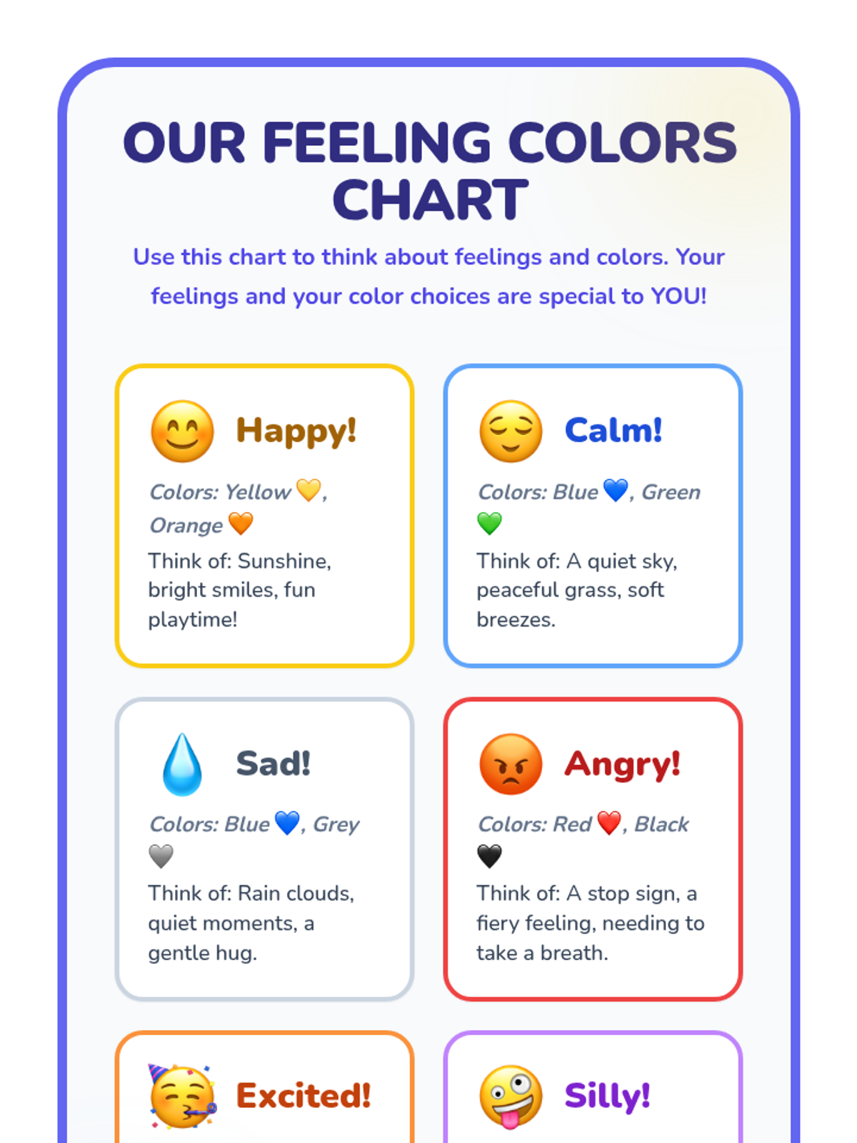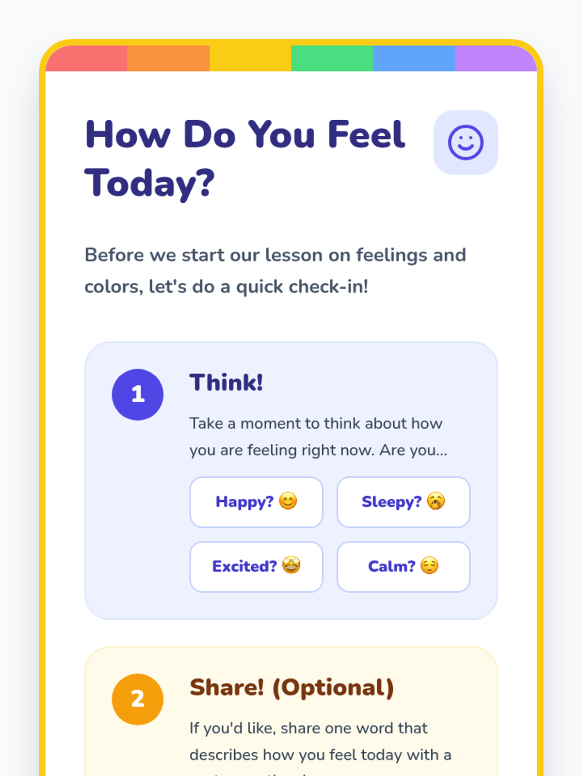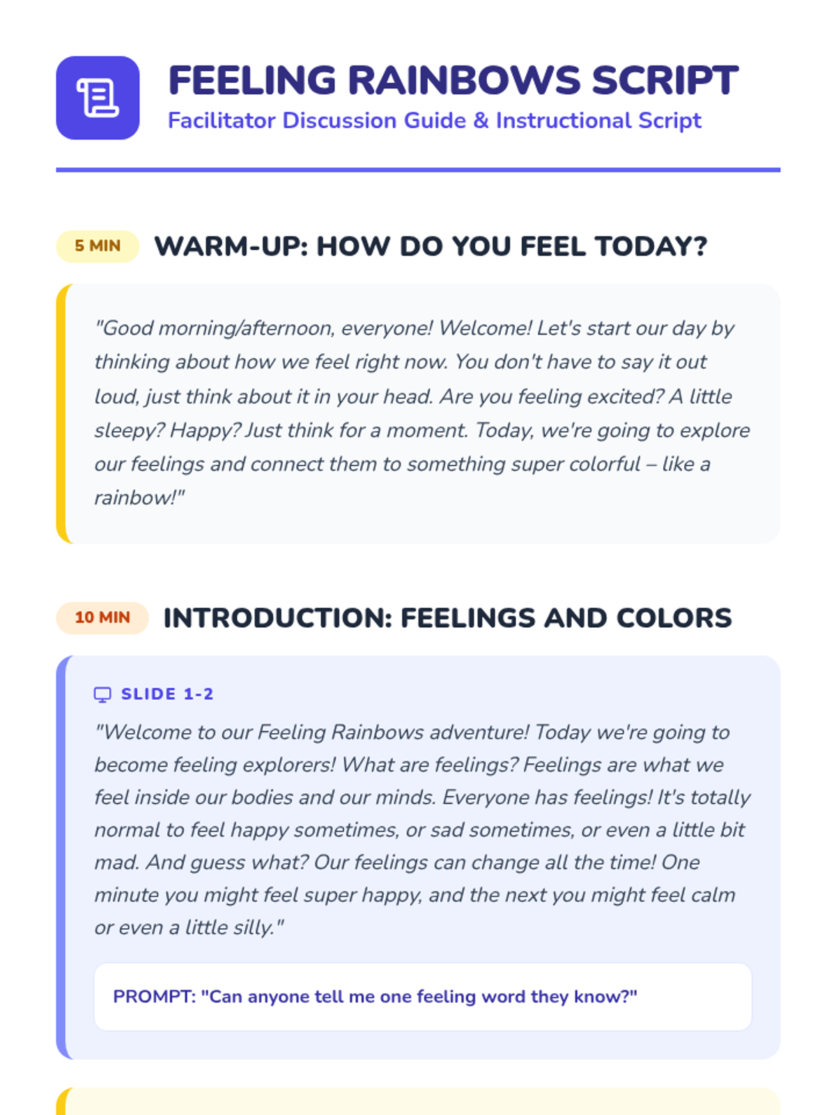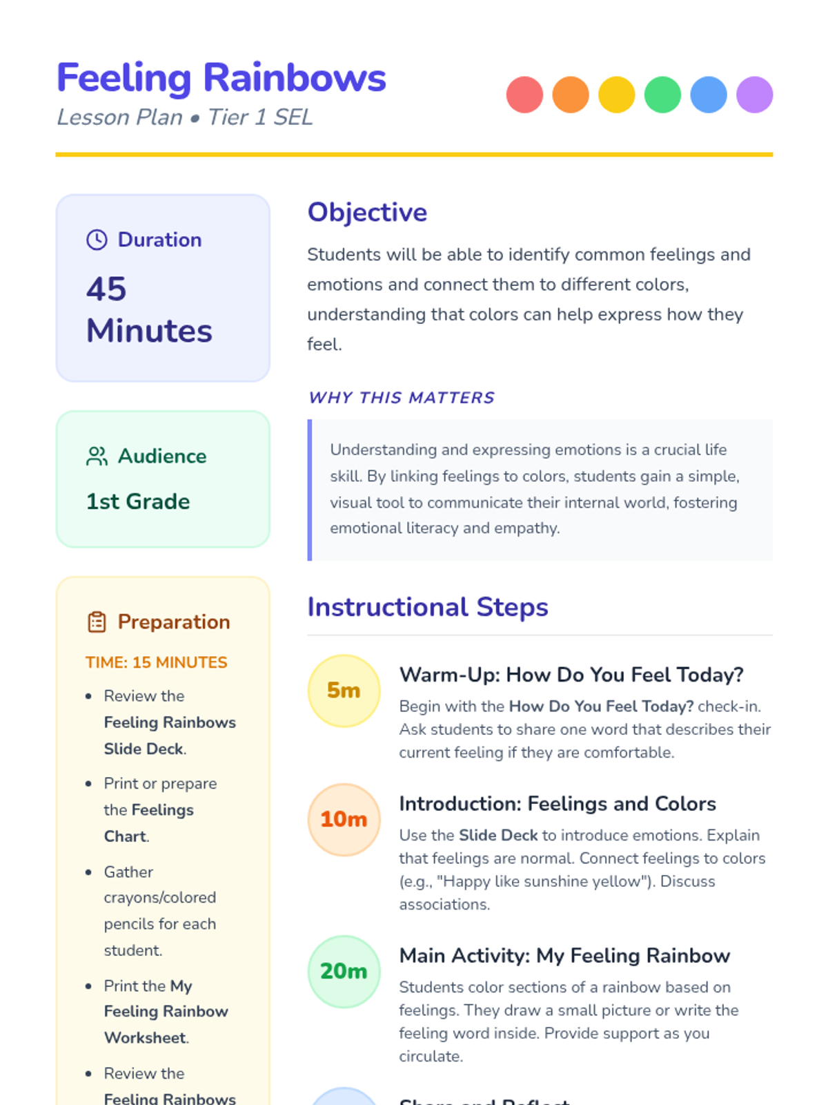 A 45-minute Tier 1 SEL lesson for 1st graders that uses colors to help students identify and express their emotions through the metaphor of a rainbow.