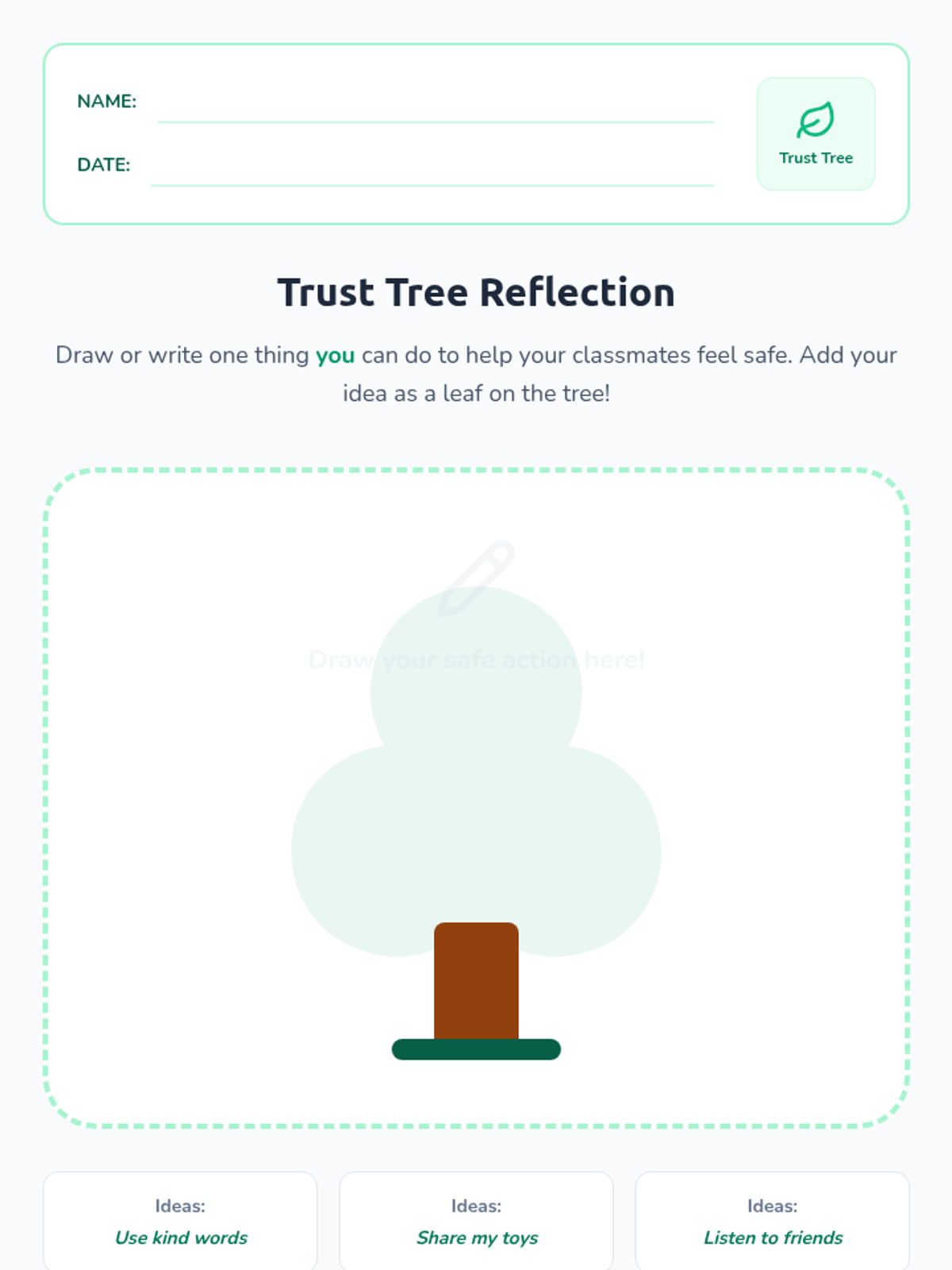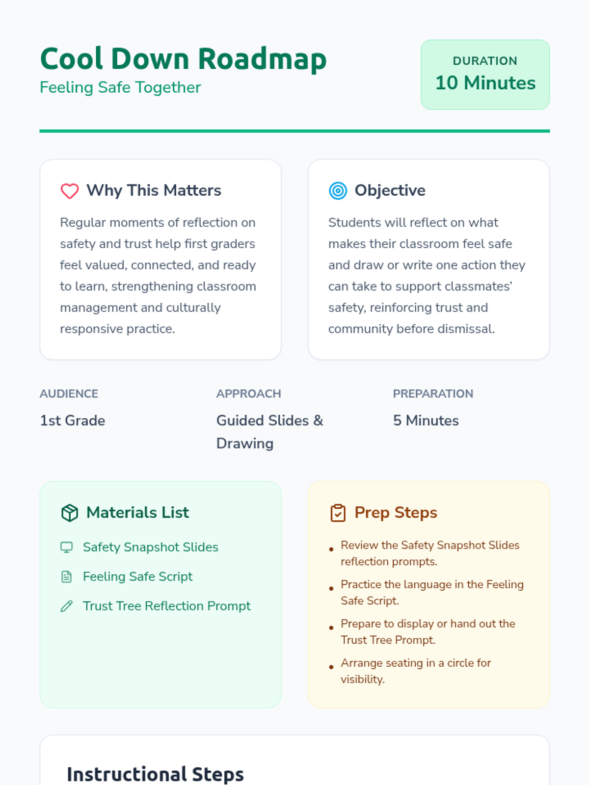 A quick 10-minute cool-down session for 1st graders to reflect on classroom safety and trust, reinforcing a positive school climate through guided discussion and a reflective drawing activity.