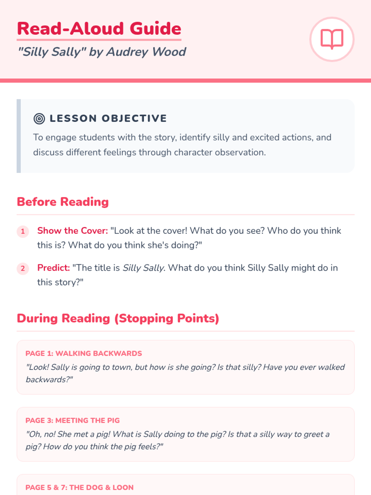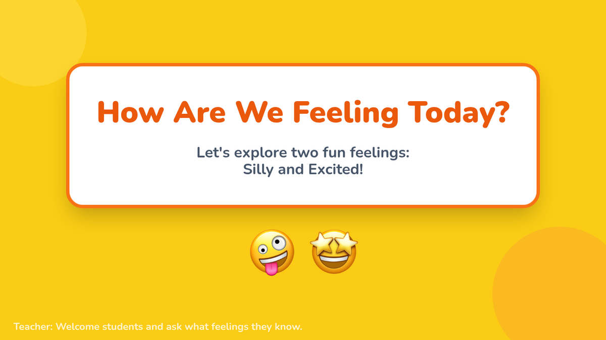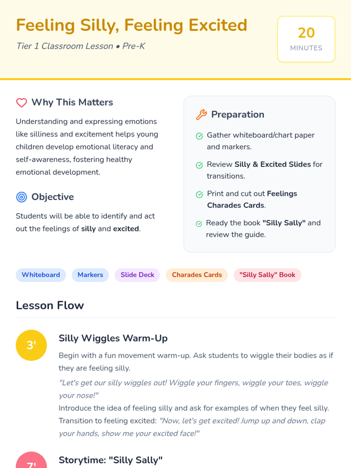 A 20-minute Pre-K lesson focused on identifying and expressing 'silly' and 'excited' feelings through movement, a read-aloud story, and interactive games.