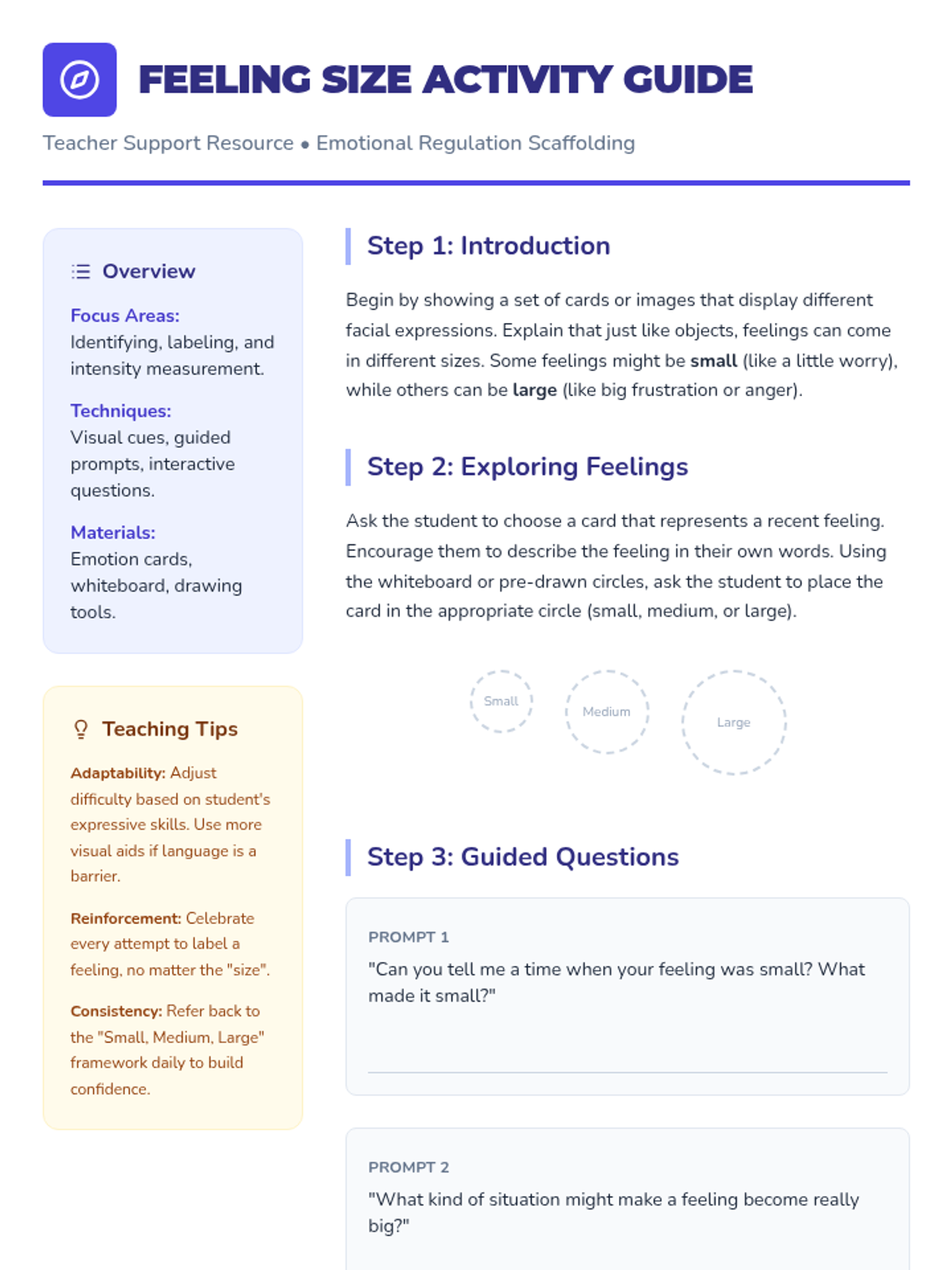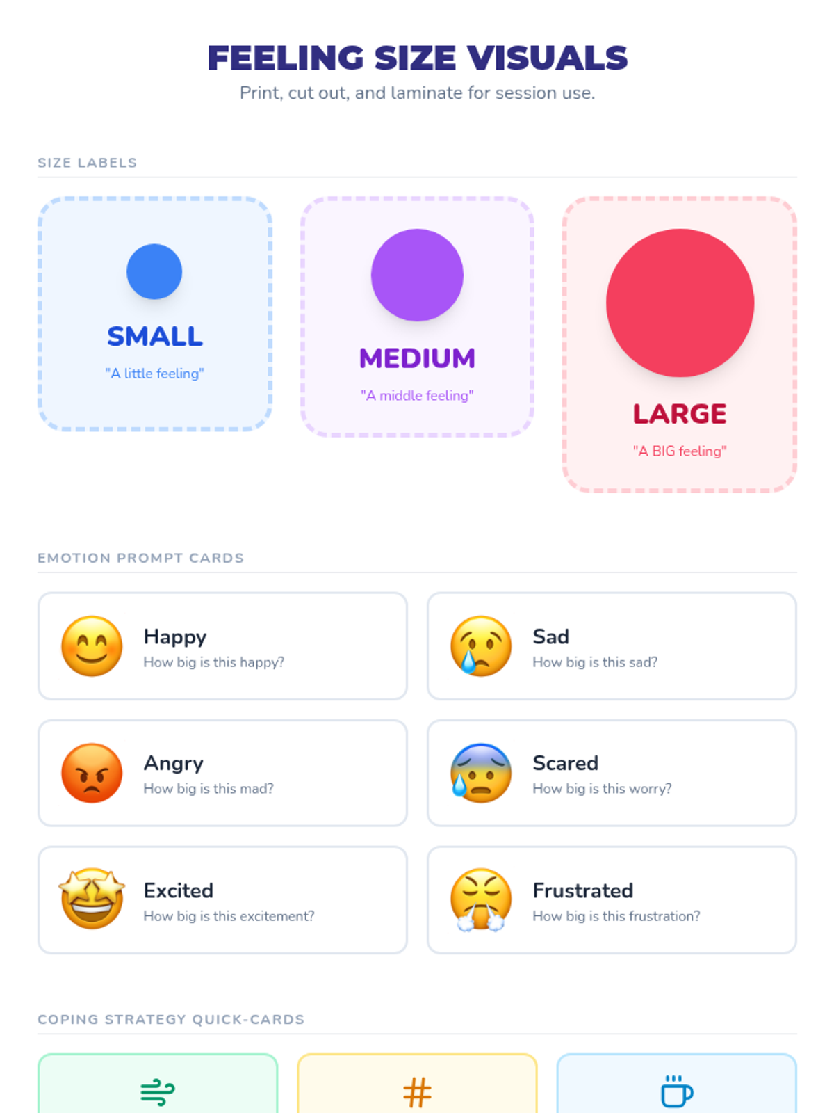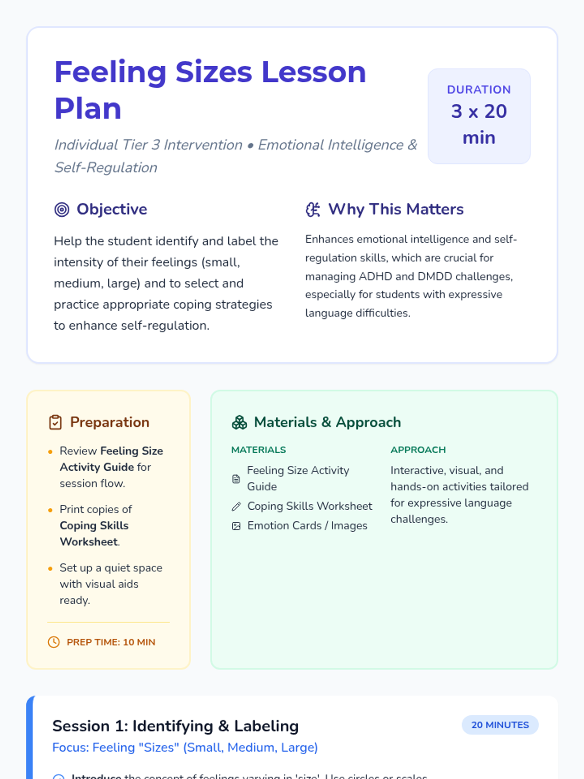 A Tier 3 intervention lesson spanning three sessions to help students identify the intensity of their emotions and apply appropriate coping strategies. This lesson uses visual aids and expressive language supports to build self-regulation skills.