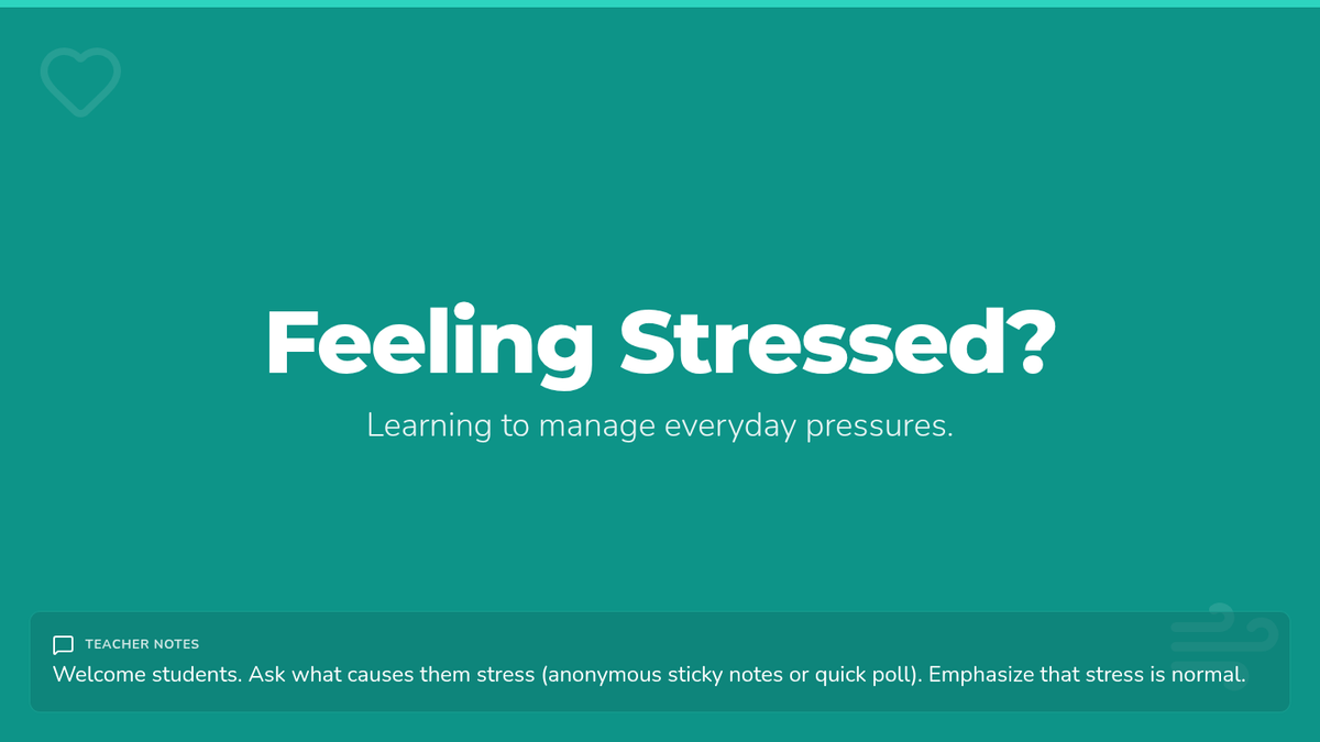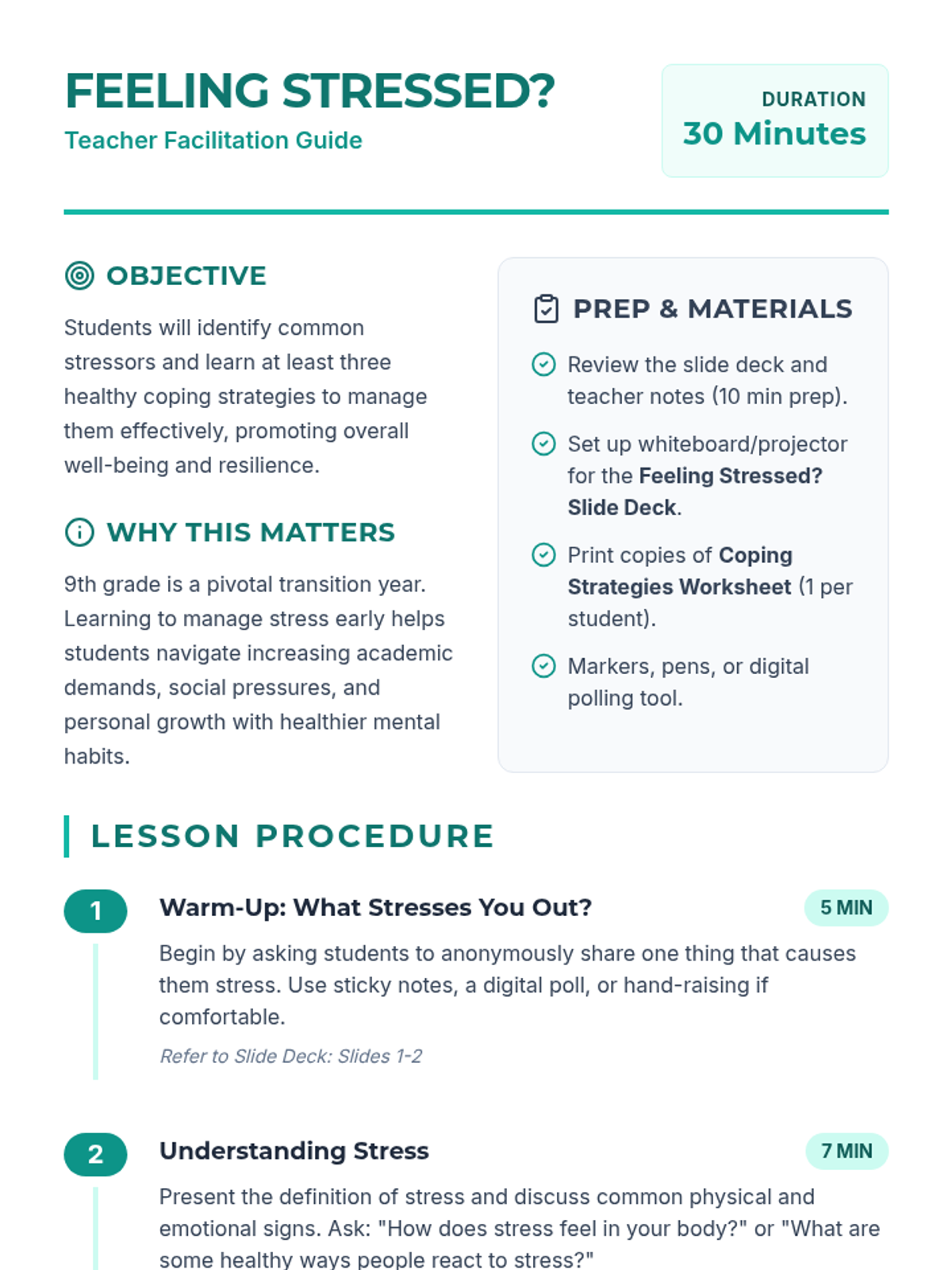 This 30-minute lesson for 9th-grade students explores common stressors and introduces practical, healthy coping mechanisms. Students will identify their own stressors and develop a personal toolkit of strategies to manage academic and social pressures.