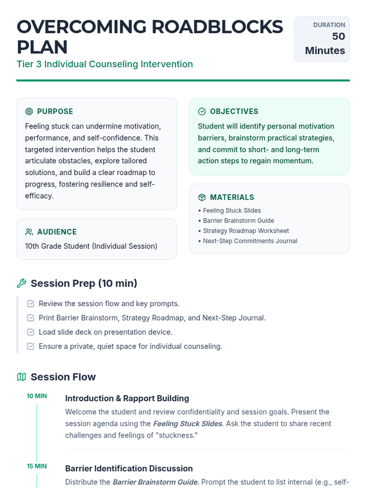 A Tier 3 individual counseling session for 10th graders to identify motivation barriers and develop a concrete action plan for forward momentum.