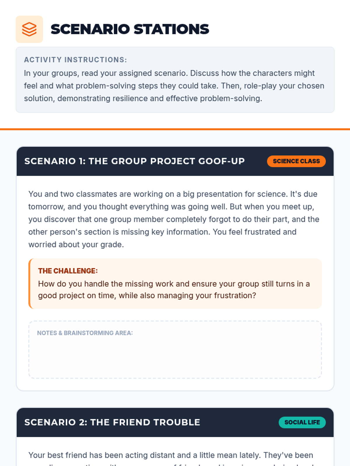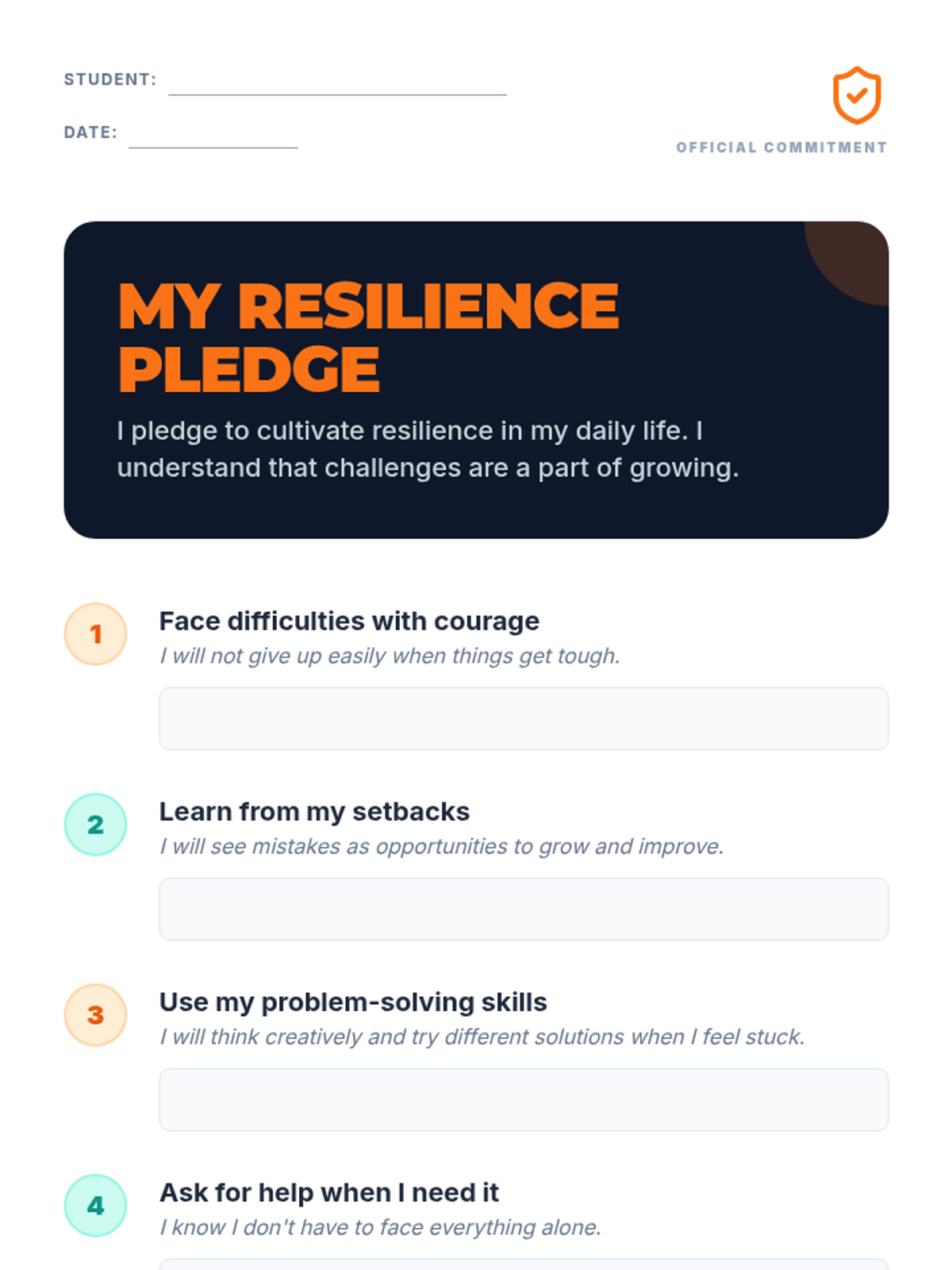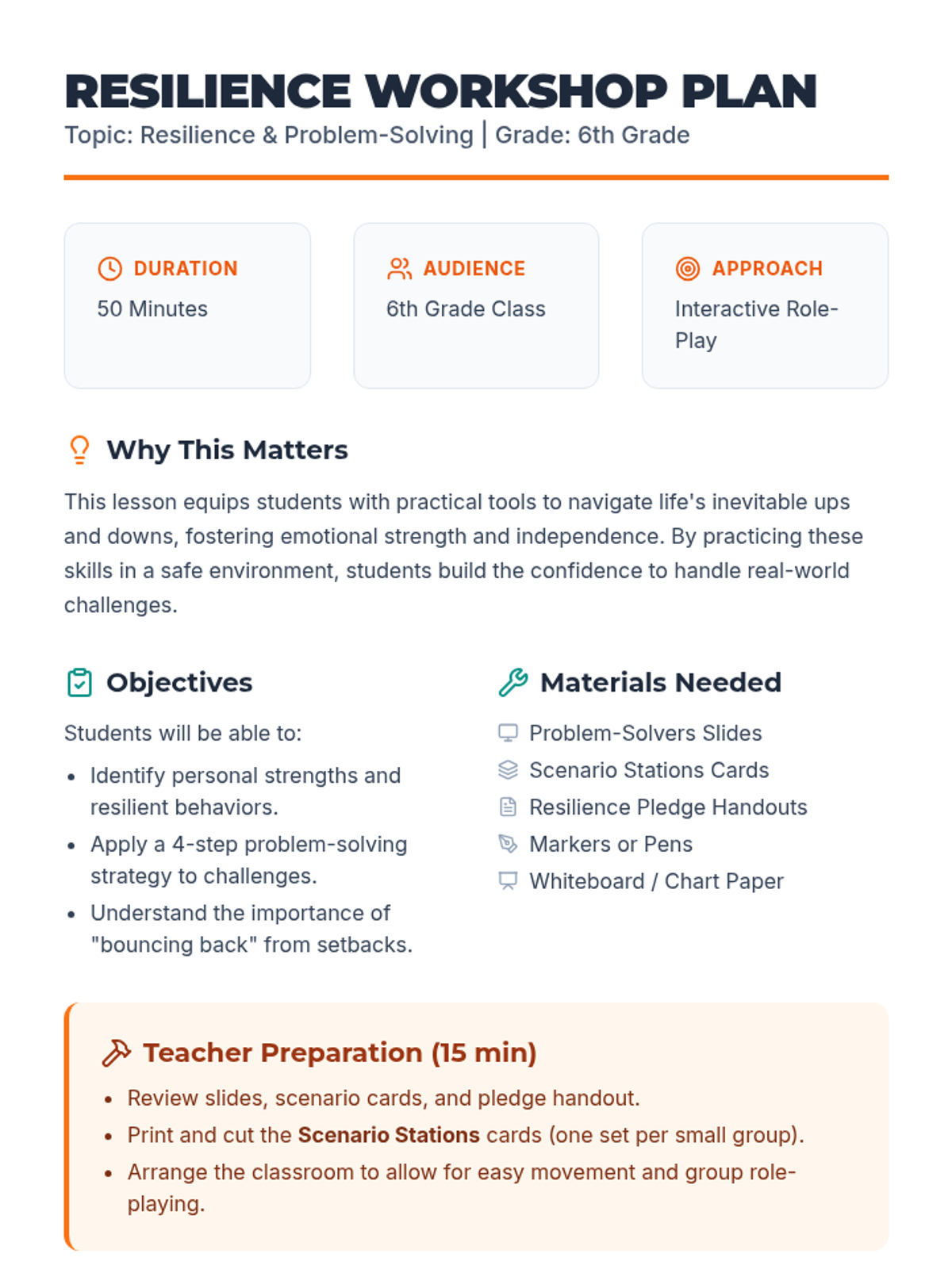 A 50-minute interactive lesson for 6th graders that teaches resilience and problem-solving through real-life scenarios and a collective pledge.