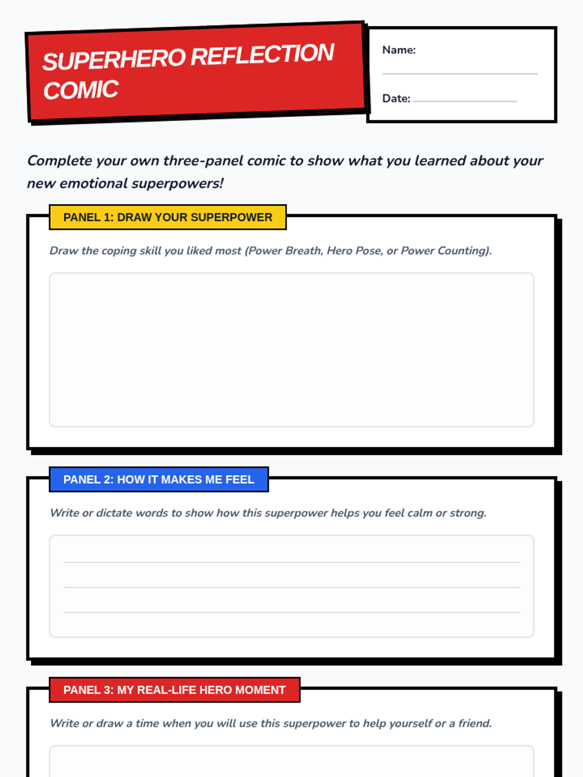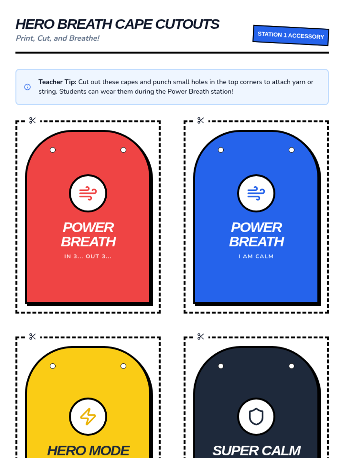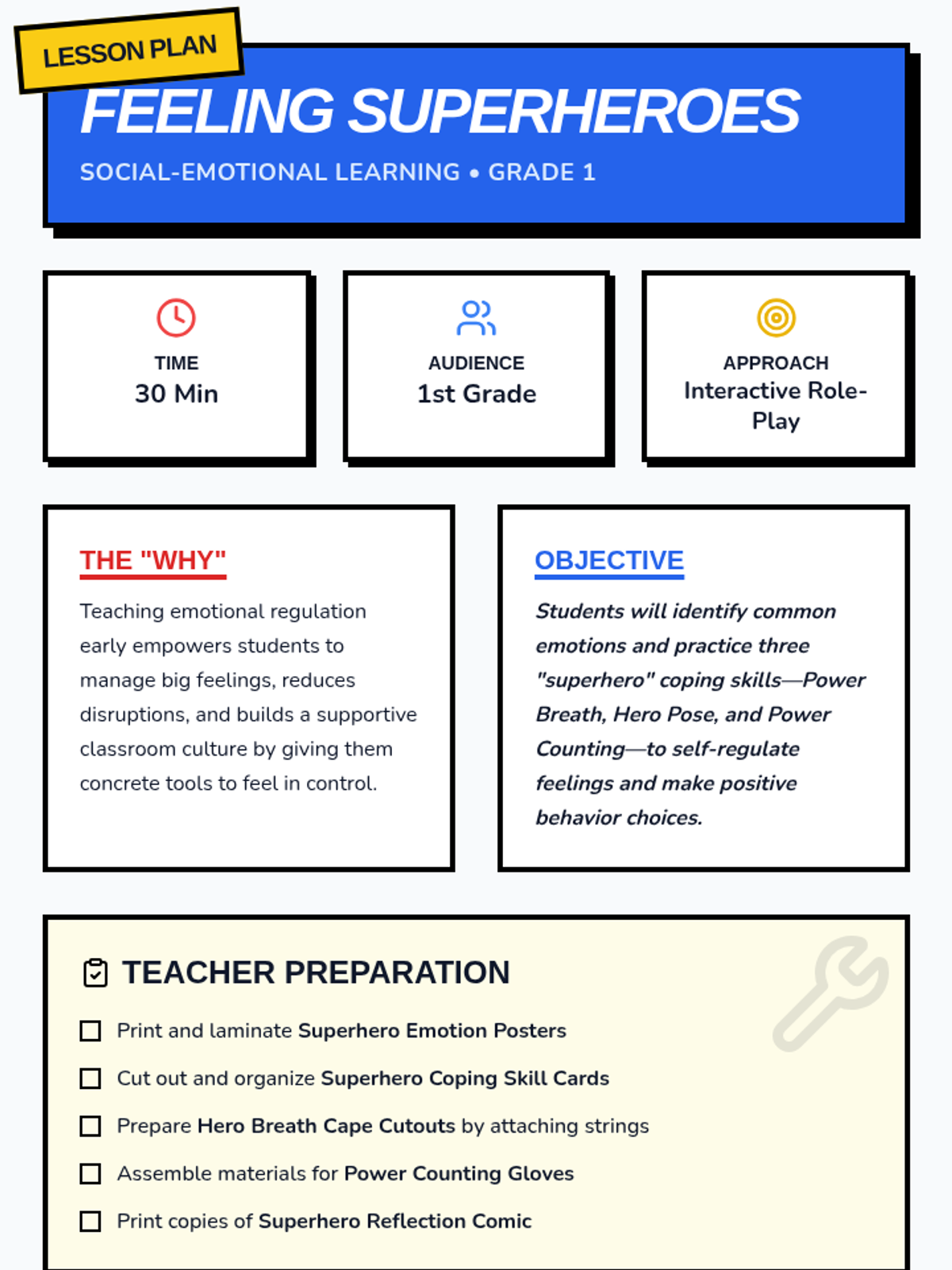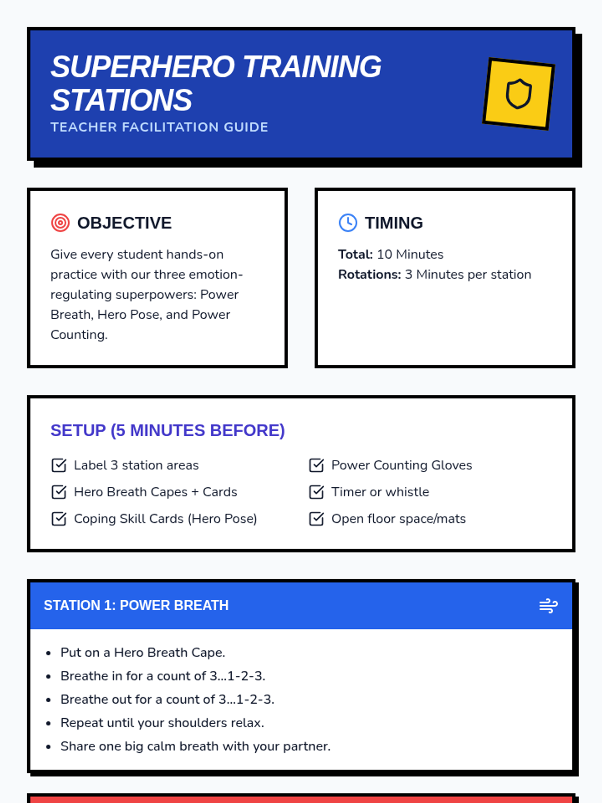A high-energy, superhero-themed lesson for 1st graders to identify emotions and learn three practical coping skills: Power Breath, Hero Pose, and Power Counting. Students practice these 'superpowers' through stations and reflection.