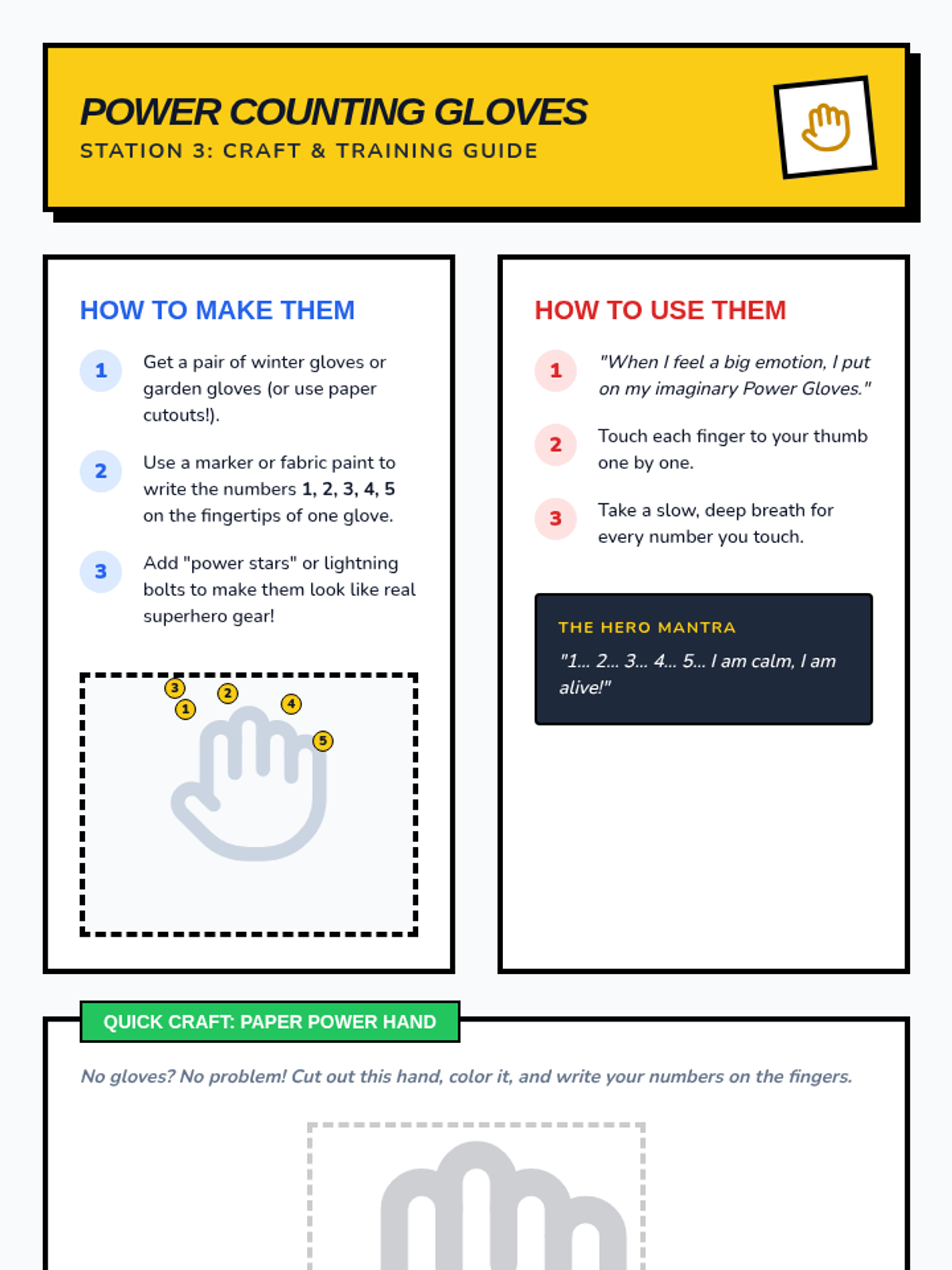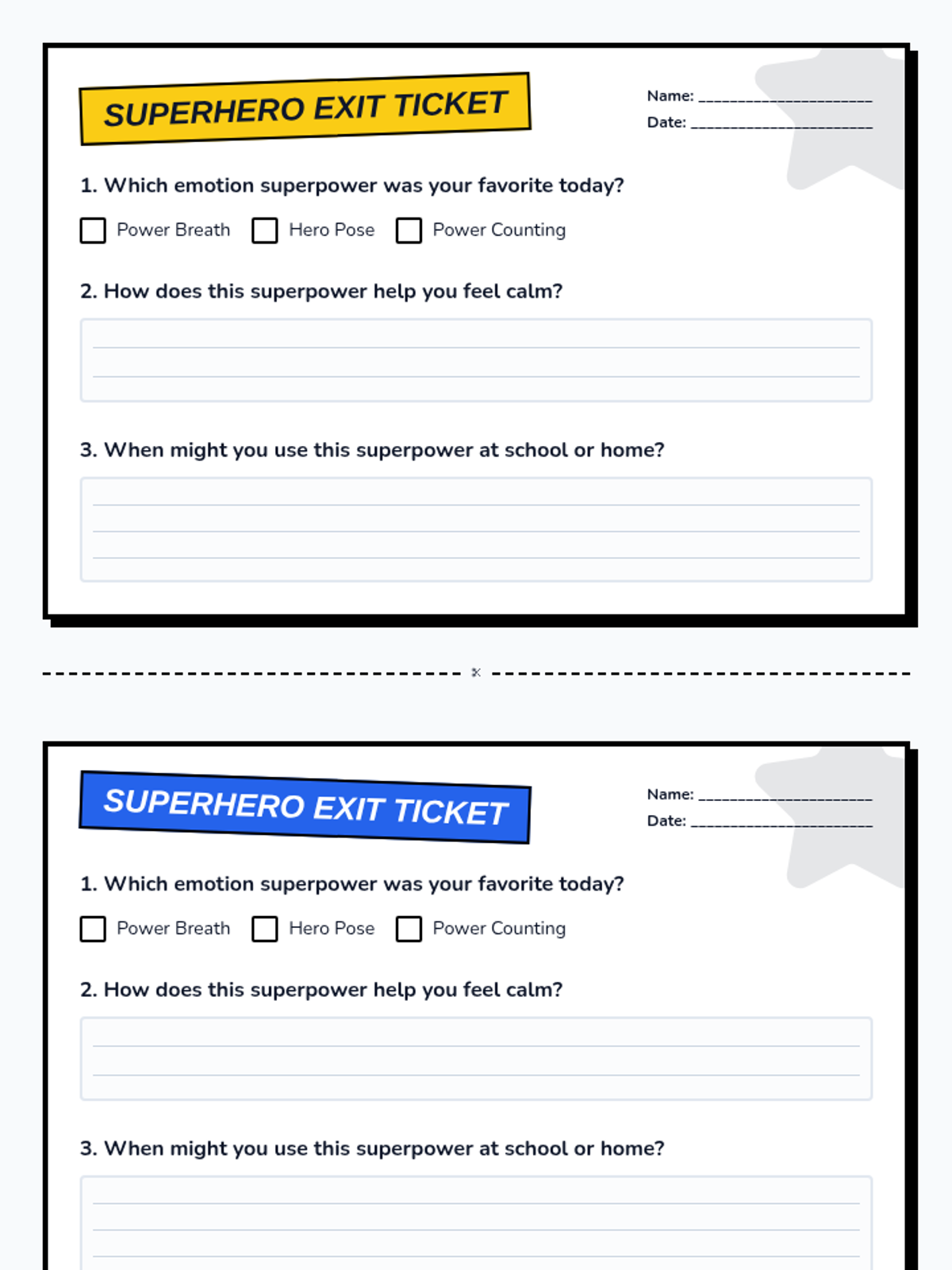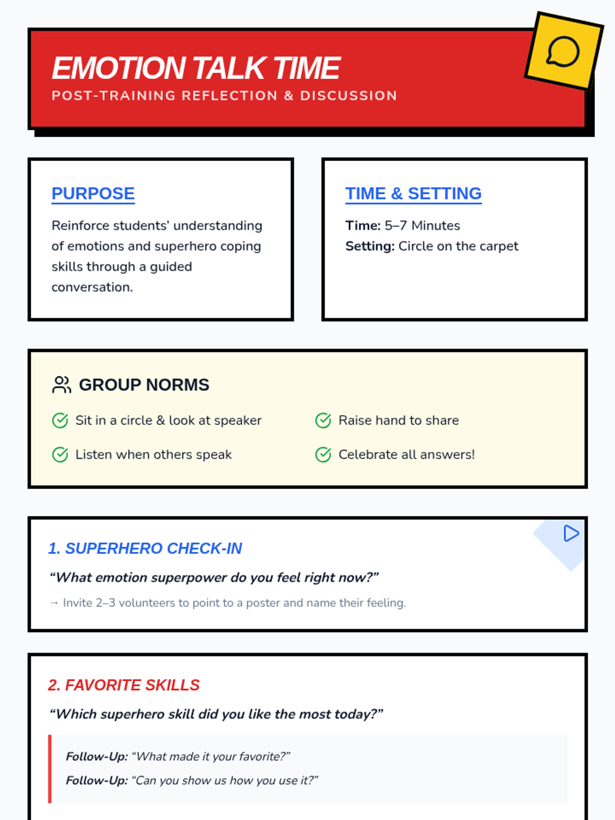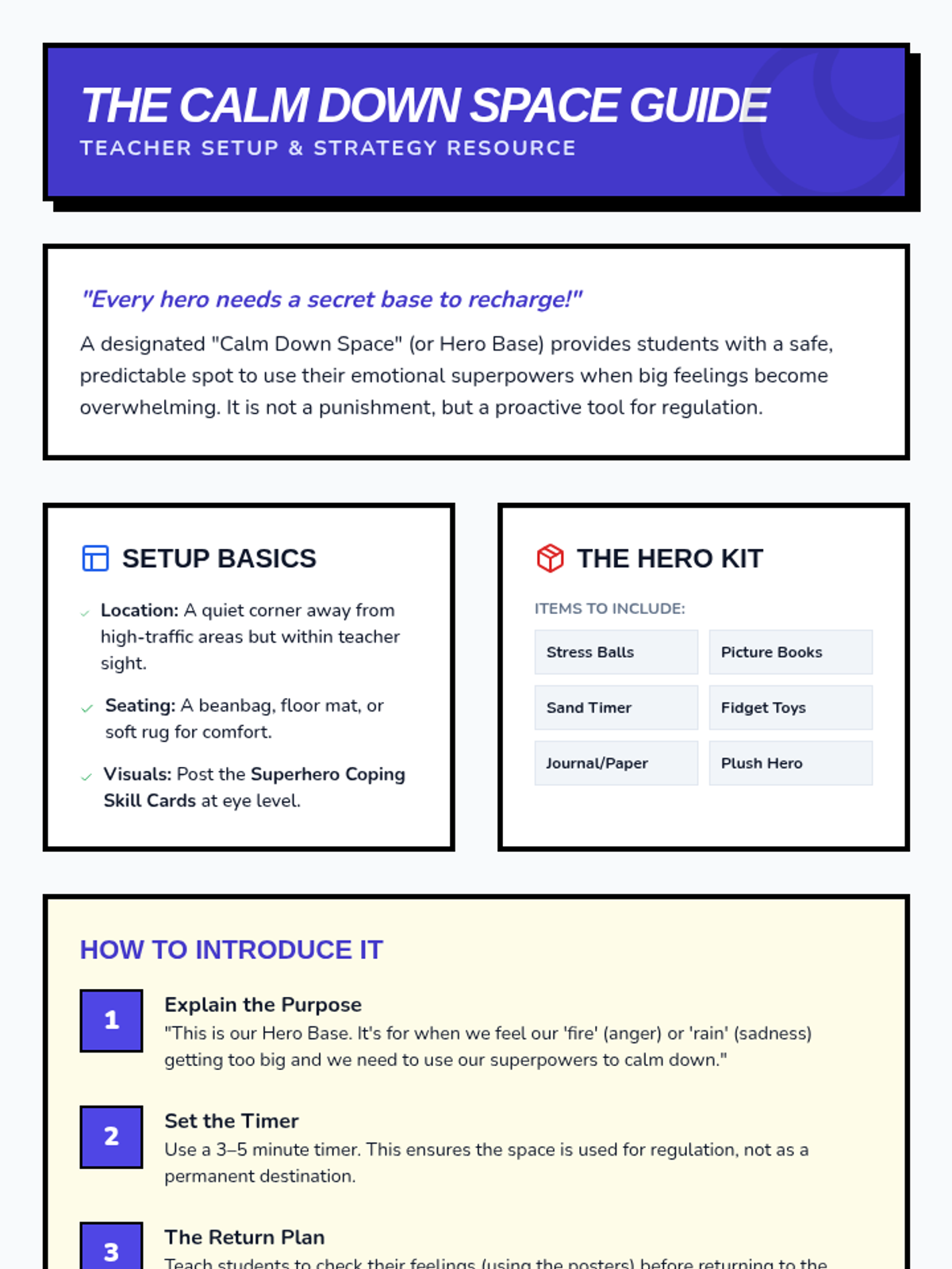A high-energy, superhero-themed lesson for 1st graders to identify emotions and learn three practical coping skills: Power Breath, Hero Pose, and Power Counting. Students practice these 'superpowers' through stations and reflection.