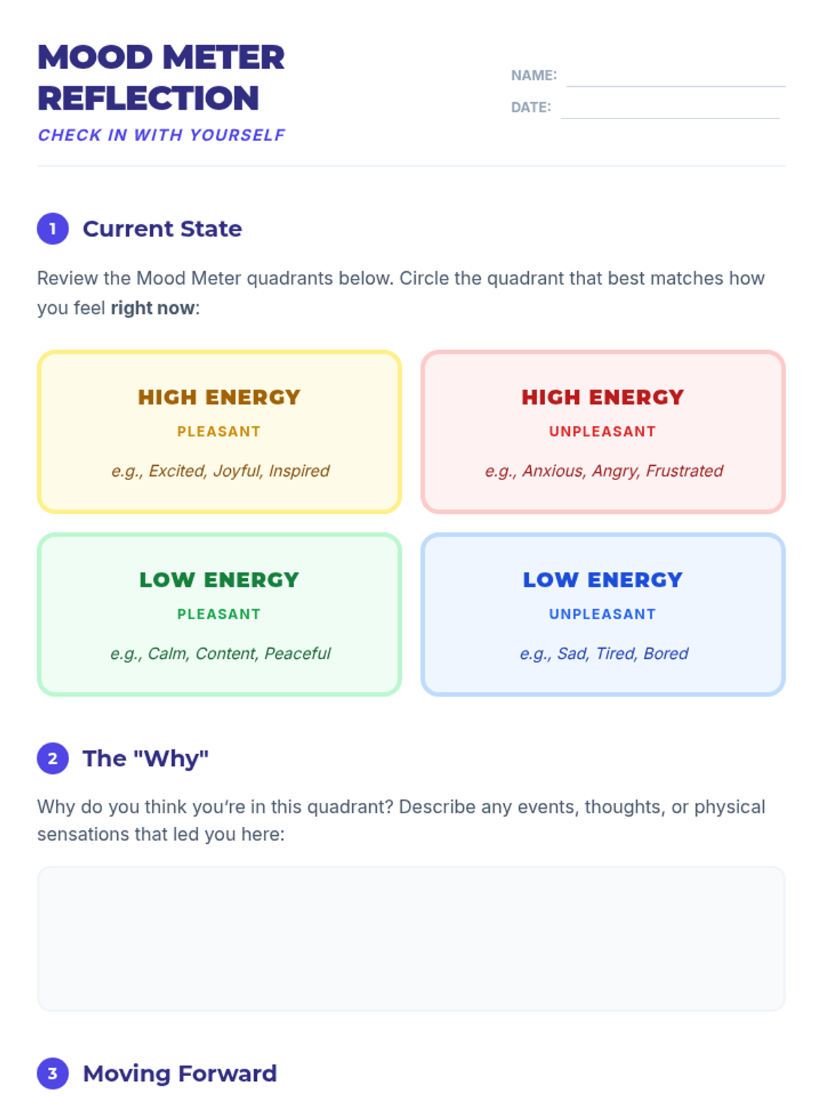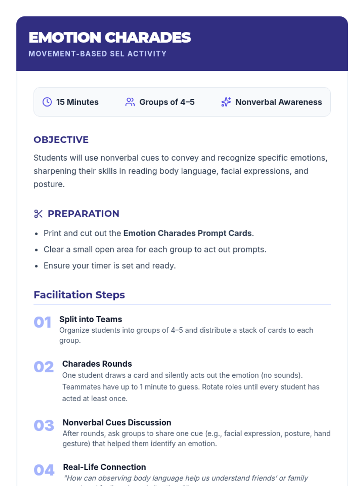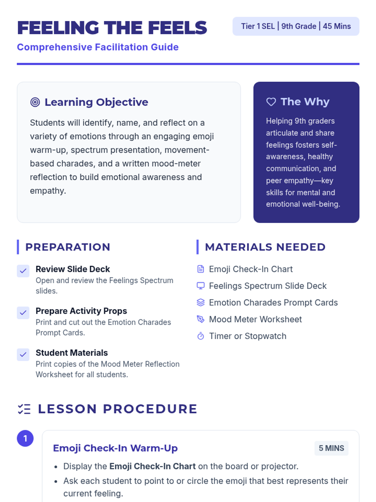 A 45-minute Tier 1 SEL lesson for 9th graders focused on identifying and naming emotions through movement, visual spectrums, and reflective writing.
