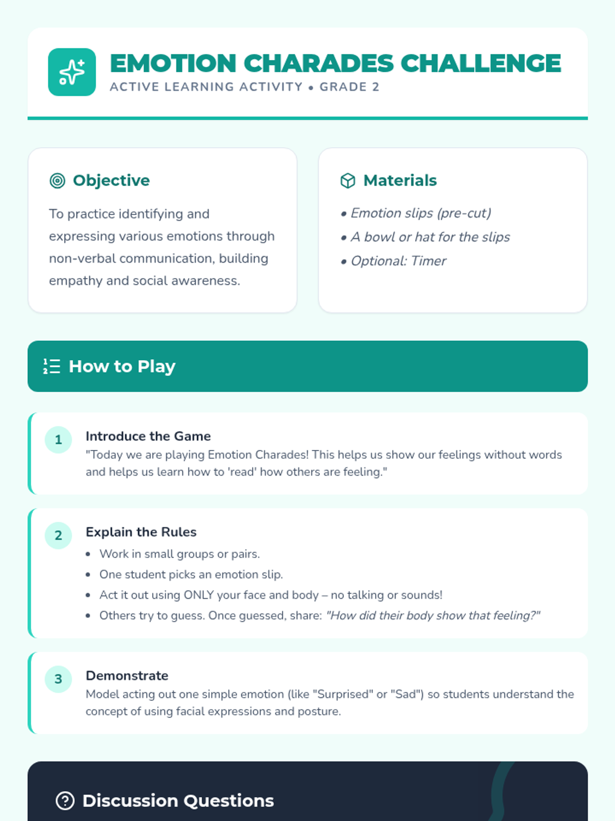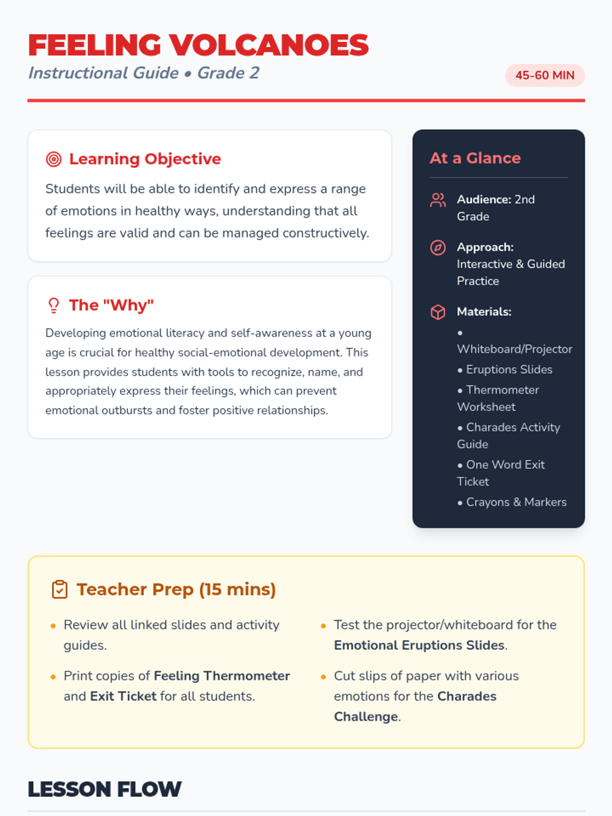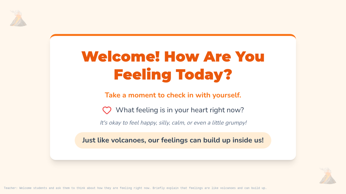 A social-emotional learning lesson for 2nd graders to help them identify, label, and manage emotions using a 'feeling volcano' analogy. Students learn to recognize emotional intensity and practice healthy expression strategies.