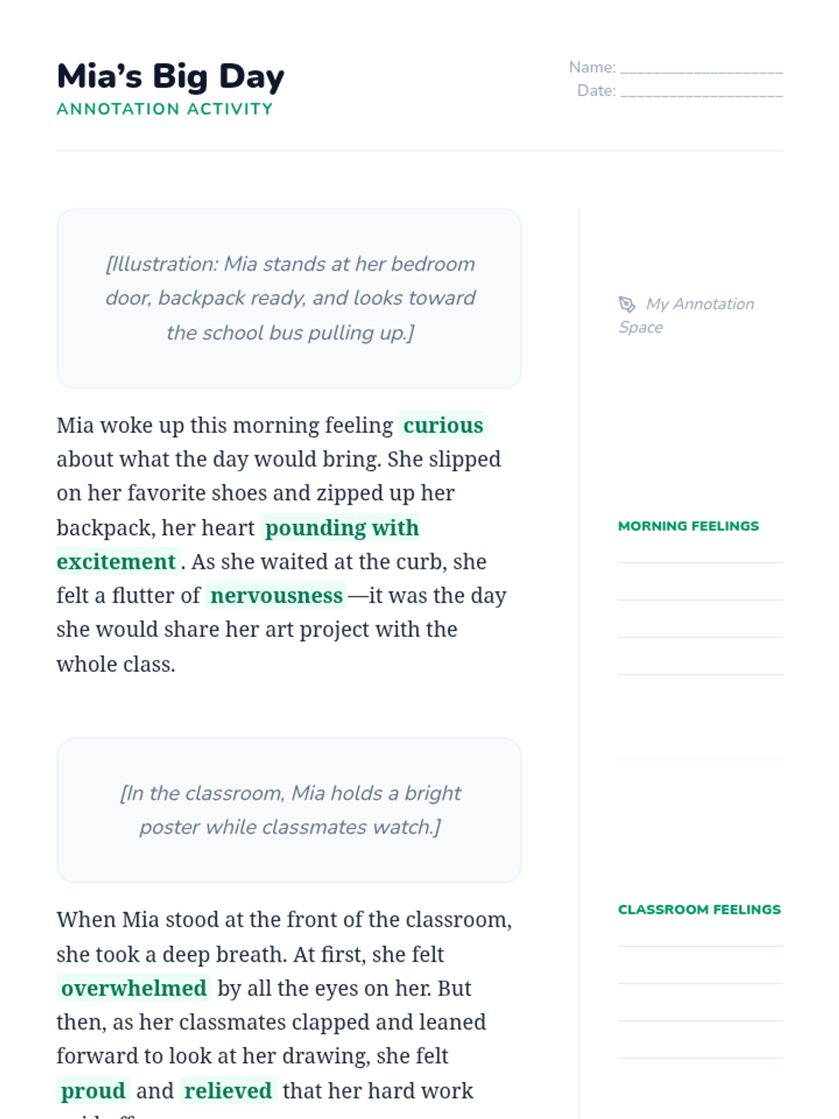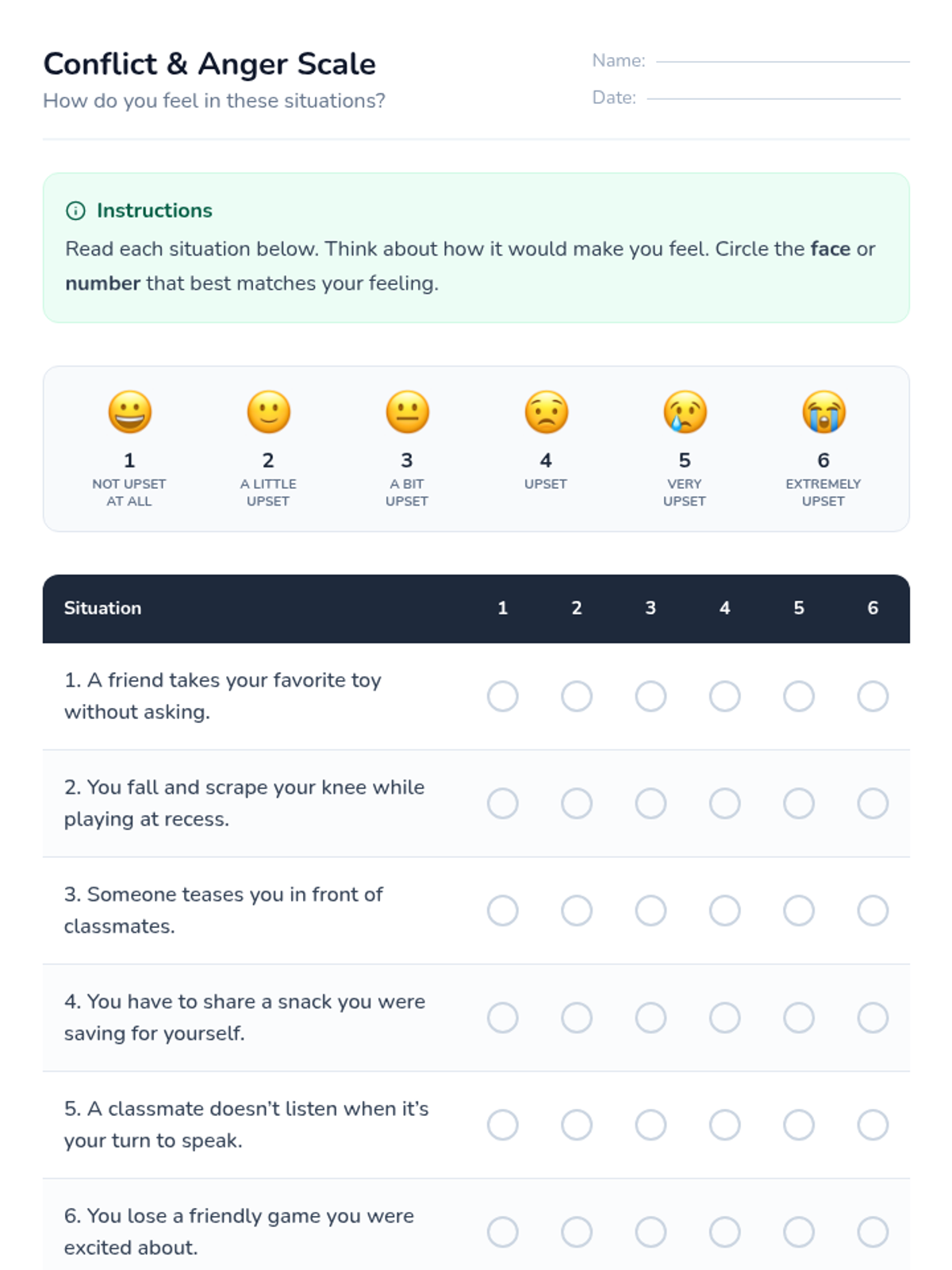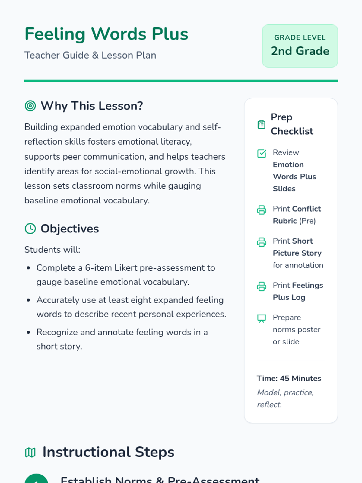 A 45-minute 2nd-grade lesson where students learn expanded emotion vocabulary through storytelling, personal reflection, and a baseline assessment of their emotional responses to conflict.