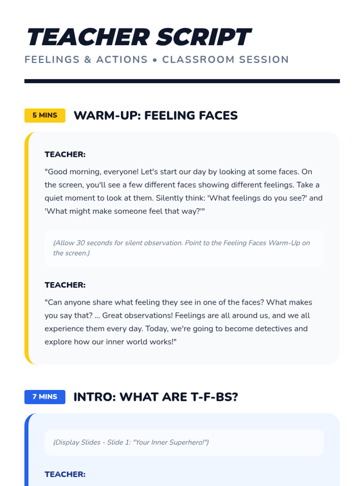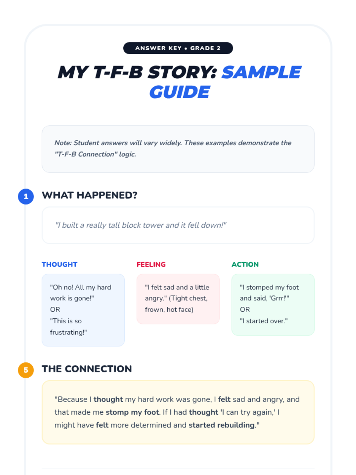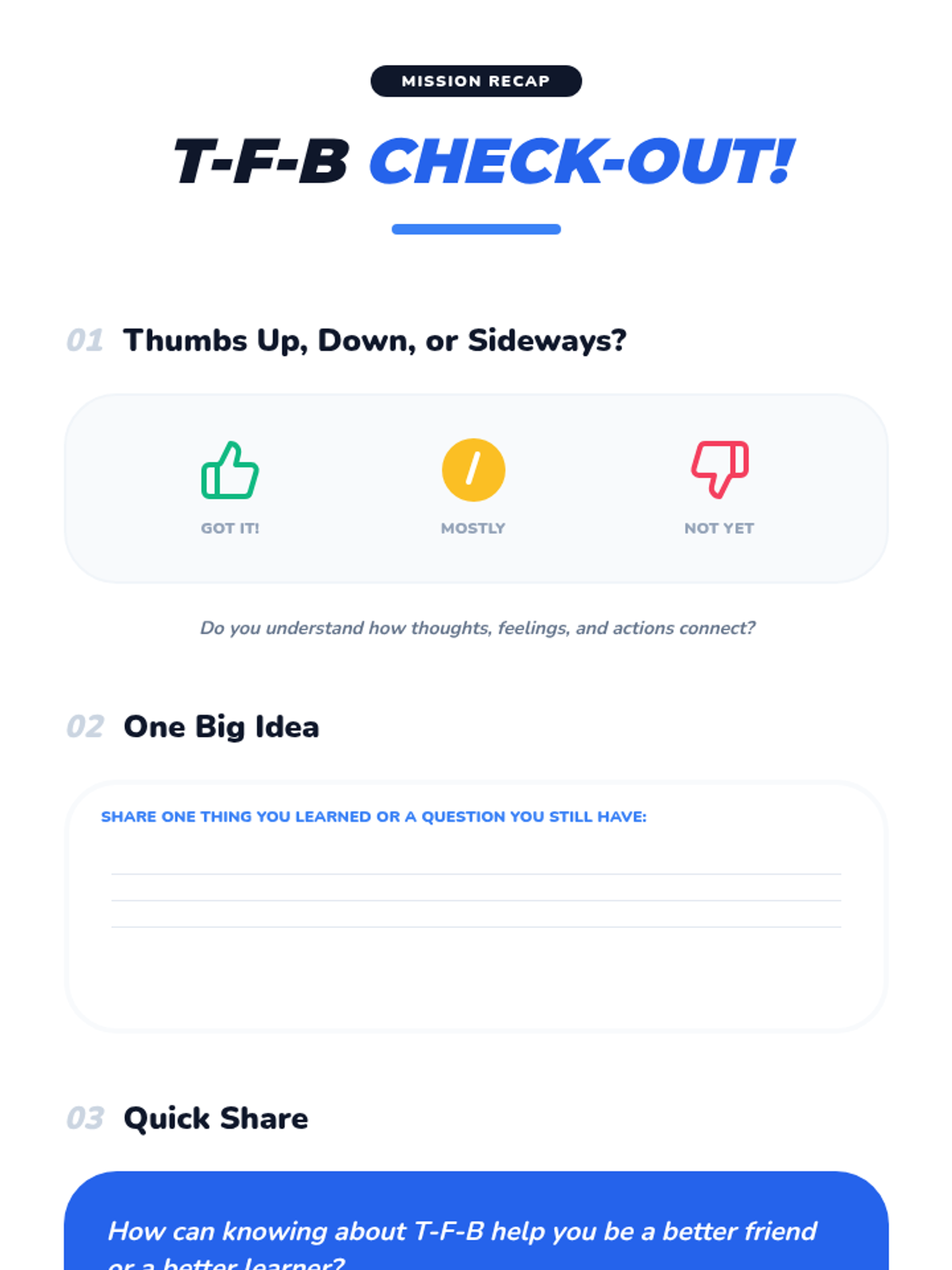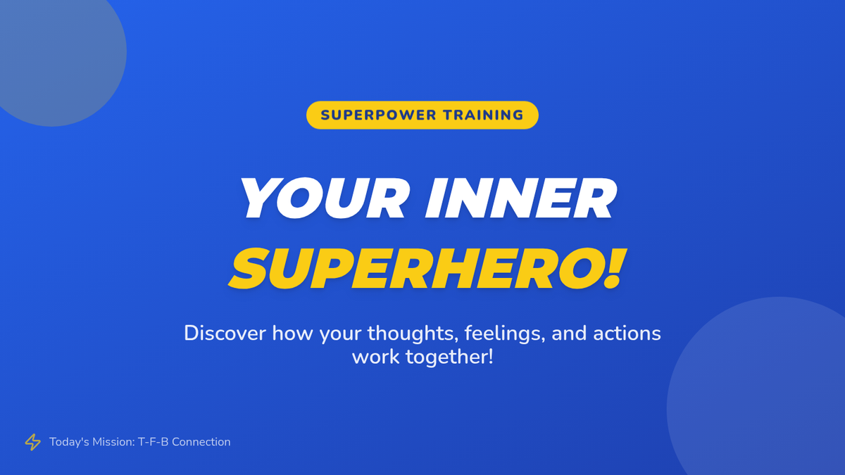 A foundational social-emotional learning lesson for 2nd and 3rd graders exploring the connection between thoughts, feelings, and behaviors (T-F-B). Students learn to identify their inner superhero 'team' and practice tracing these connections through scenarios and personal stories.