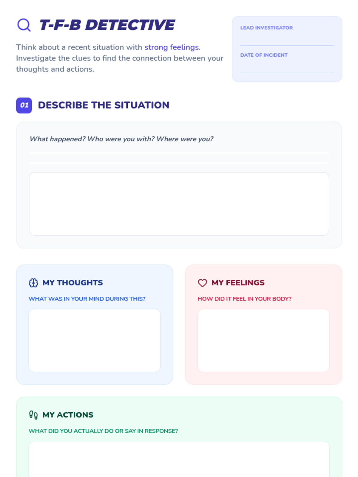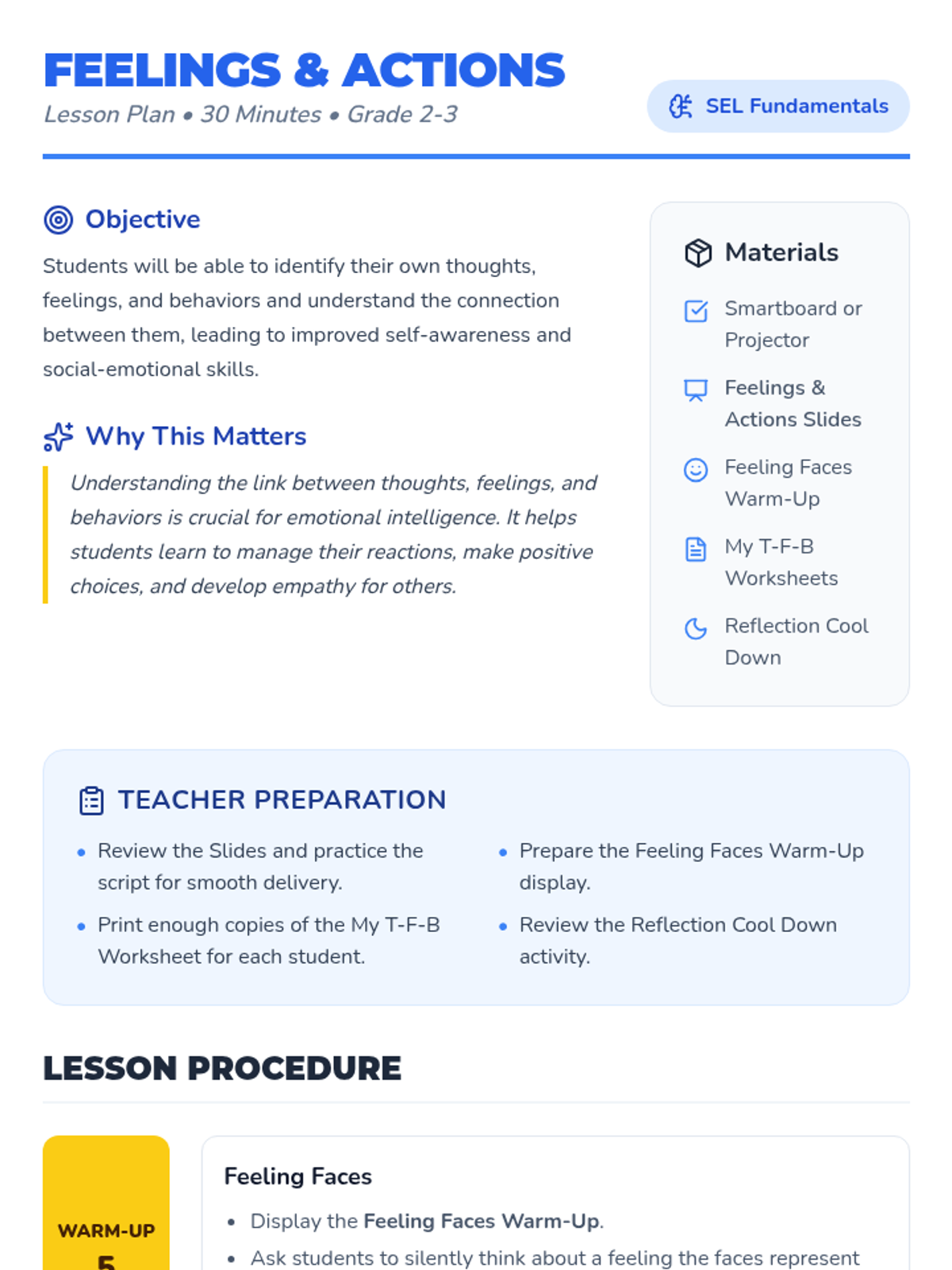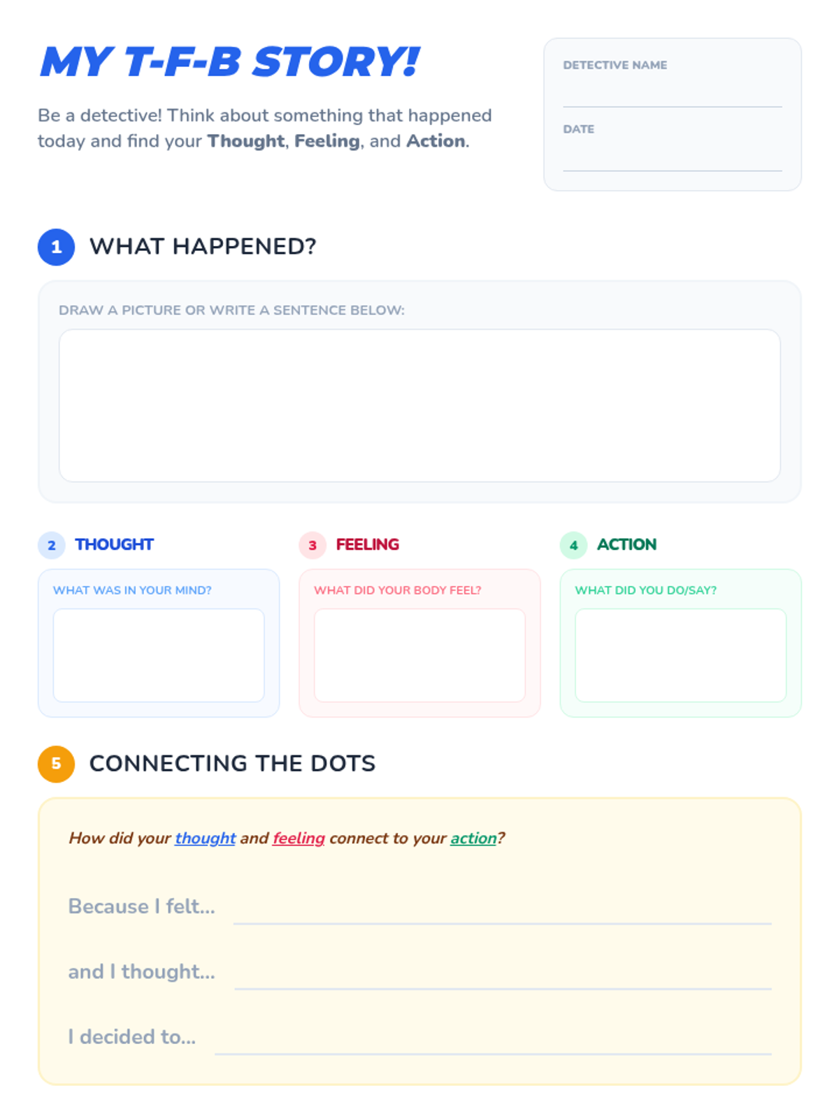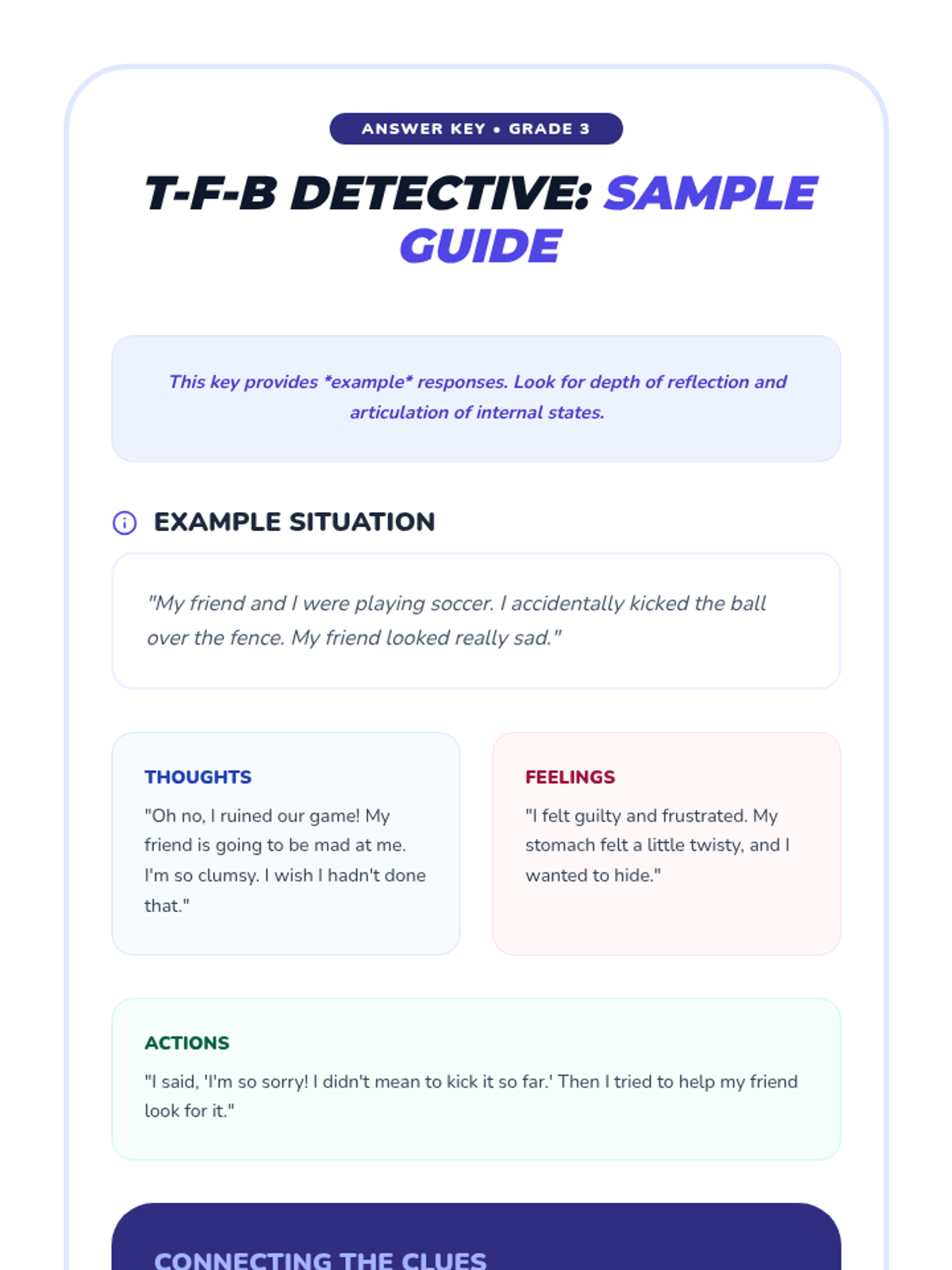 A foundational social-emotional learning lesson for 2nd and 3rd graders exploring the connection between thoughts, feelings, and behaviors (T-F-B). Students learn to identify their inner superhero 'team' and practice tracing these connections through scenarios and personal stories.