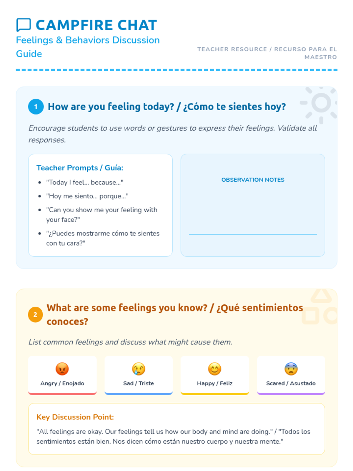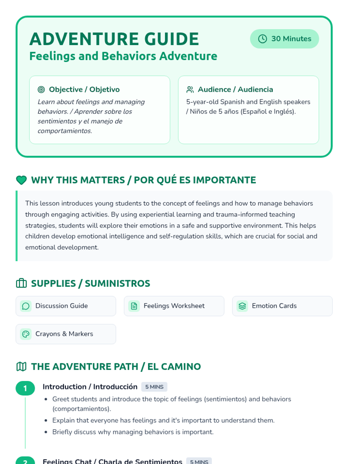 An introductory lesson for 5-year-olds to explore emotions and self-regulation through interactive discussion, movement, and creative expression. This bilingual (English/Spanish) lesson uses trauma-informed strategies to help children build emotional intelligence.