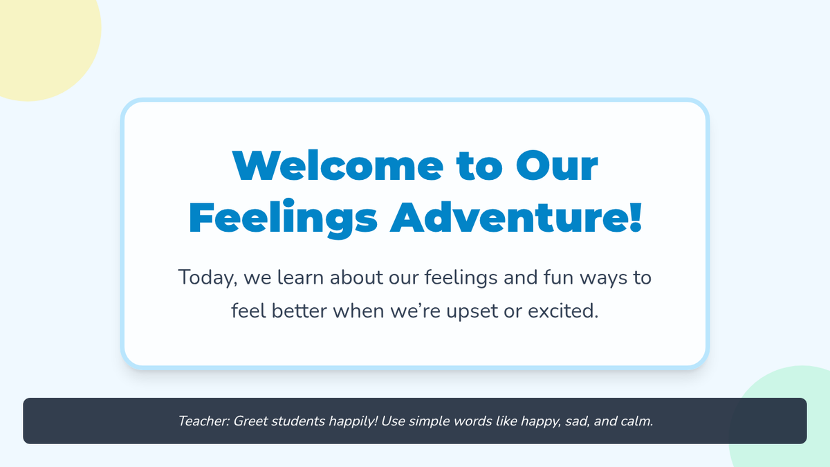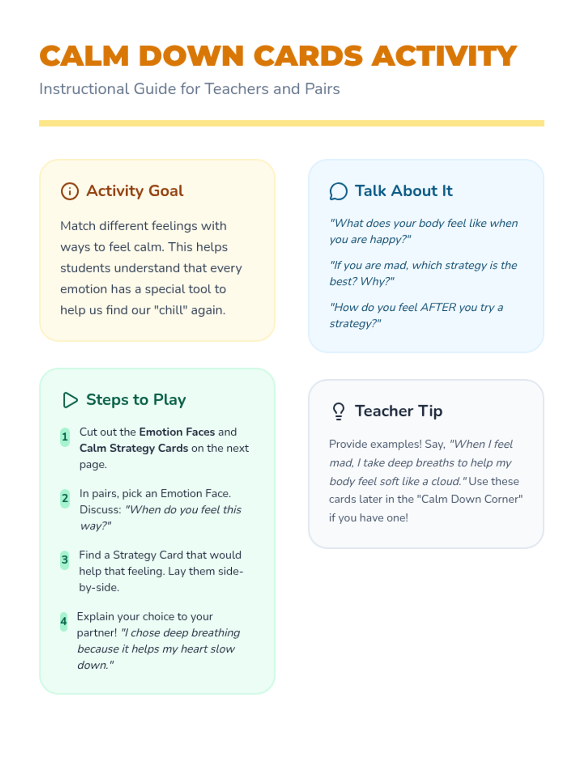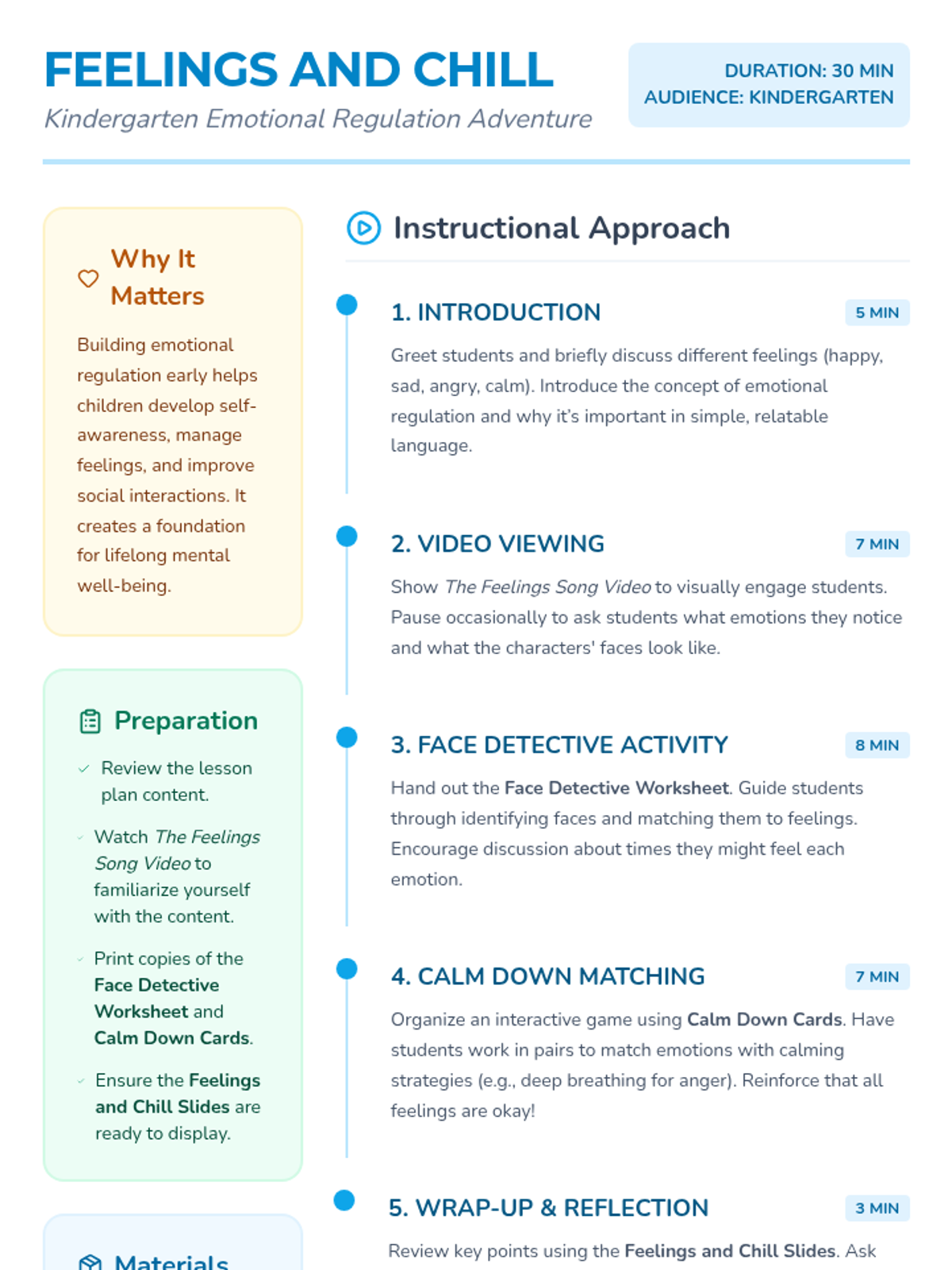 This engaging kindergarten lesson helps students recognize and regulate emotions through music, interactive slides, and matching activities. Students will explore basic feelings like happy, sad, and angry, while learning simple 'chill' strategies to find their calm.