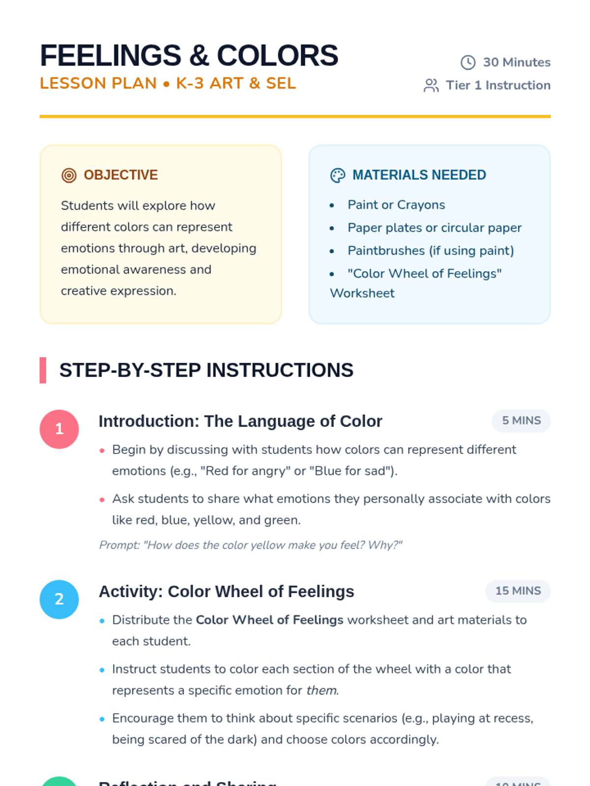 A creative lesson for K-3 students exploring the connection between colors and emotions through art and discussion. Students will create their own color wheel of feelings to develop emotional awareness.