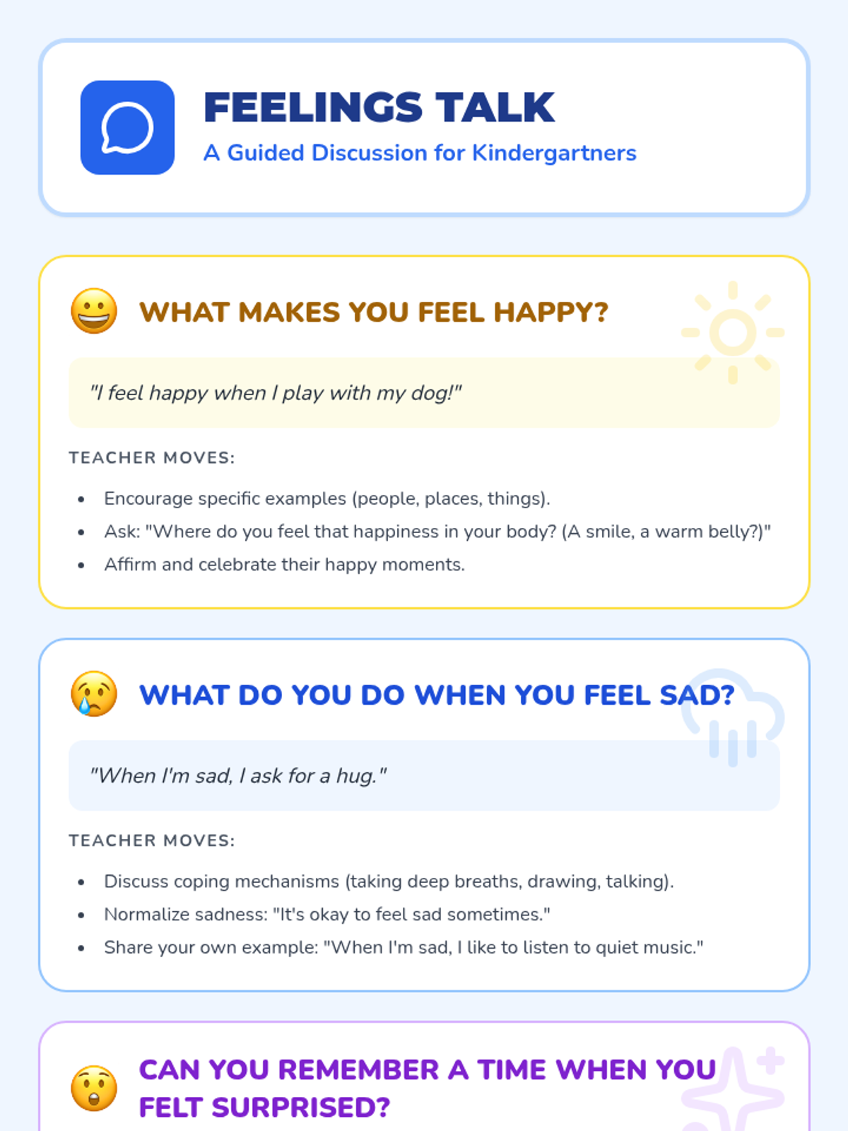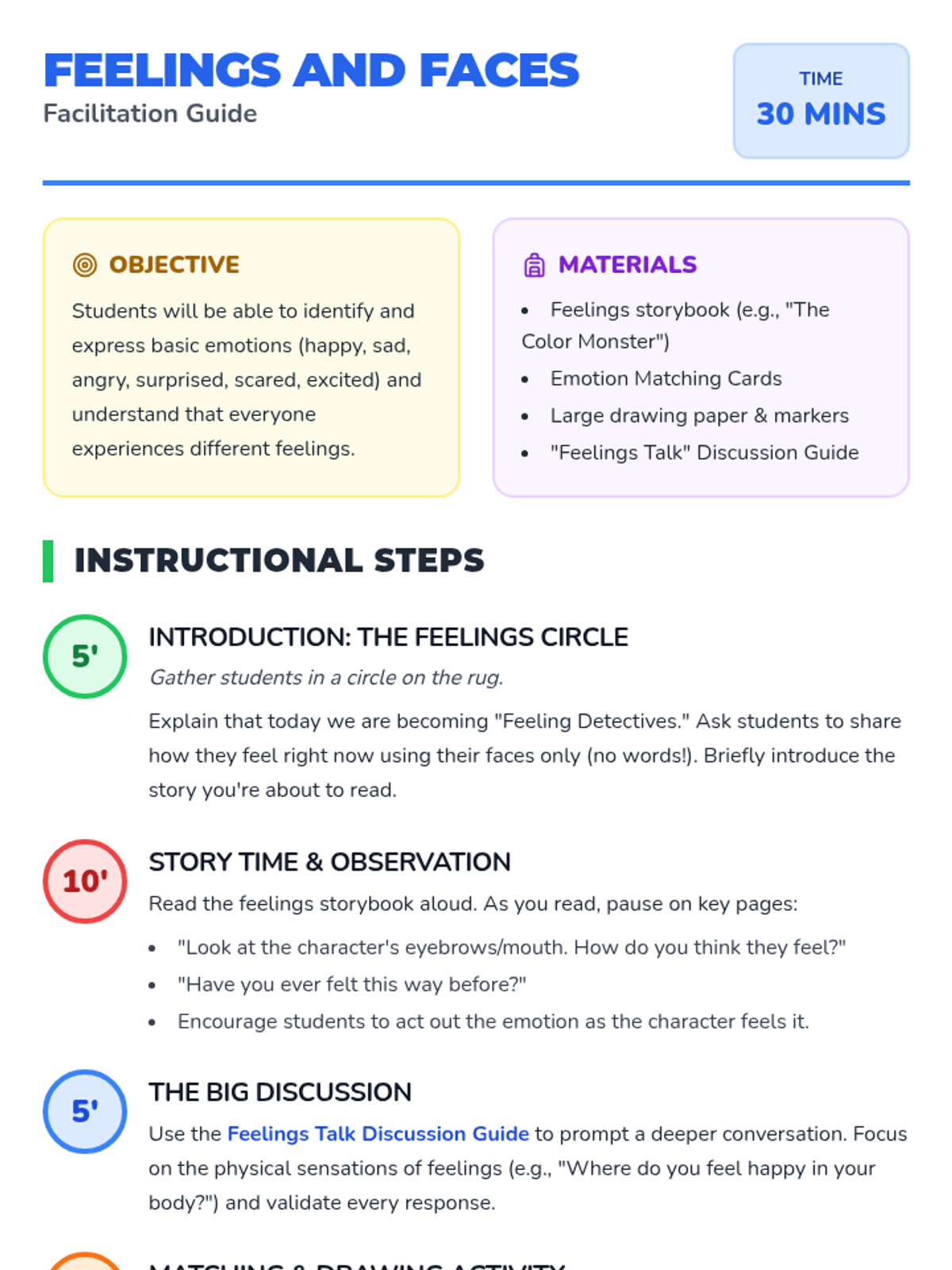 A Kindergarten lesson focused on identifying and expressing core emotions through storytelling, guided discussion, and creative activities. Students will explore happiness, sadness, anger, surprise, fear, and excitement to build social-emotional awareness.
