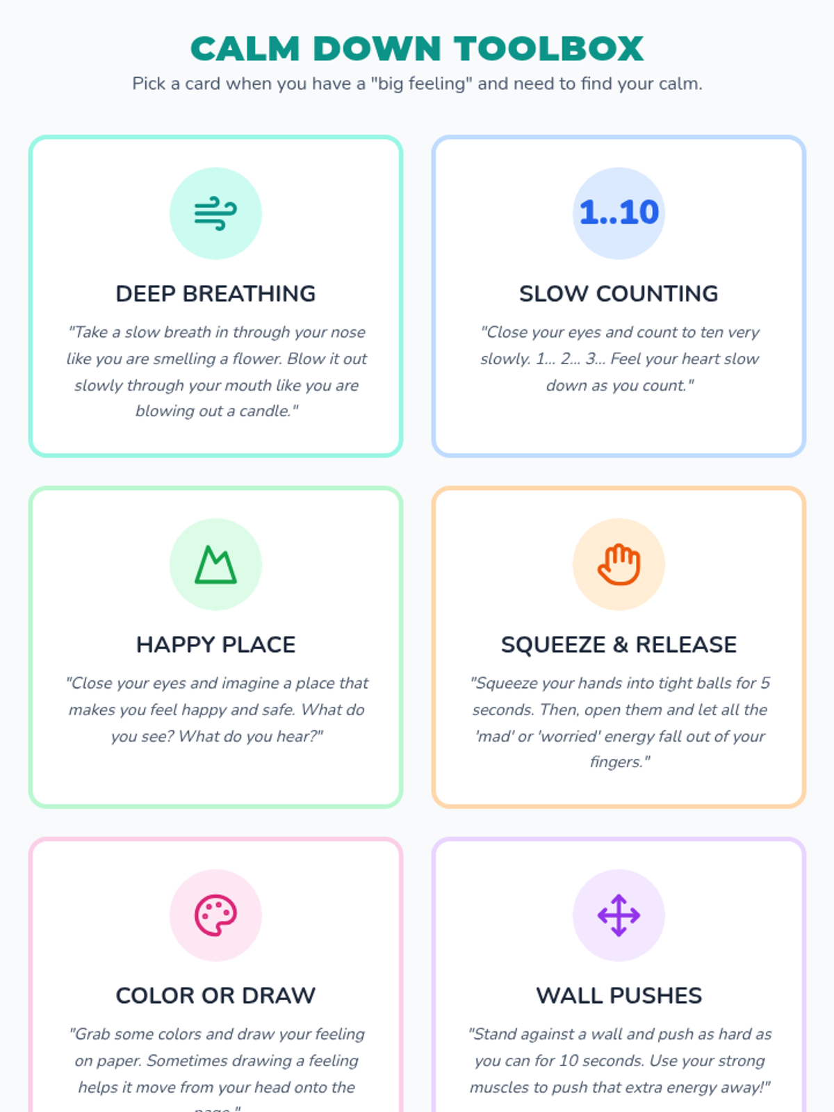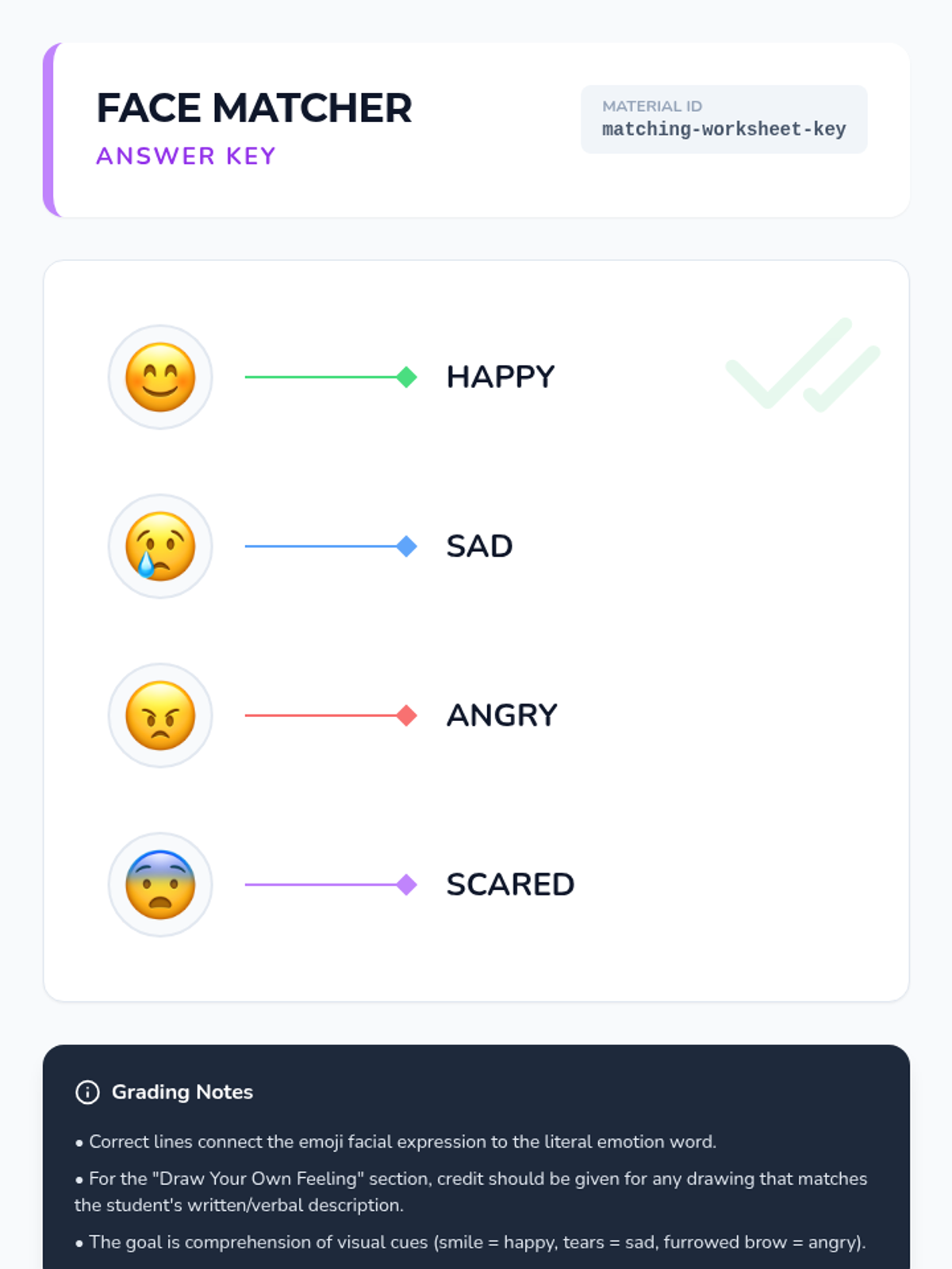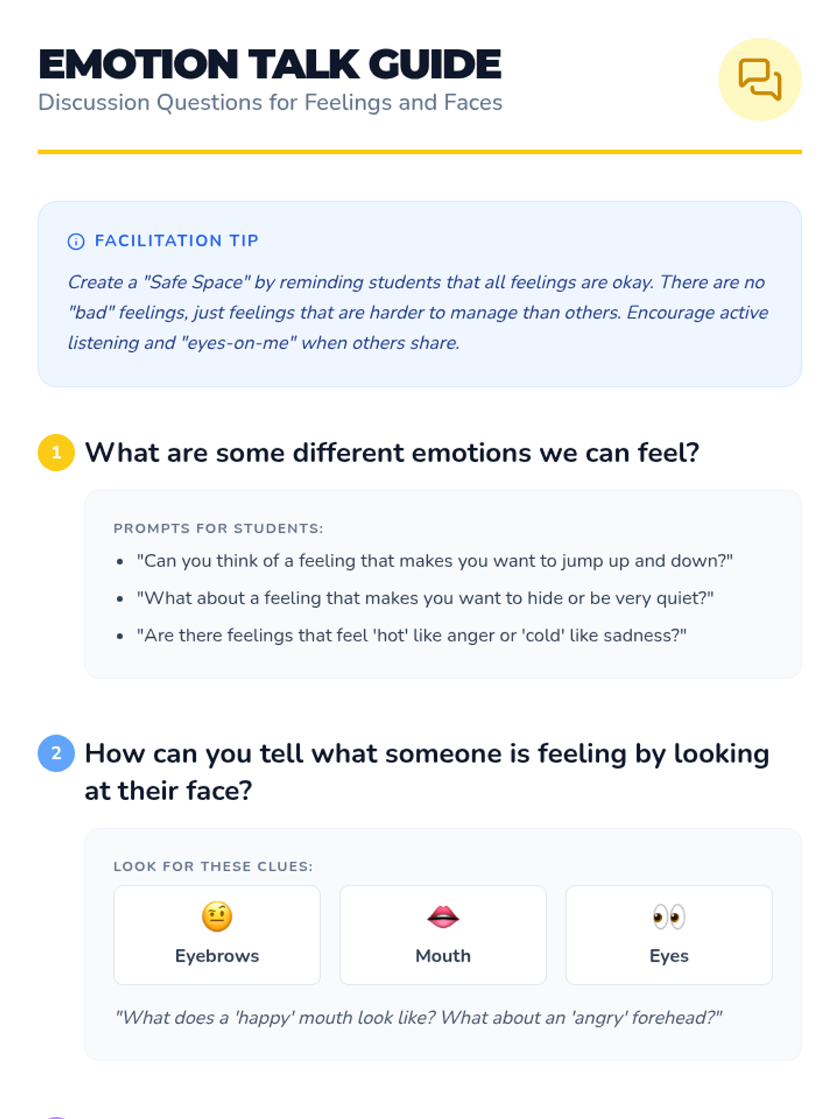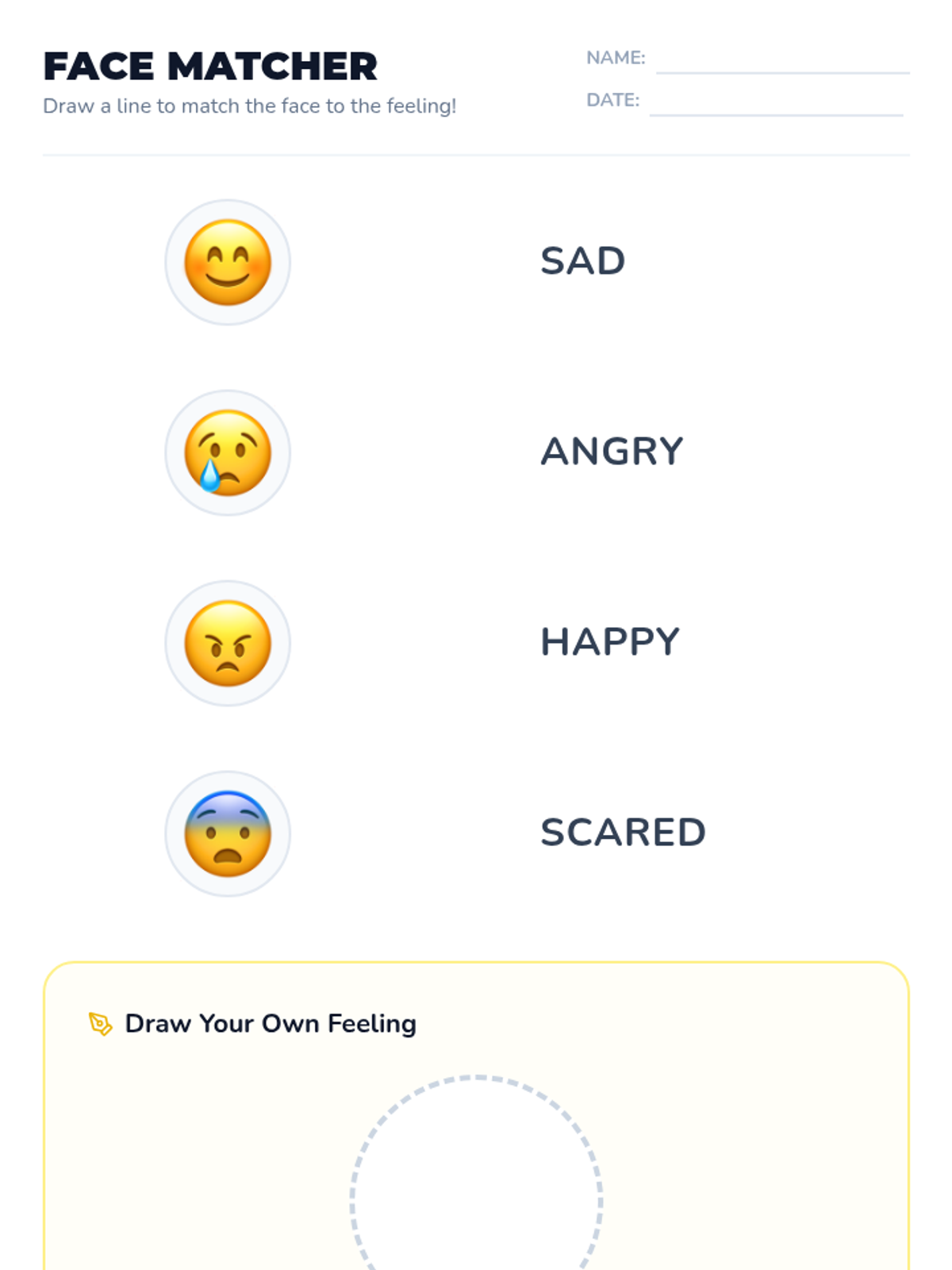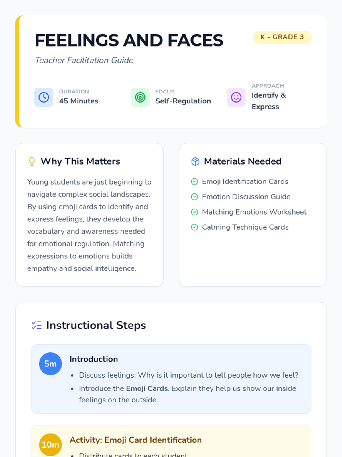 Students will use emoji cards to identify and express their current feelings, learn to match emotions with facial expressions, and practice calming techniques for self-regulation. This lesson is essential for developing foundational emotional awareness and social-emotional skills in young learners.