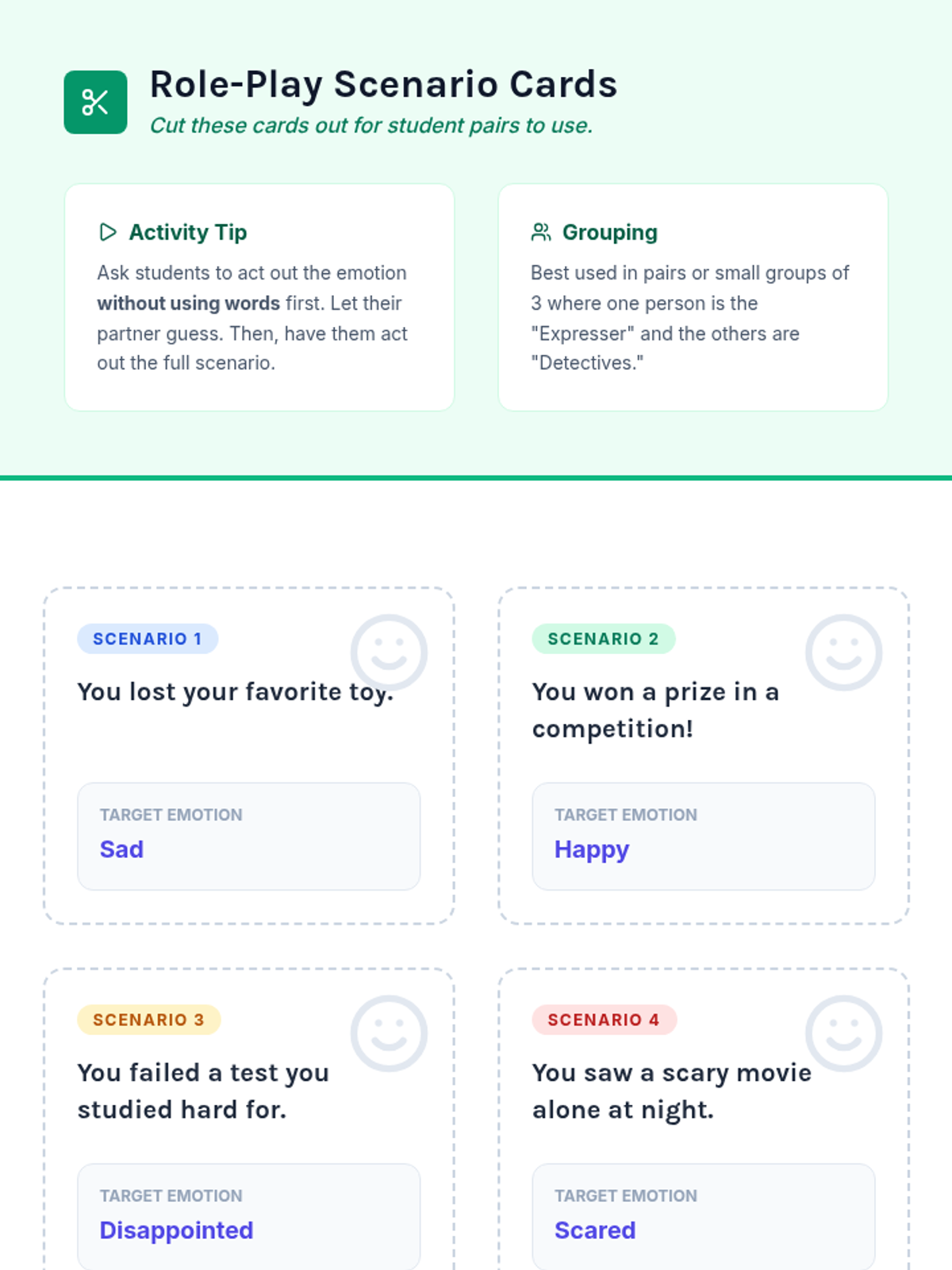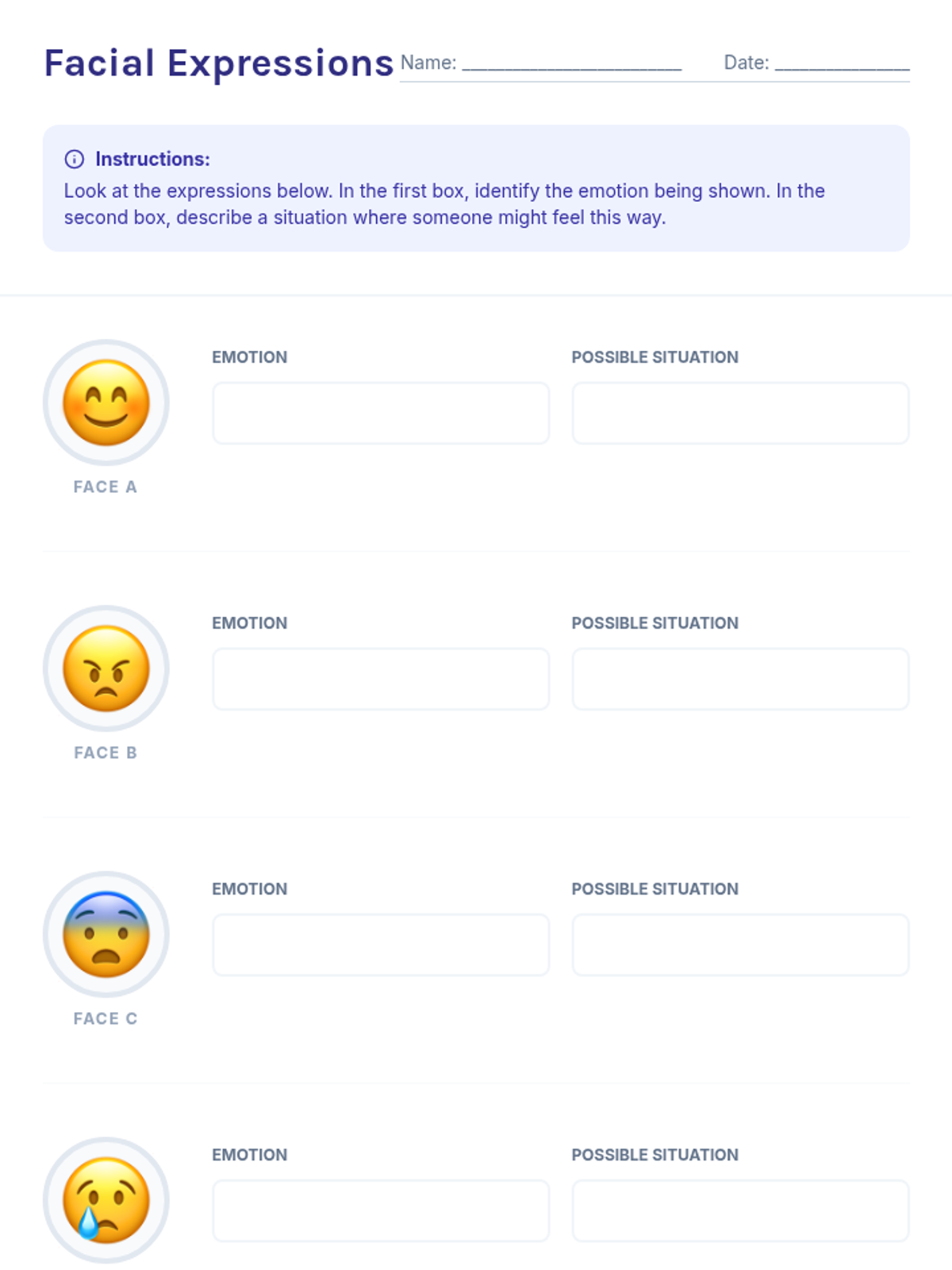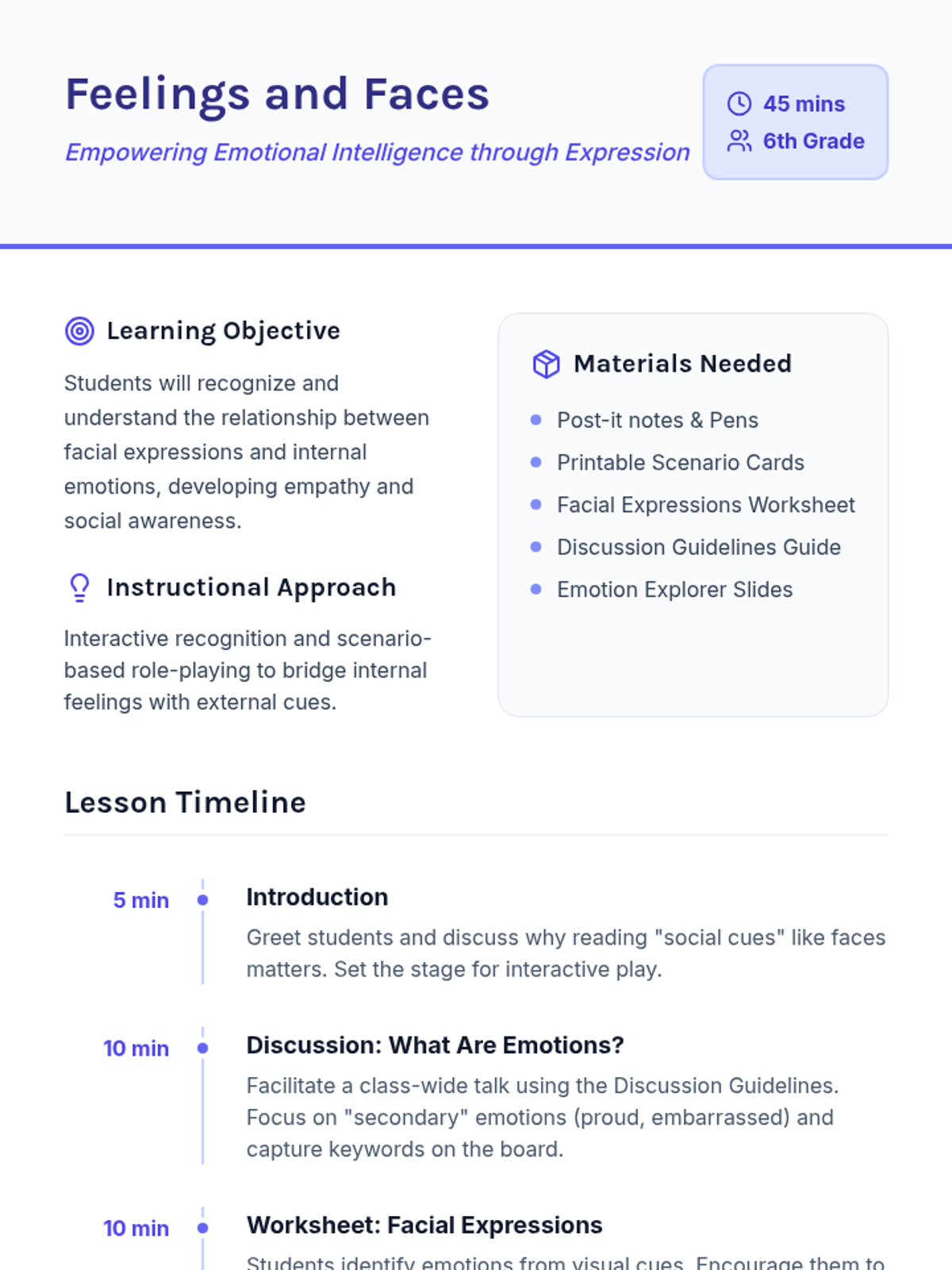 Students explore the connection between facial expressions and emotions through interactive activities, role-playing, and reflection, fostering empathy and emotional intelligence.