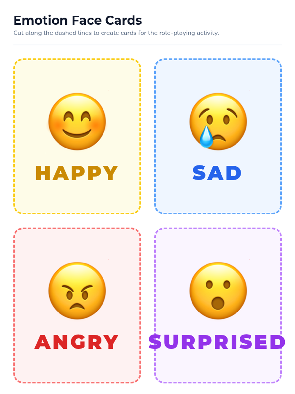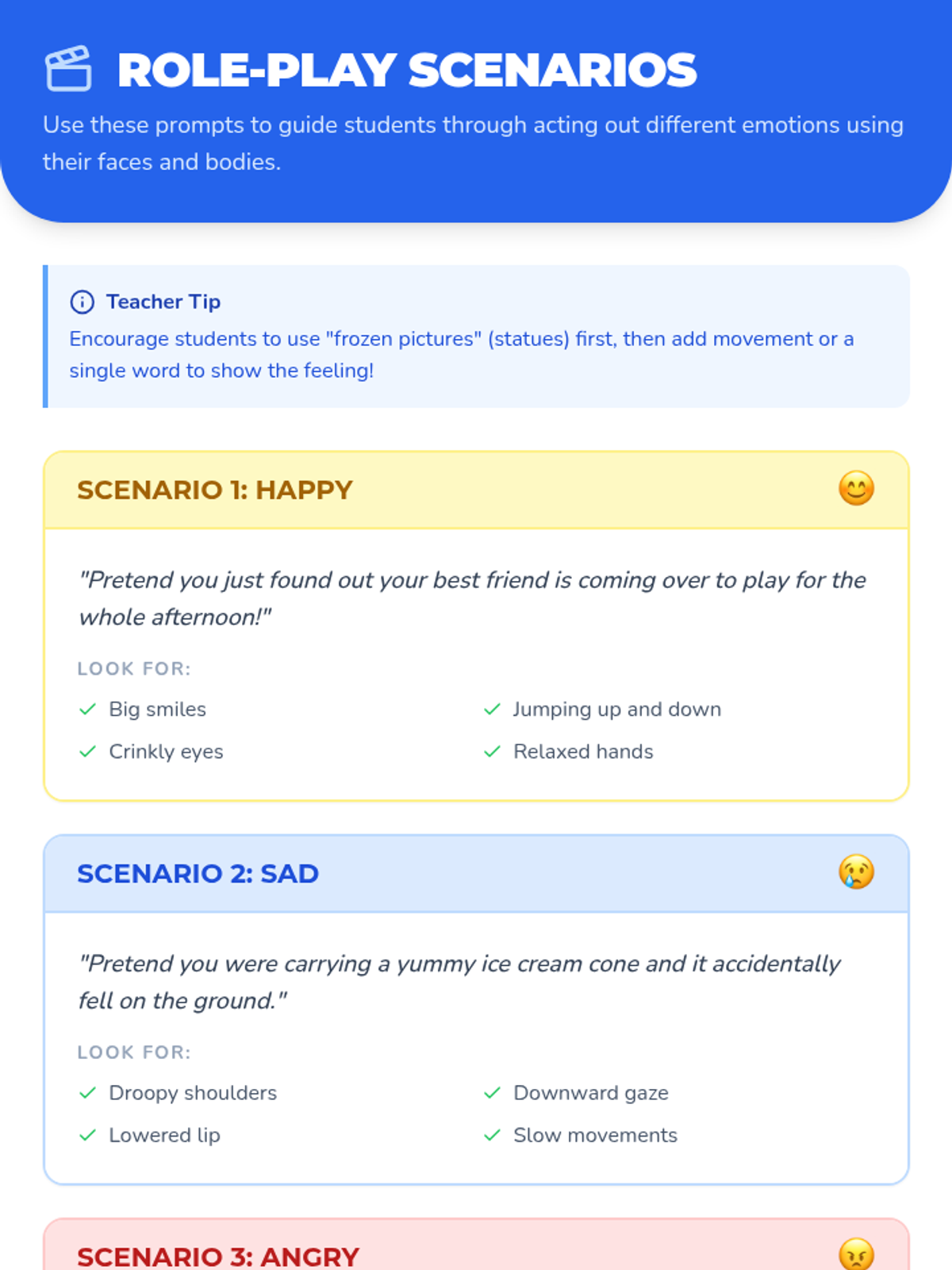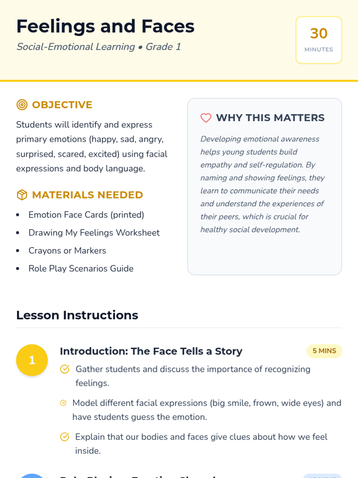 A social-emotional learning lesson for 1st graders focused on identifying and expressing emotions through facial expressions, body language, and creative drawing. Students will practice empathy and self-awareness through role-play and art.