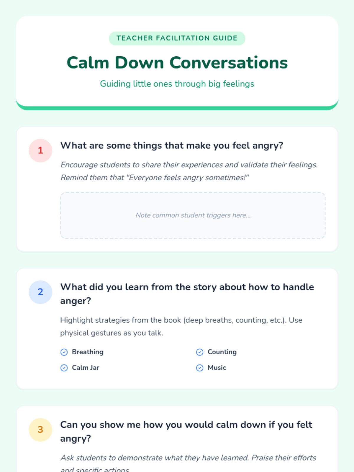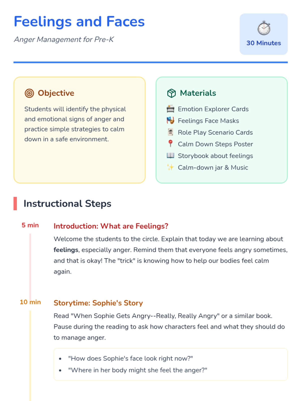 A Pre-K lesson focused on identifying emotions and learning anger management strategies through stories and role-playing.