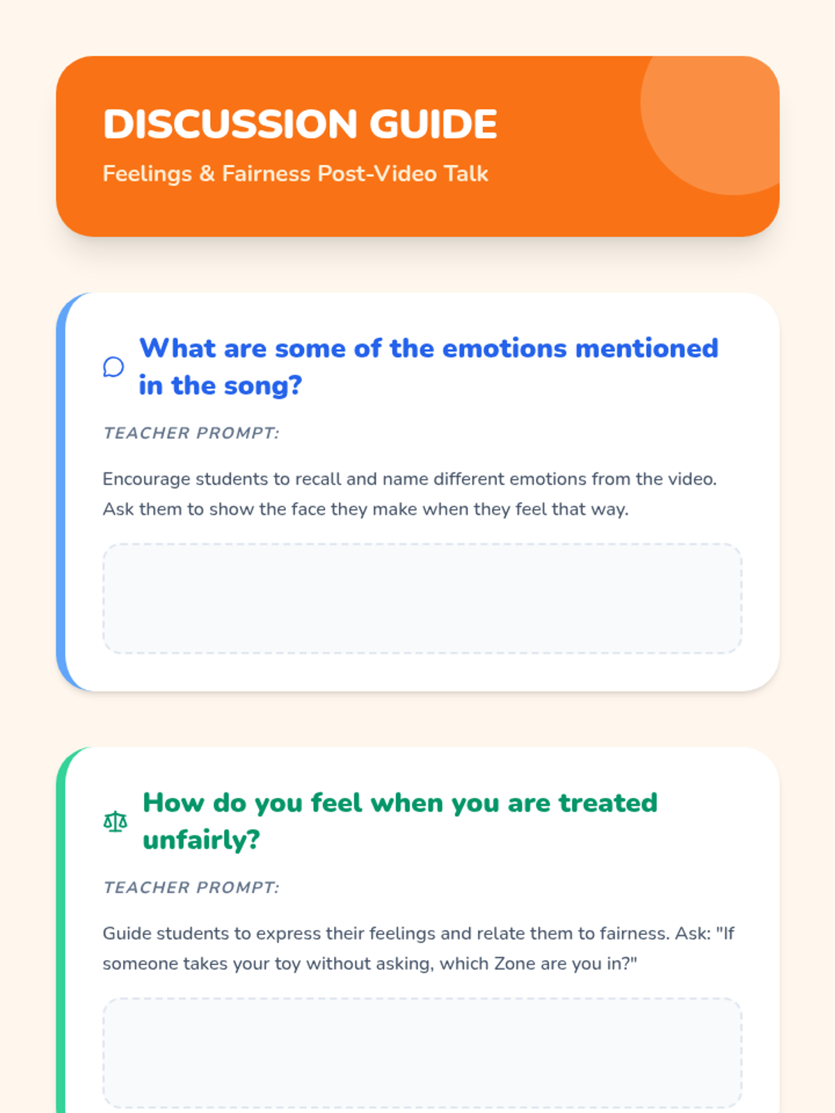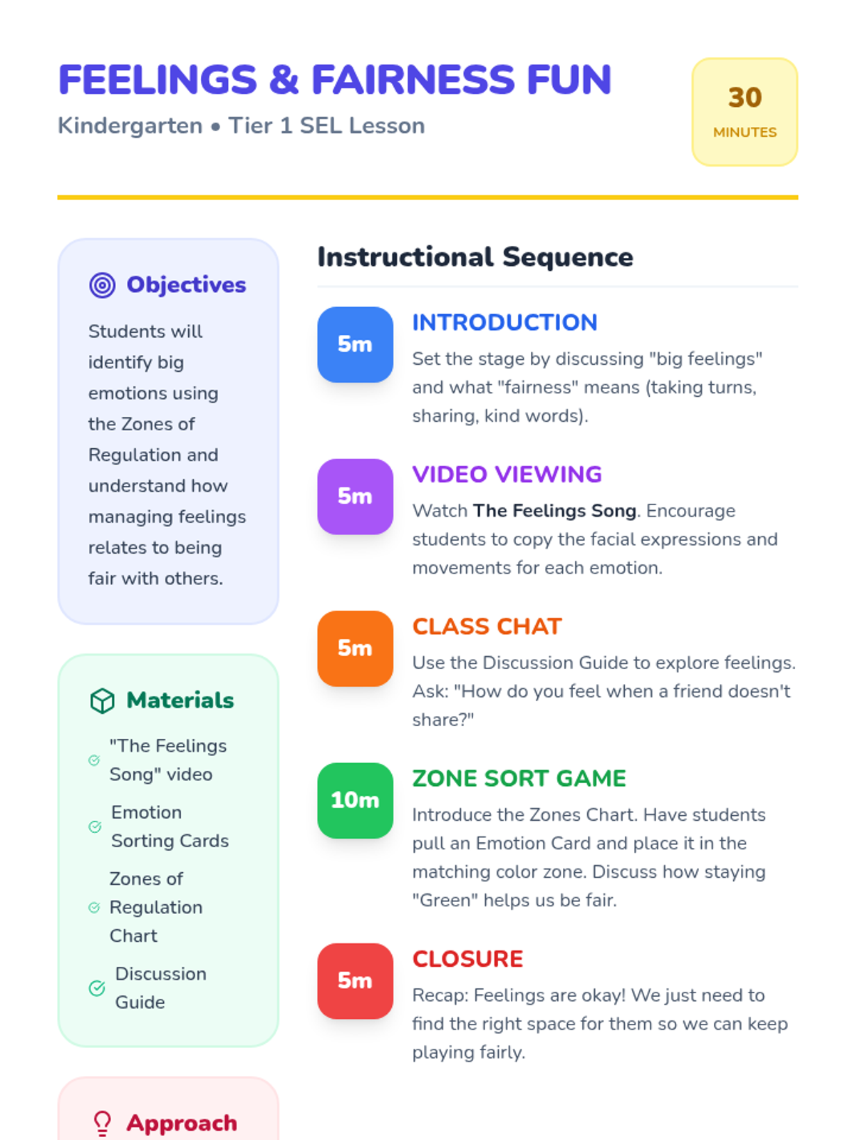 This interactive lesson for kindergarteners uses 'The Feelings Song' and the Zones of Regulation to help students identify big emotions and understand the importance of fairness. Through game-based activities, students learn to name their feelings and practice empathy in social situations.