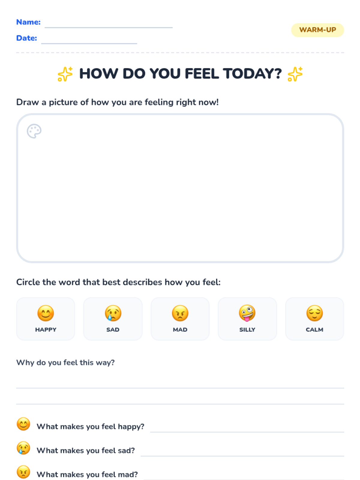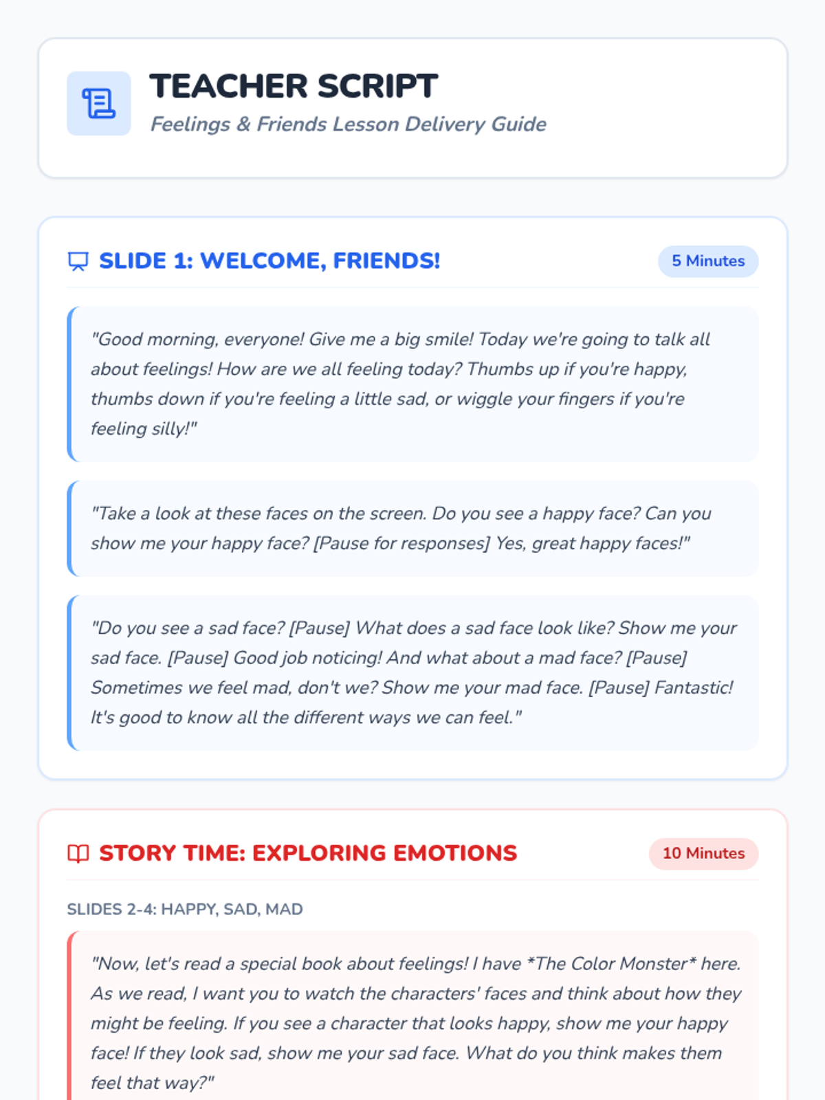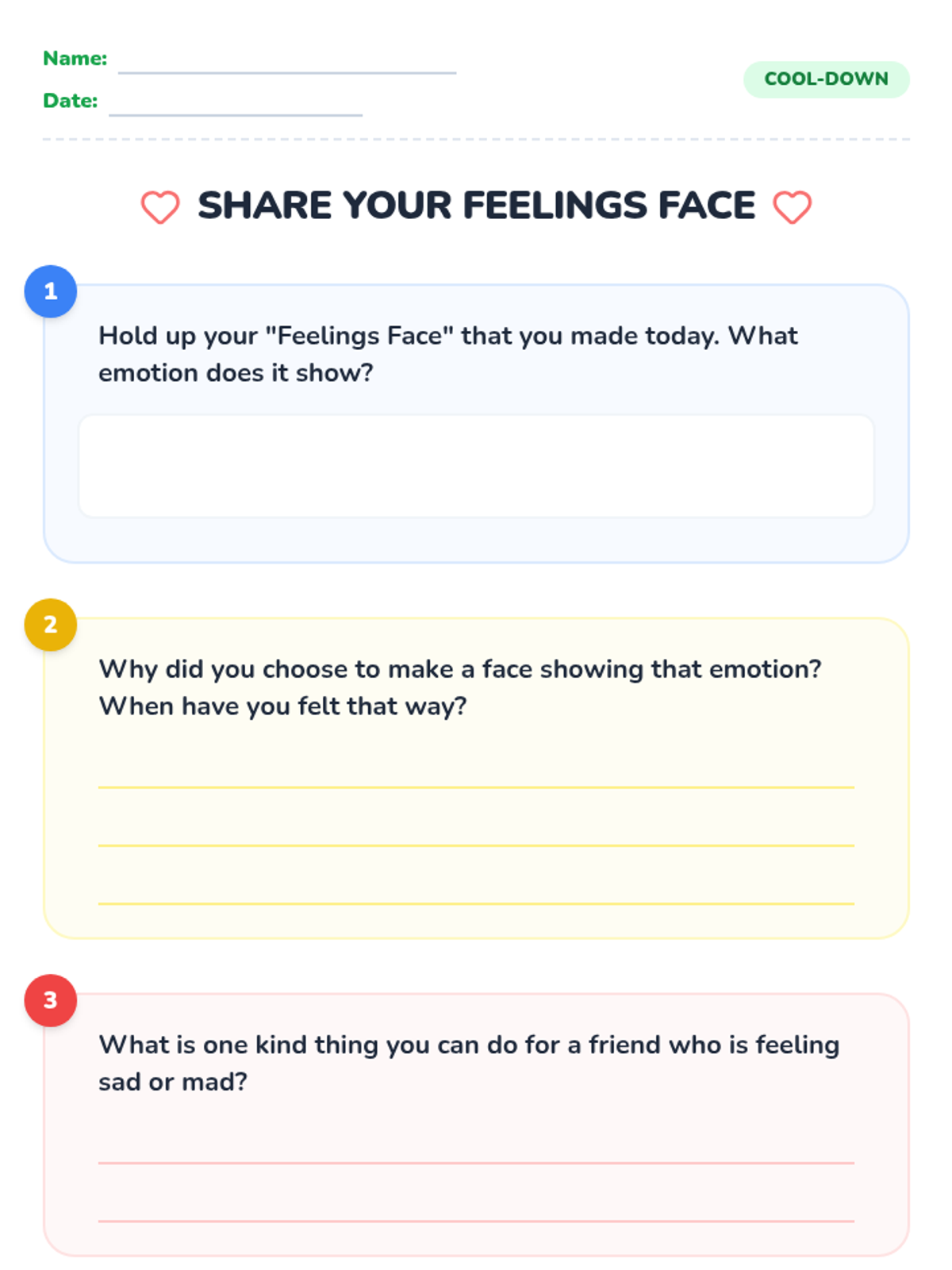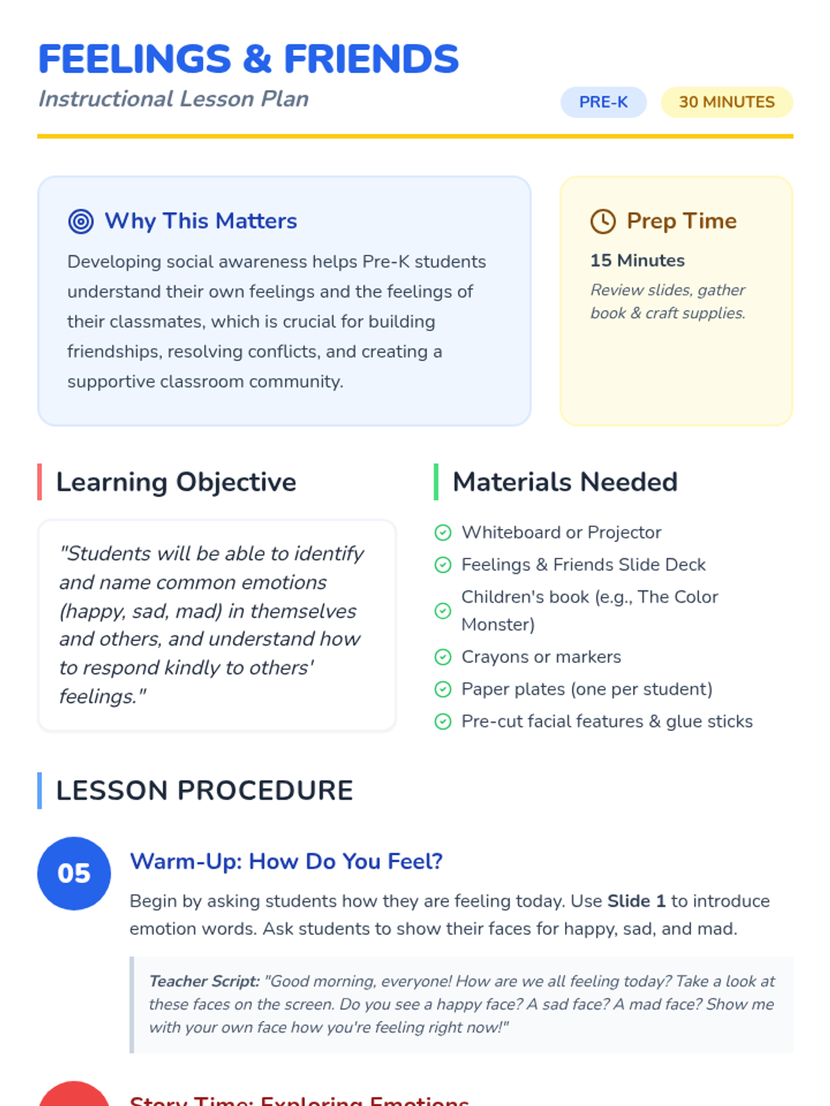 A 30-minute Pre-K lesson focused on identifying emotions (happy, sad, mad) and practicing empathy through storytelling and a hands-on 'Feelings Face' craft.