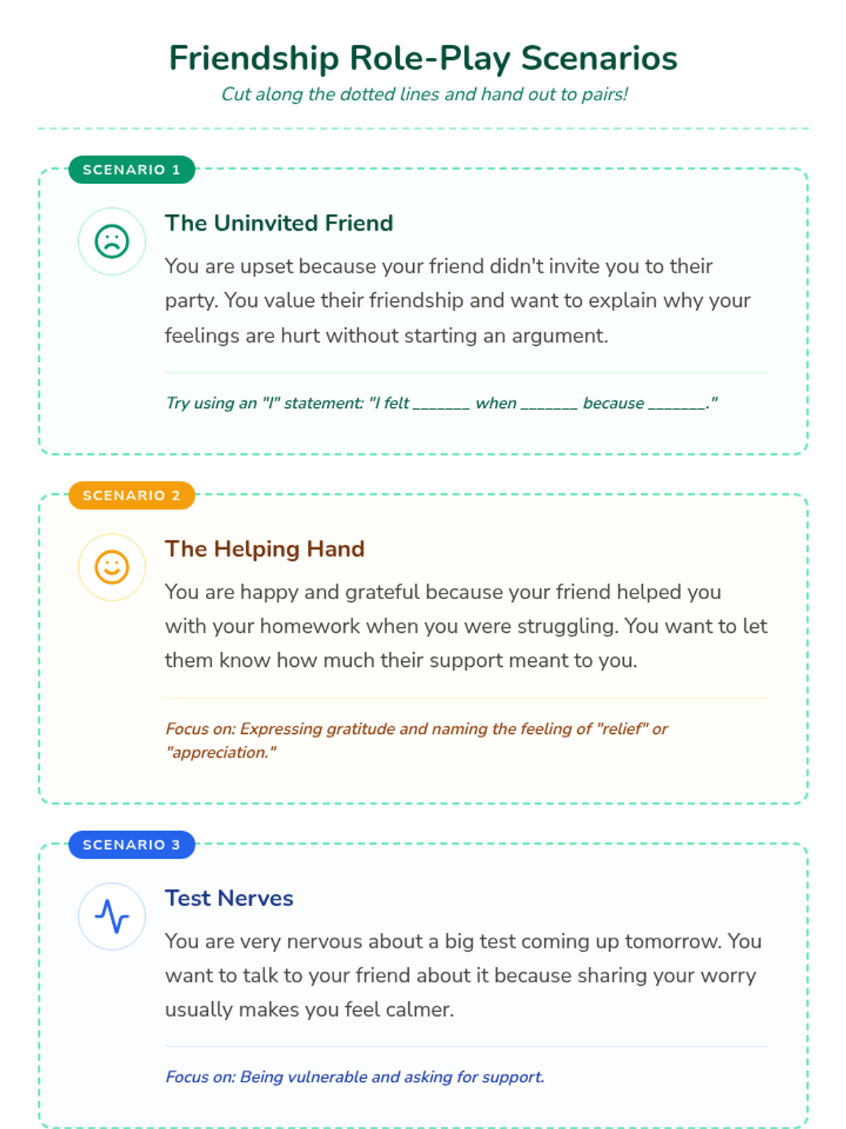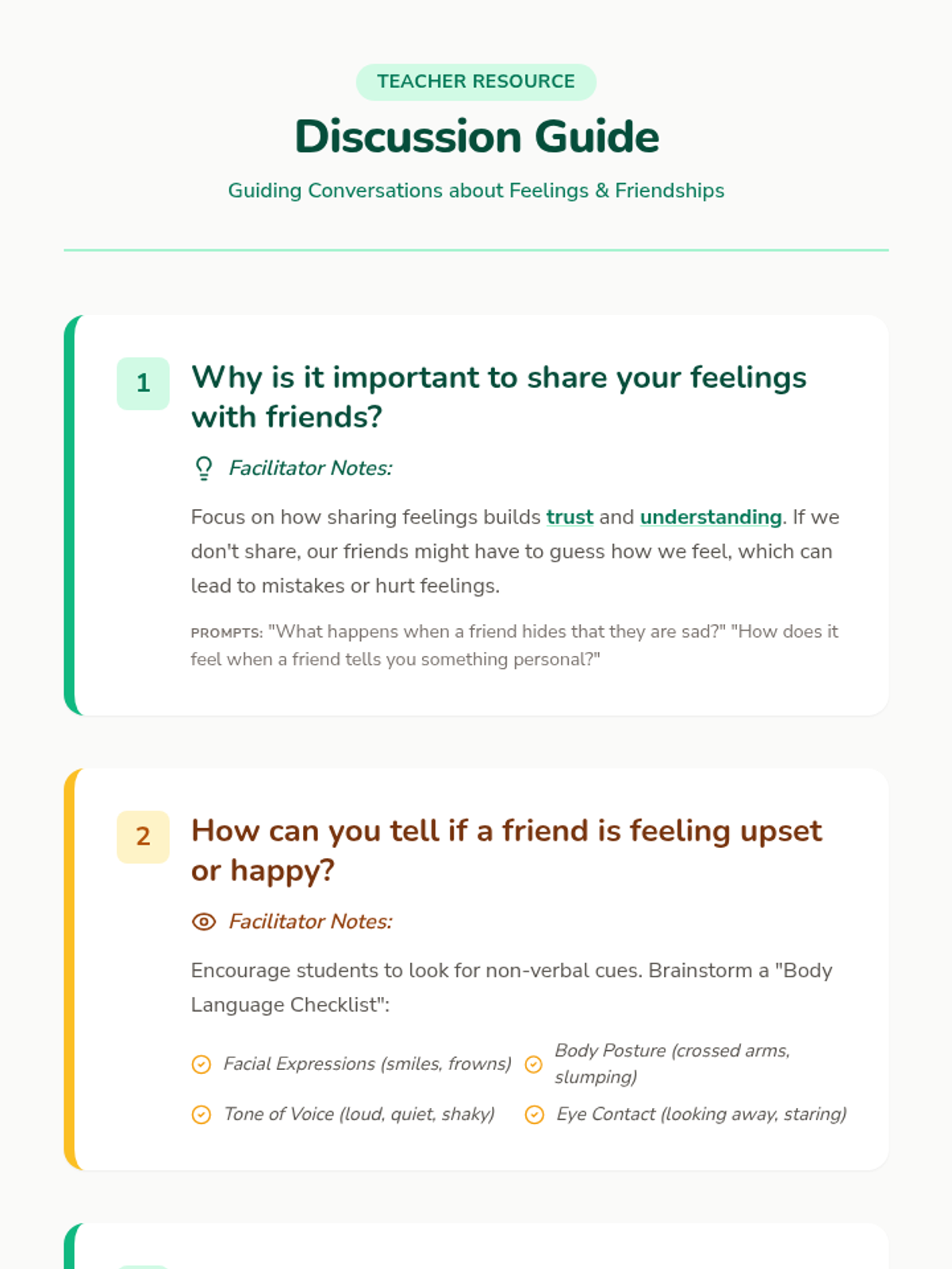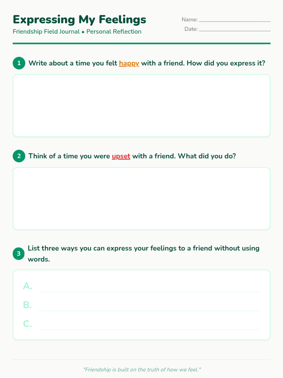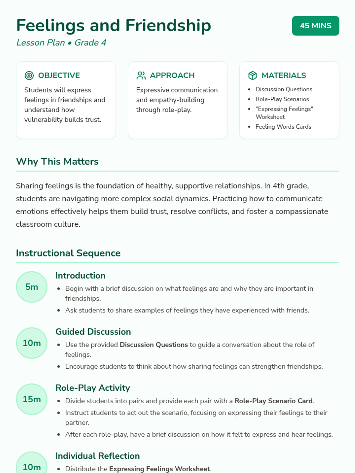 Students will explore the importance of sharing feelings in friendships through role-playing and reflection, developing empathy and communication skills for a positive classroom environment.
