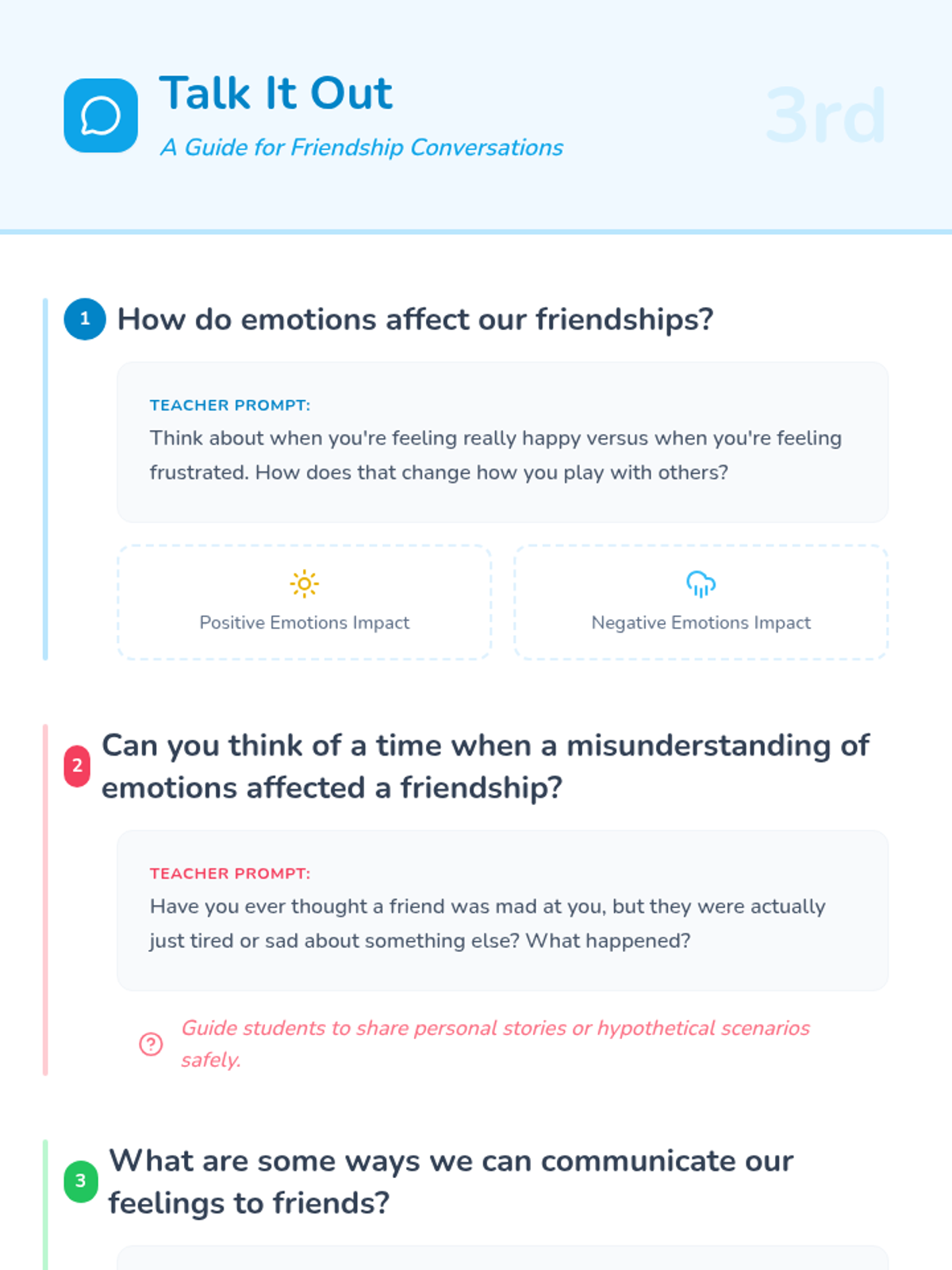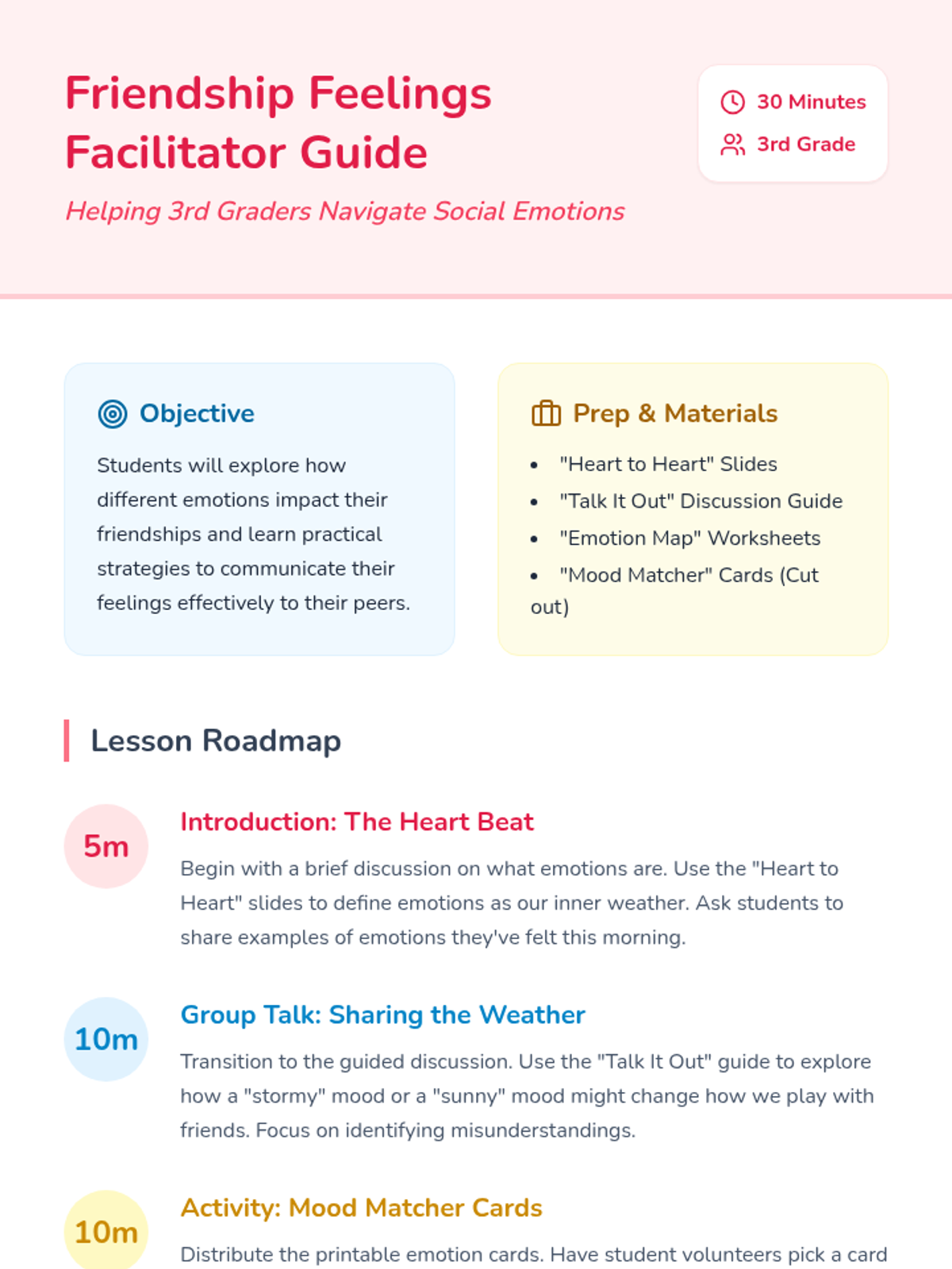 A 30-minute lesson for 3rd graders exploring the impact of emotions on friendships and learning effective communication strategies. Students will identify emotions, participate in a guided discussion, and play an interactive emotion-recognition game.