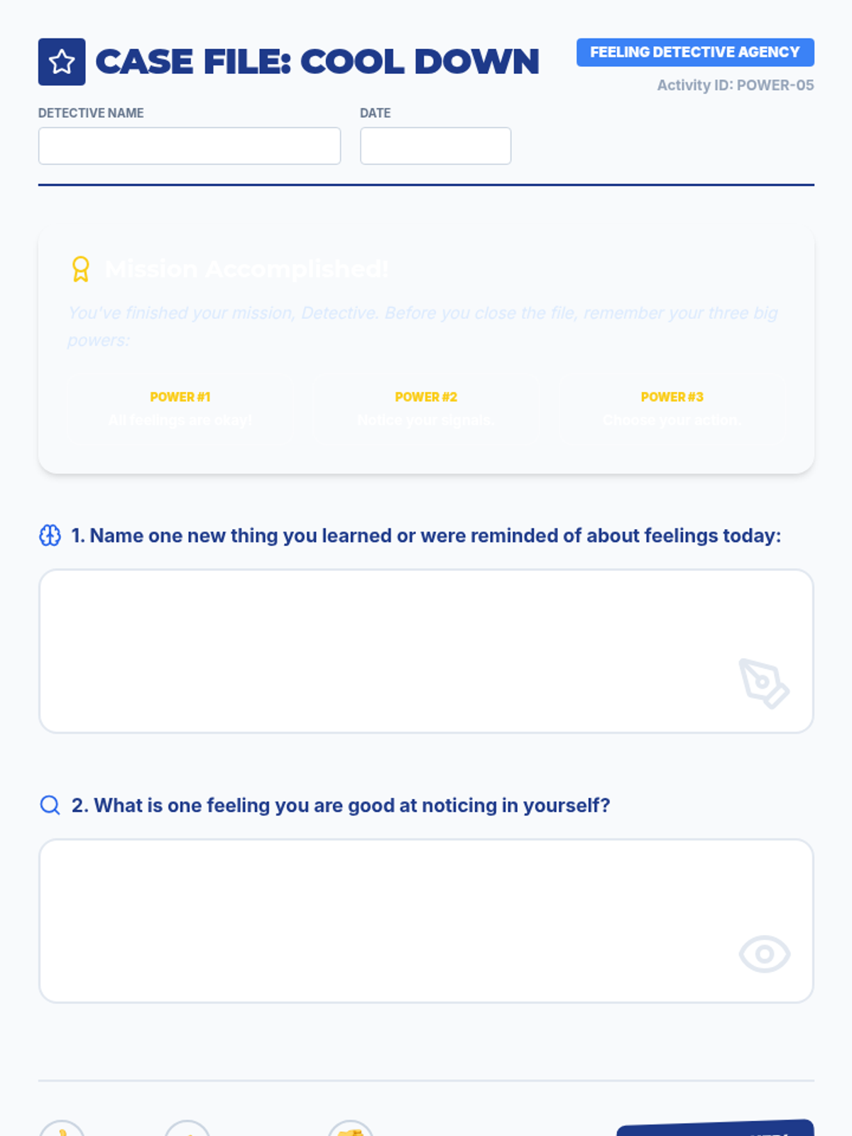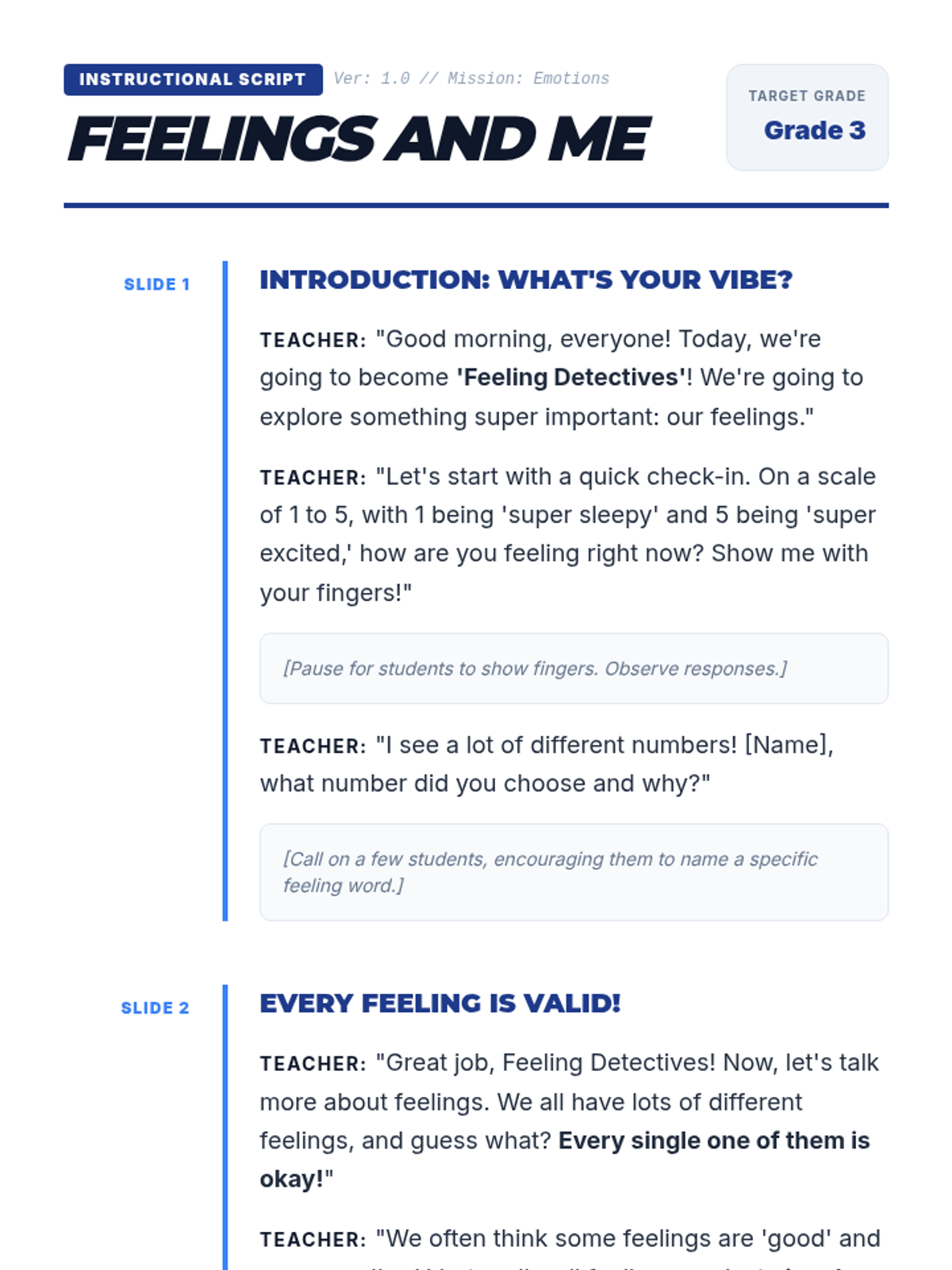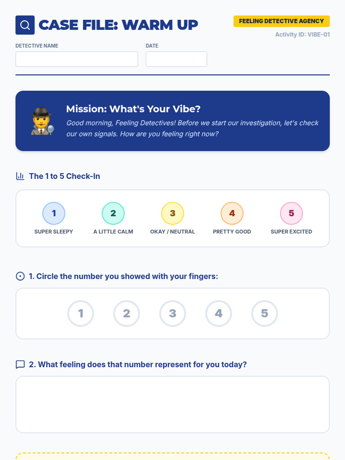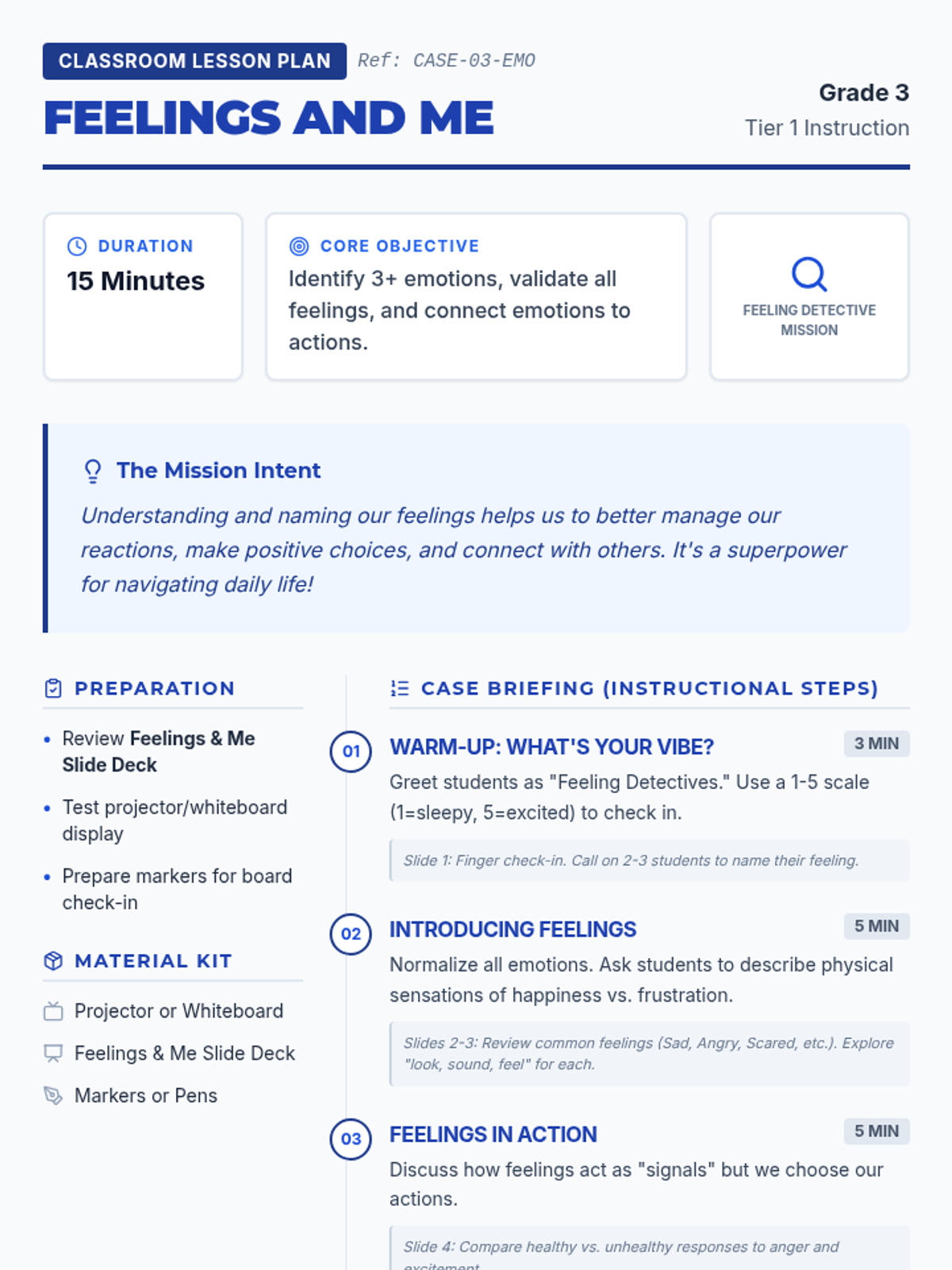 A 15-minute Tier 1 lesson for 3rd graders focused on identifying emotions, validating all feelings, and understanding the connection between emotions and actions. Students act as 'Feeling Detectives' to build self-awareness and self-management skills.