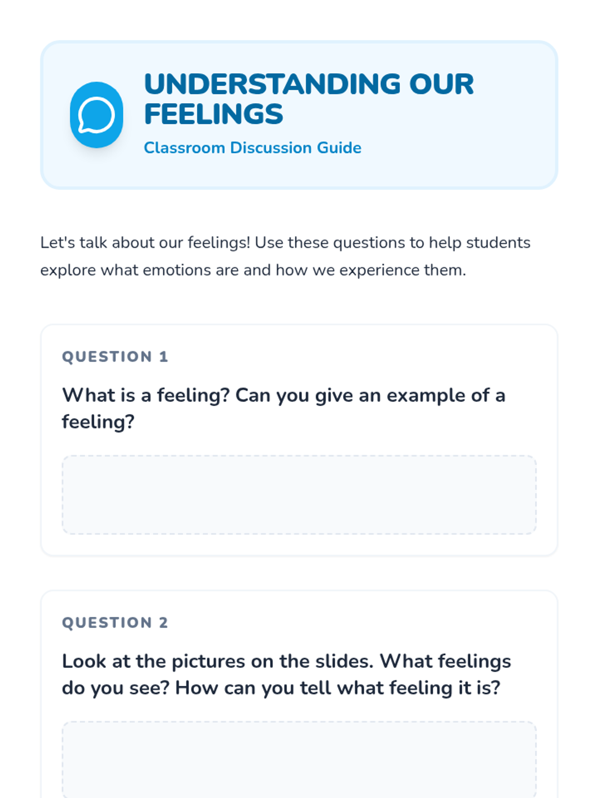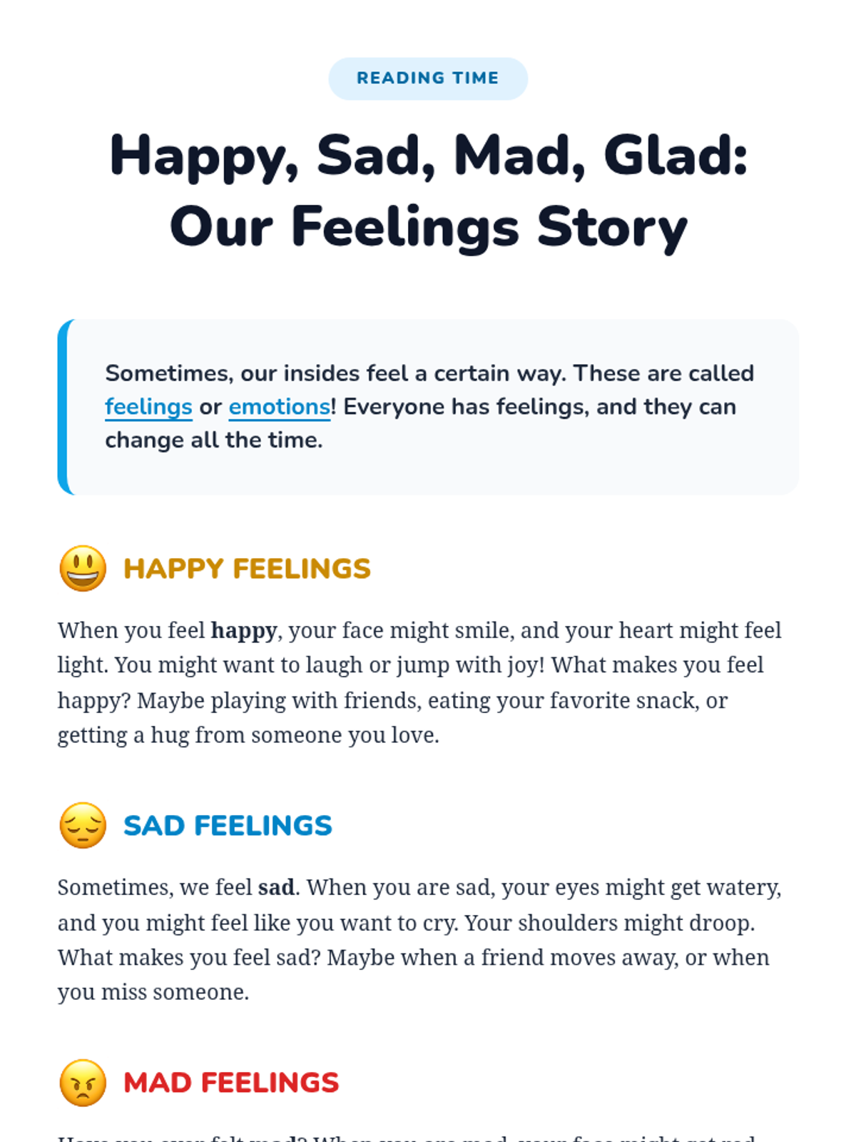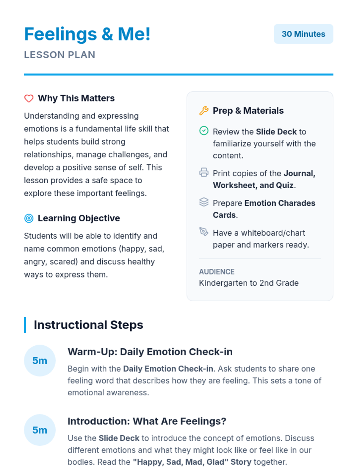 A foundational lesson for K-2 students to identify, understand, and express common emotions in healthy ways through interactive discussion, stories, and play.