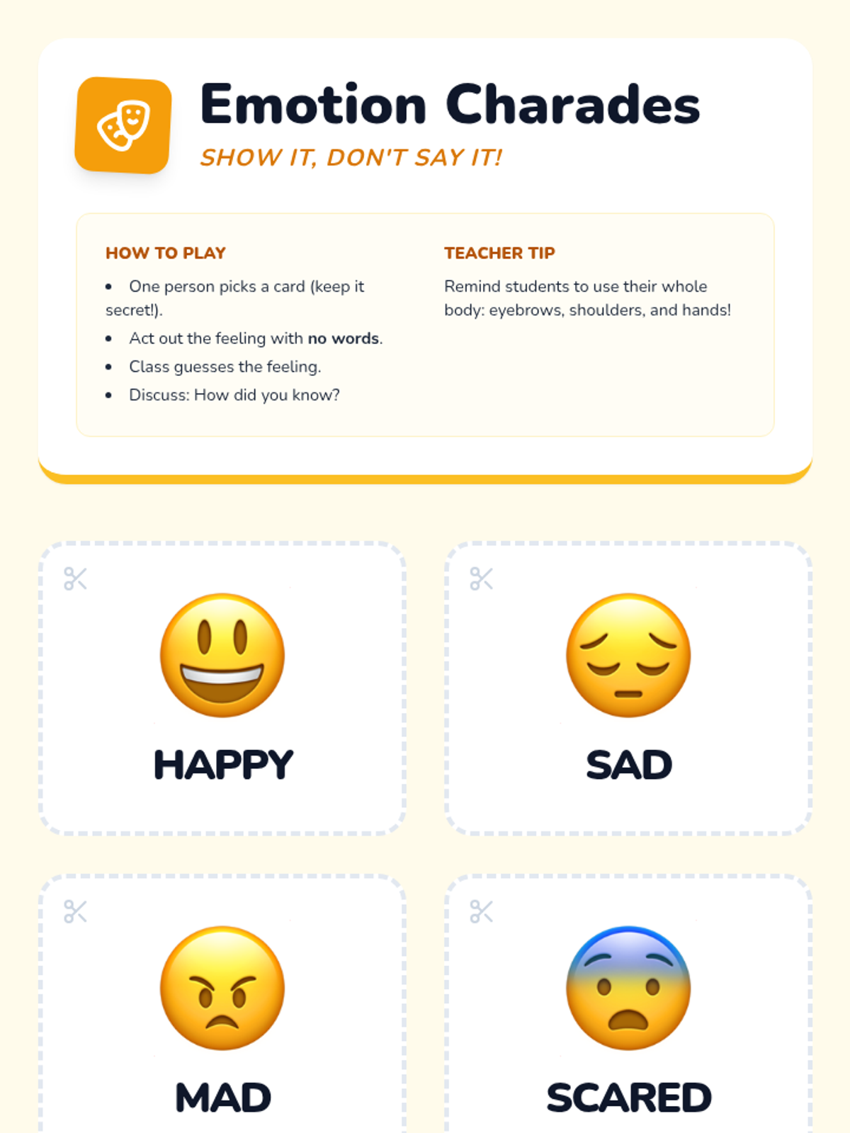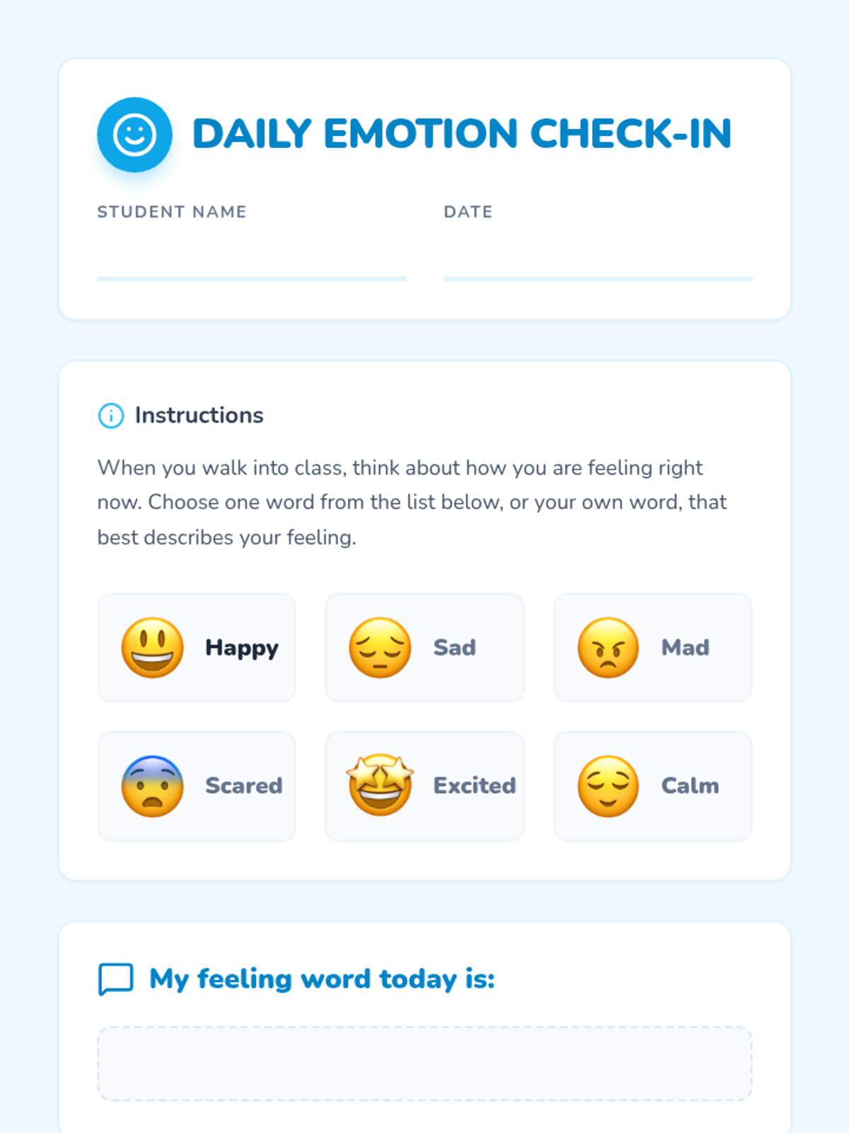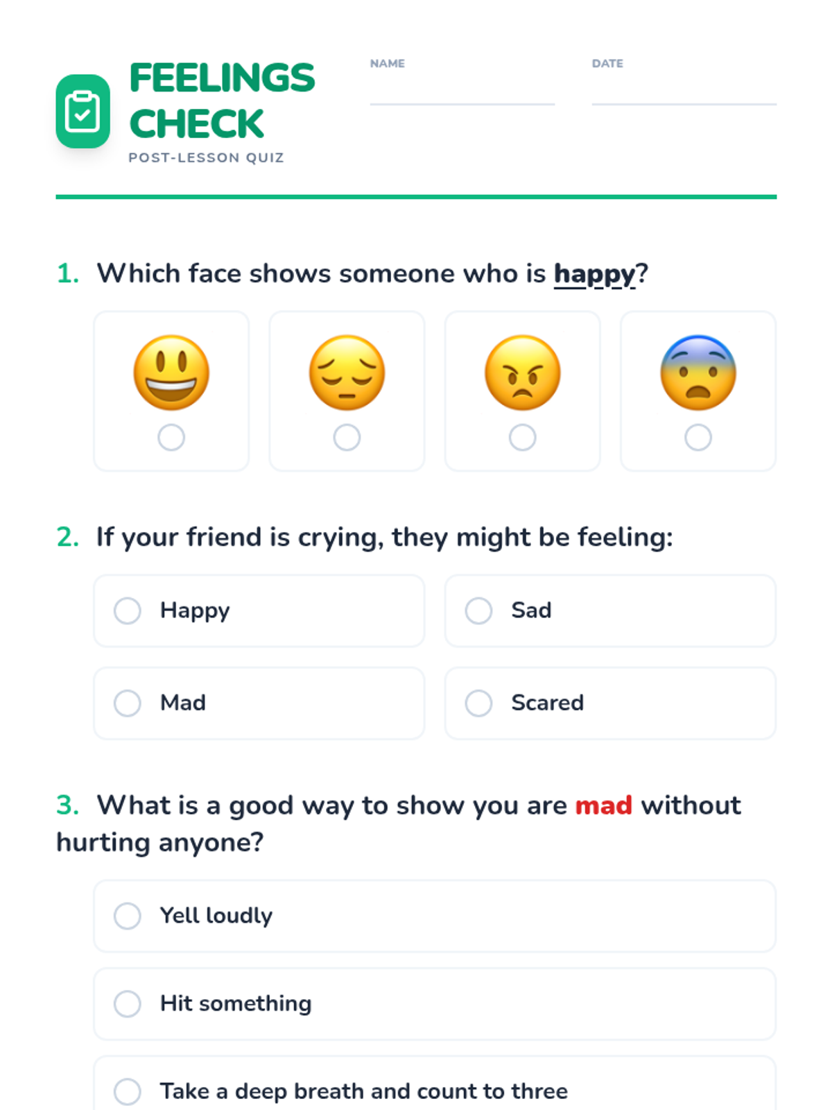 A foundational lesson for K-2 students to identify, understand, and express common emotions in healthy ways through interactive discussion, stories, and play.