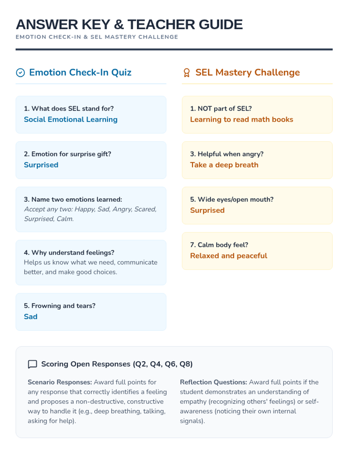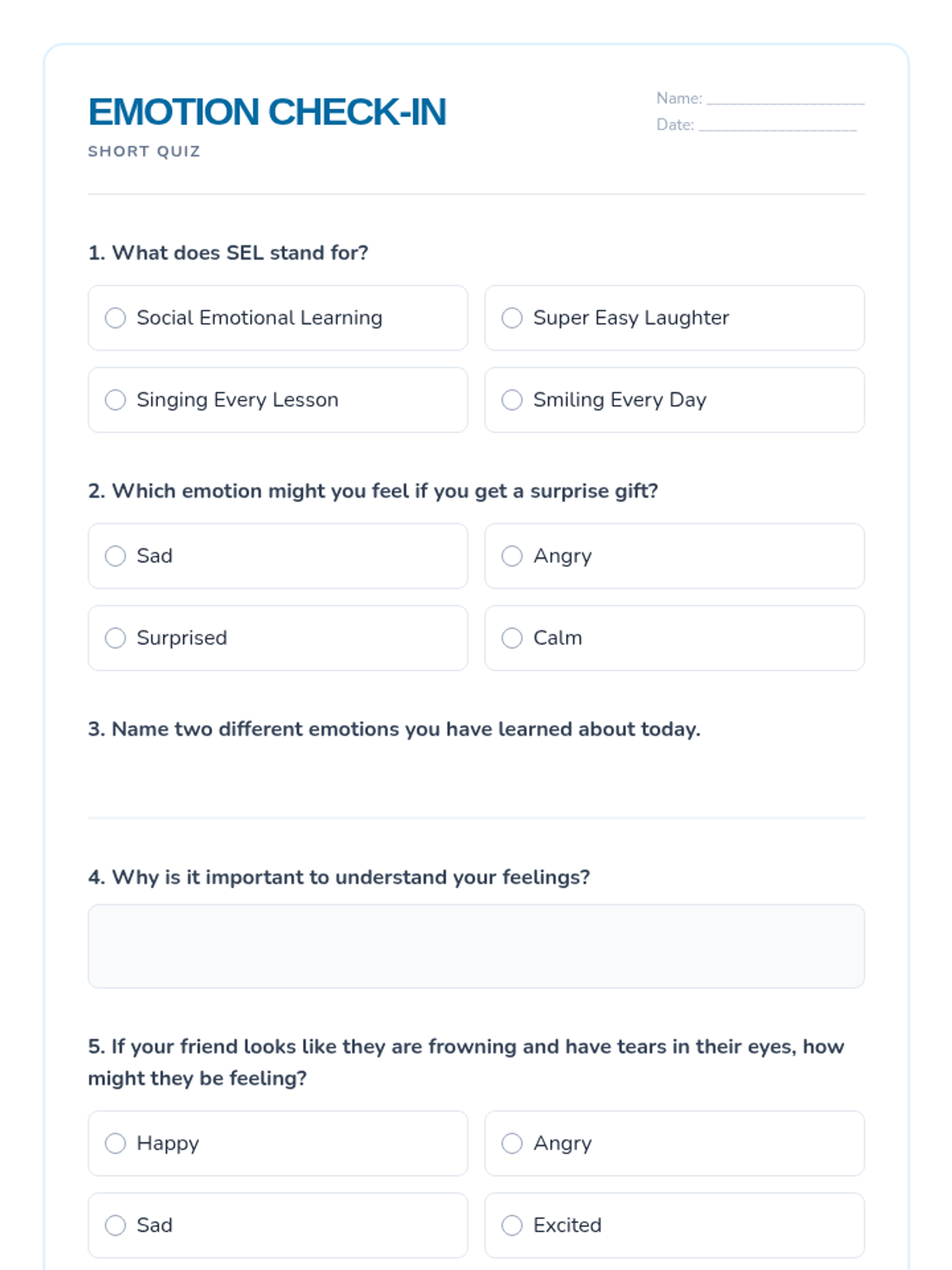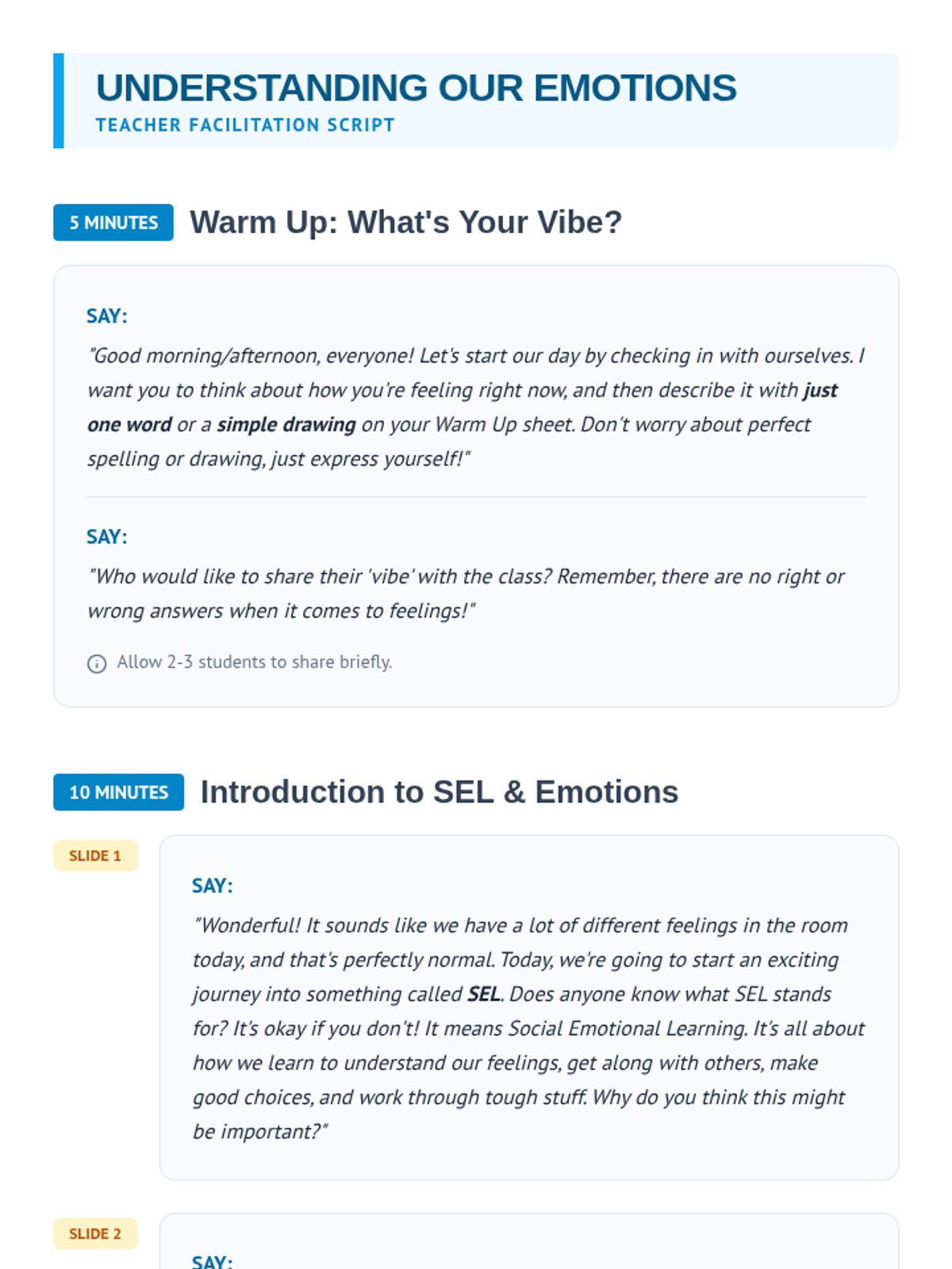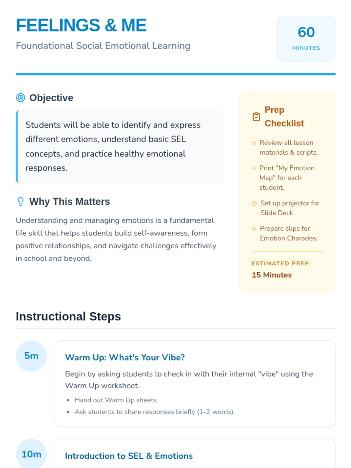 This lesson introduces P3-P4 students to Social Emotional Learning (SEL) by exploring their own emotions and how to identify them. Students will engage with activities, readings, and discussions to build a foundational understanding of SEL.