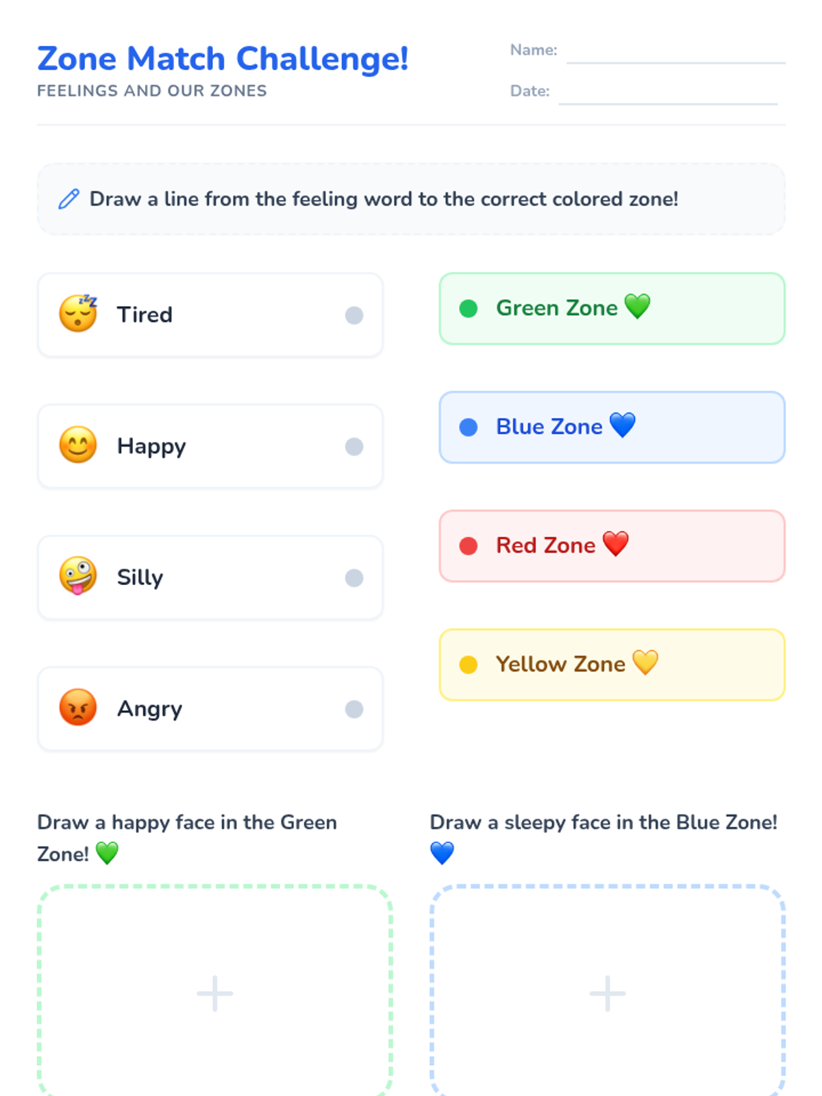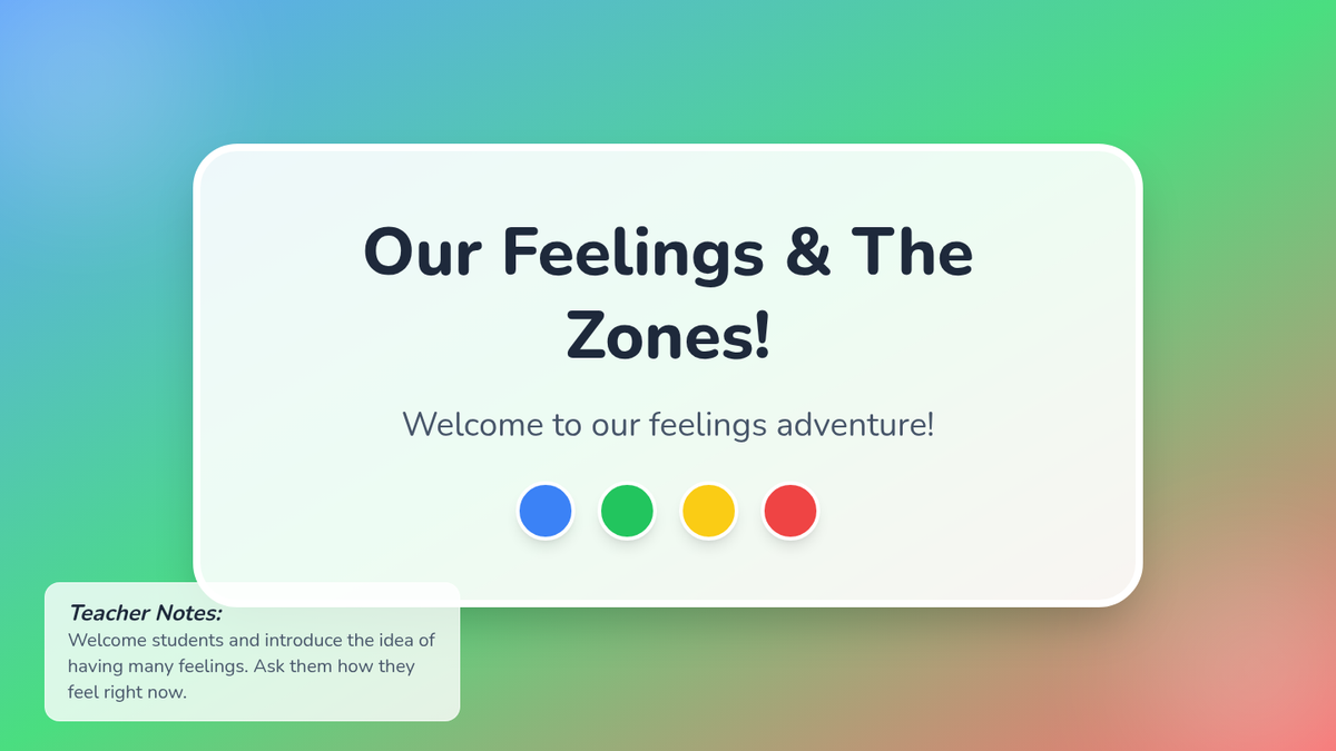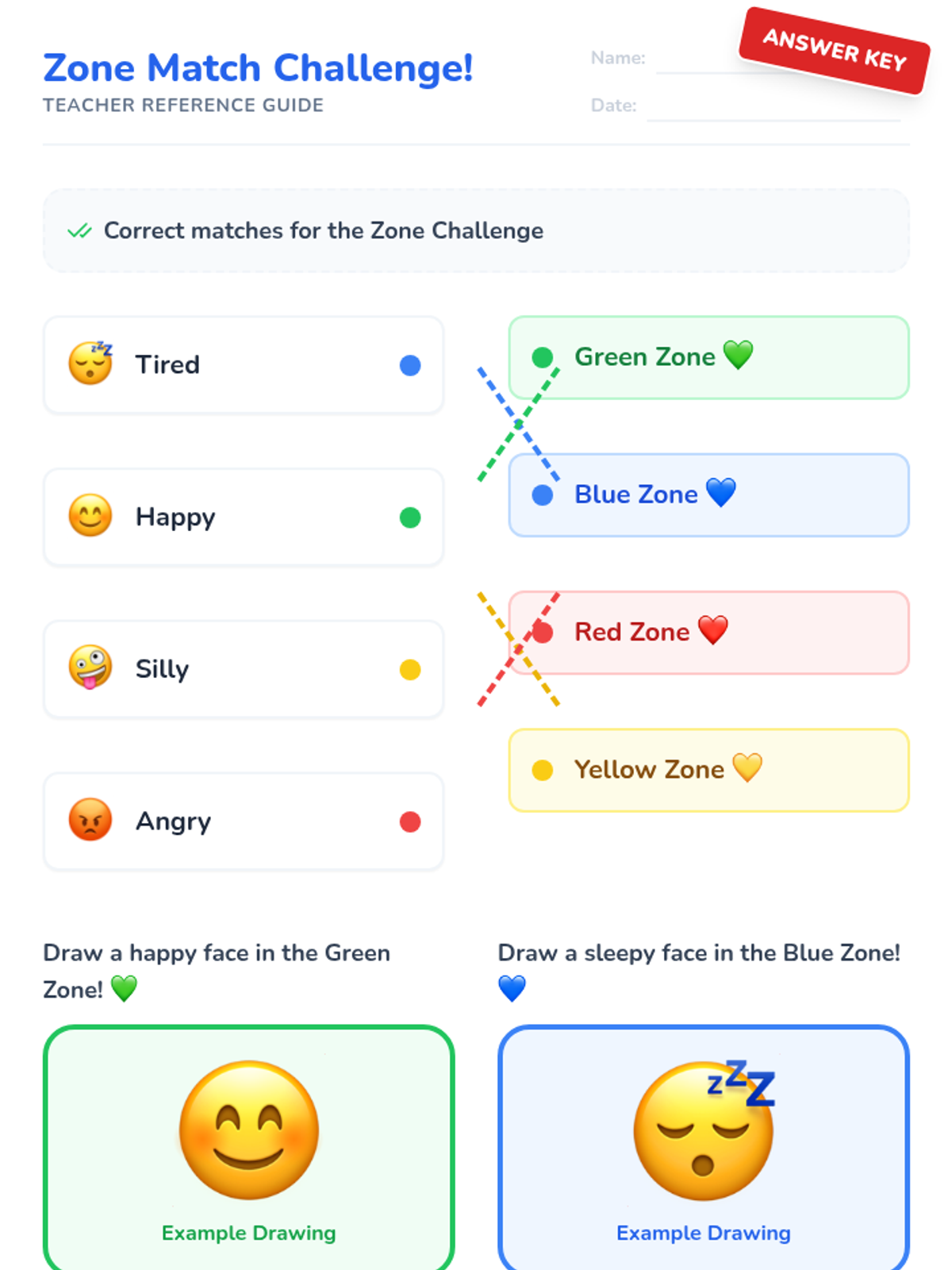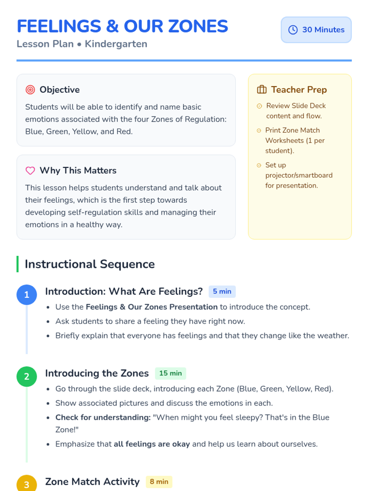 A fun and interactive 30-minute lesson introducing Kindergarten students to the Zones of Regulation, helping them identify and name basic emotions.