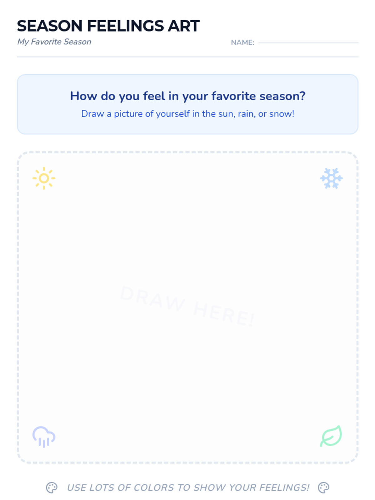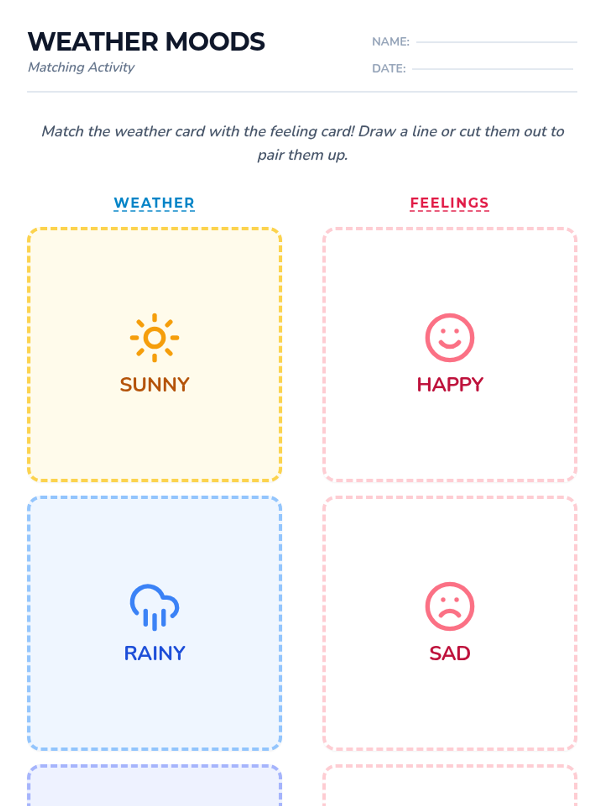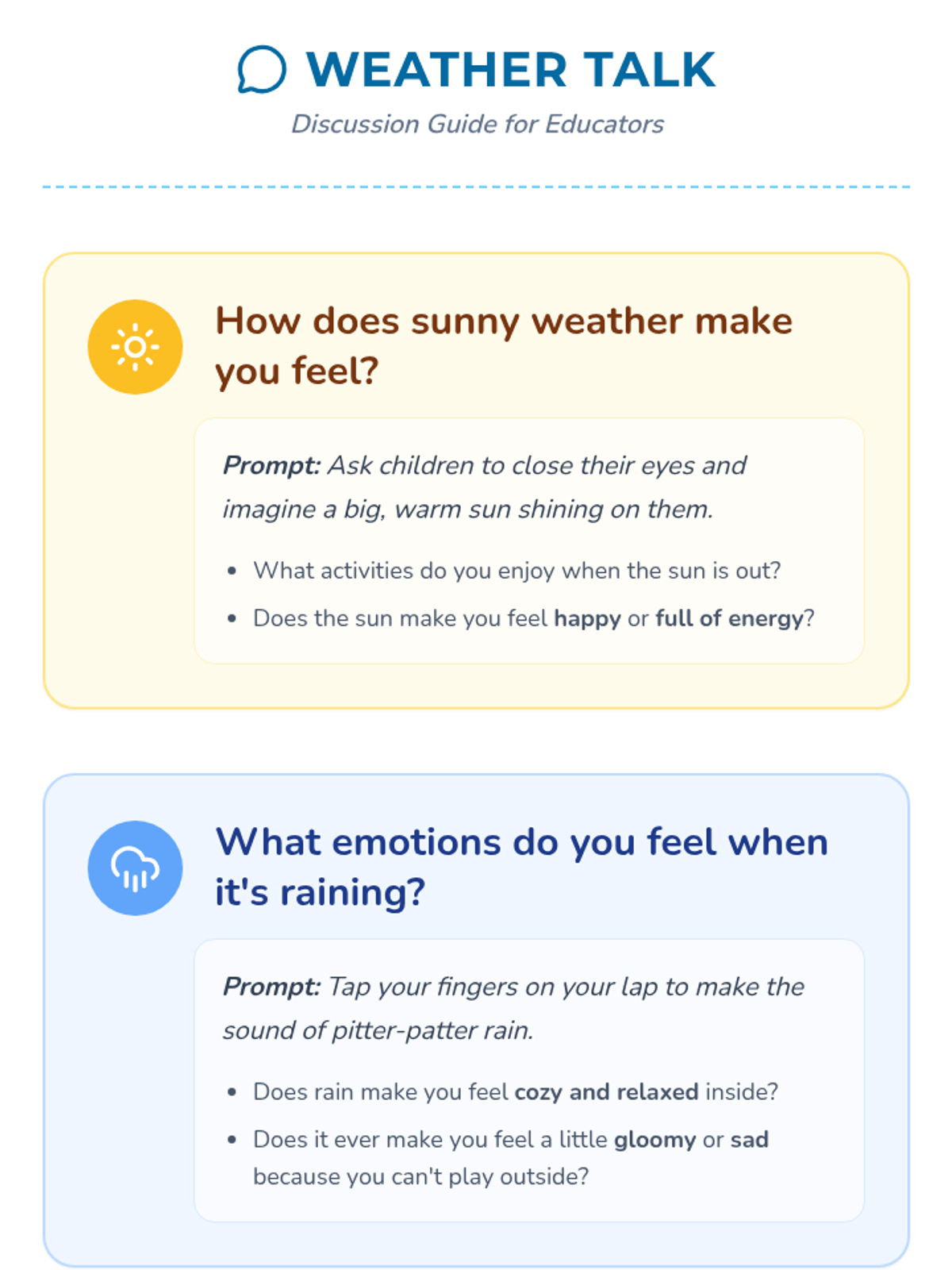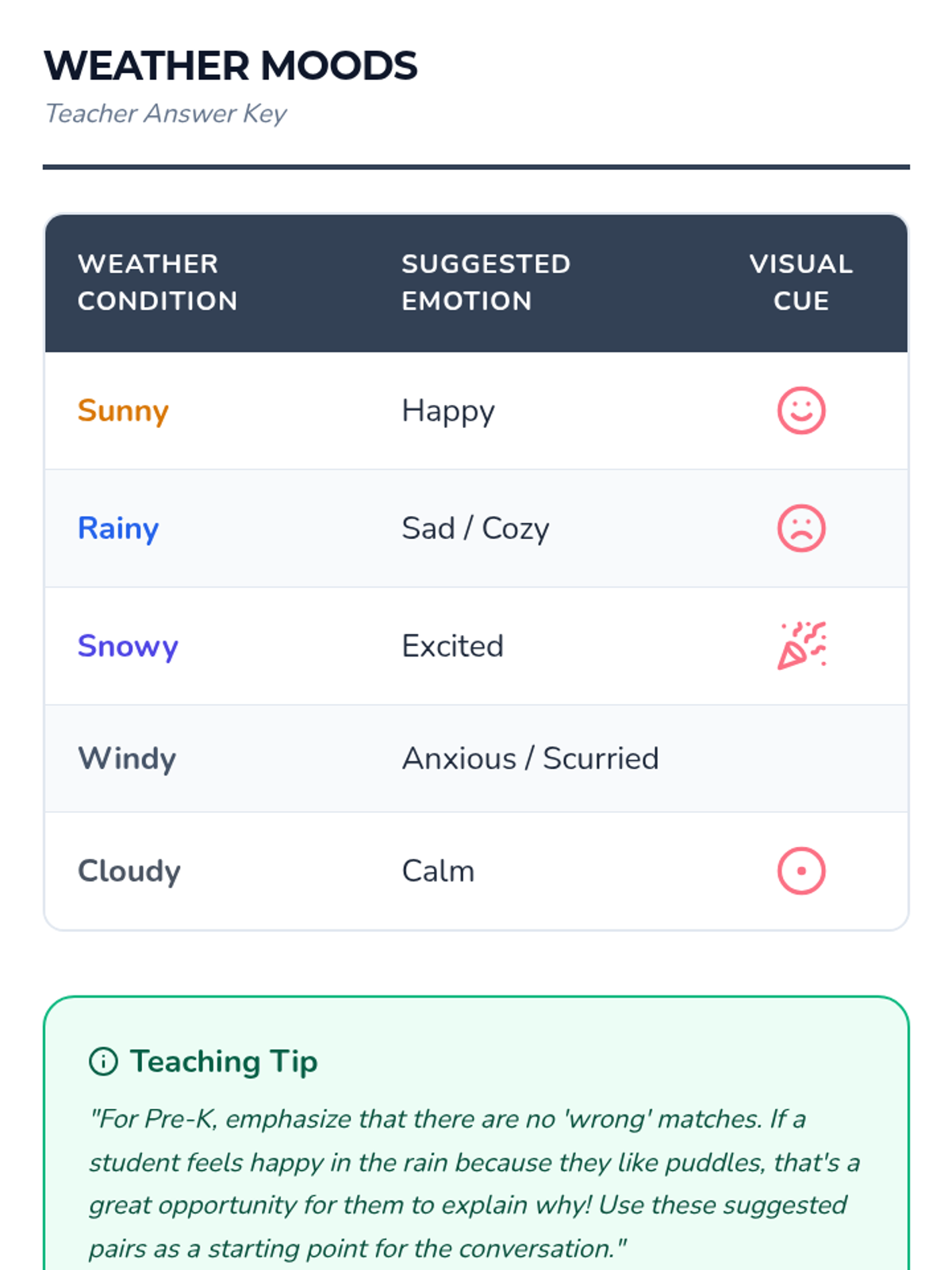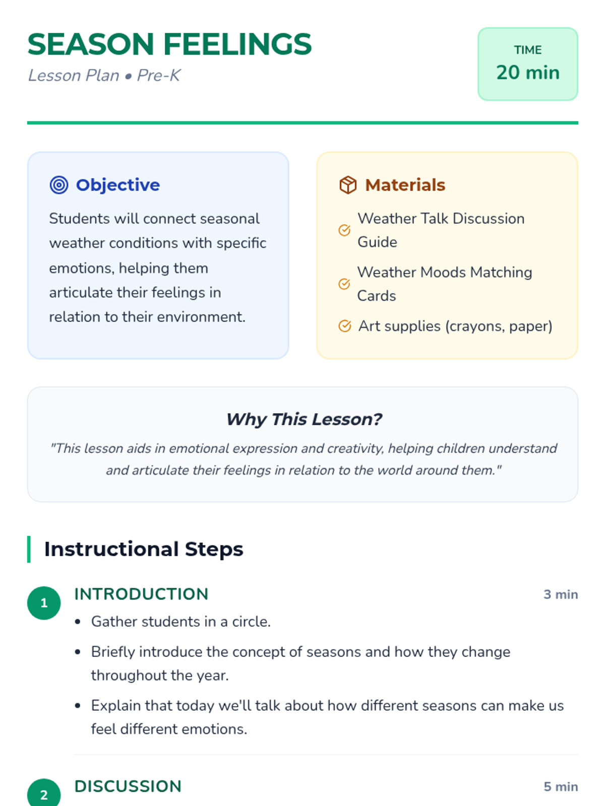 A 20-minute Pre-K lesson that connects seasonal weather patterns with emotional expression through discussion, matching activities, and art.