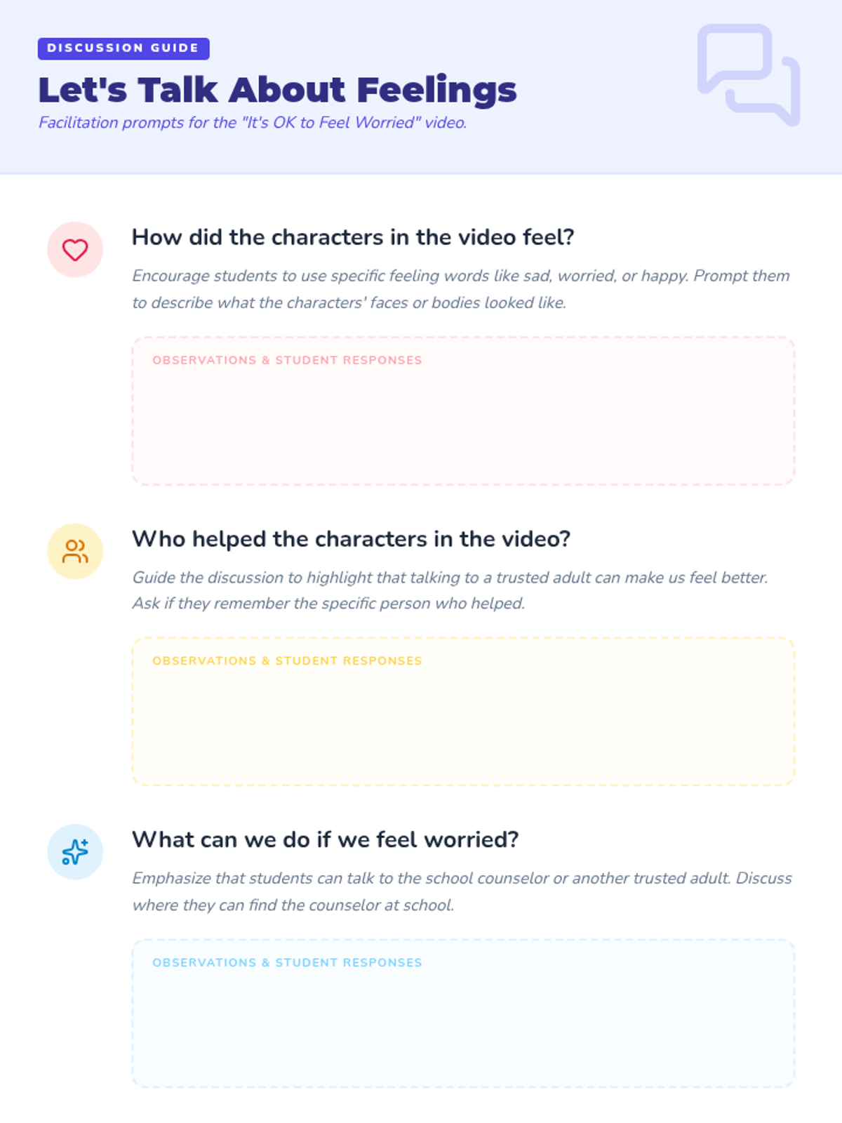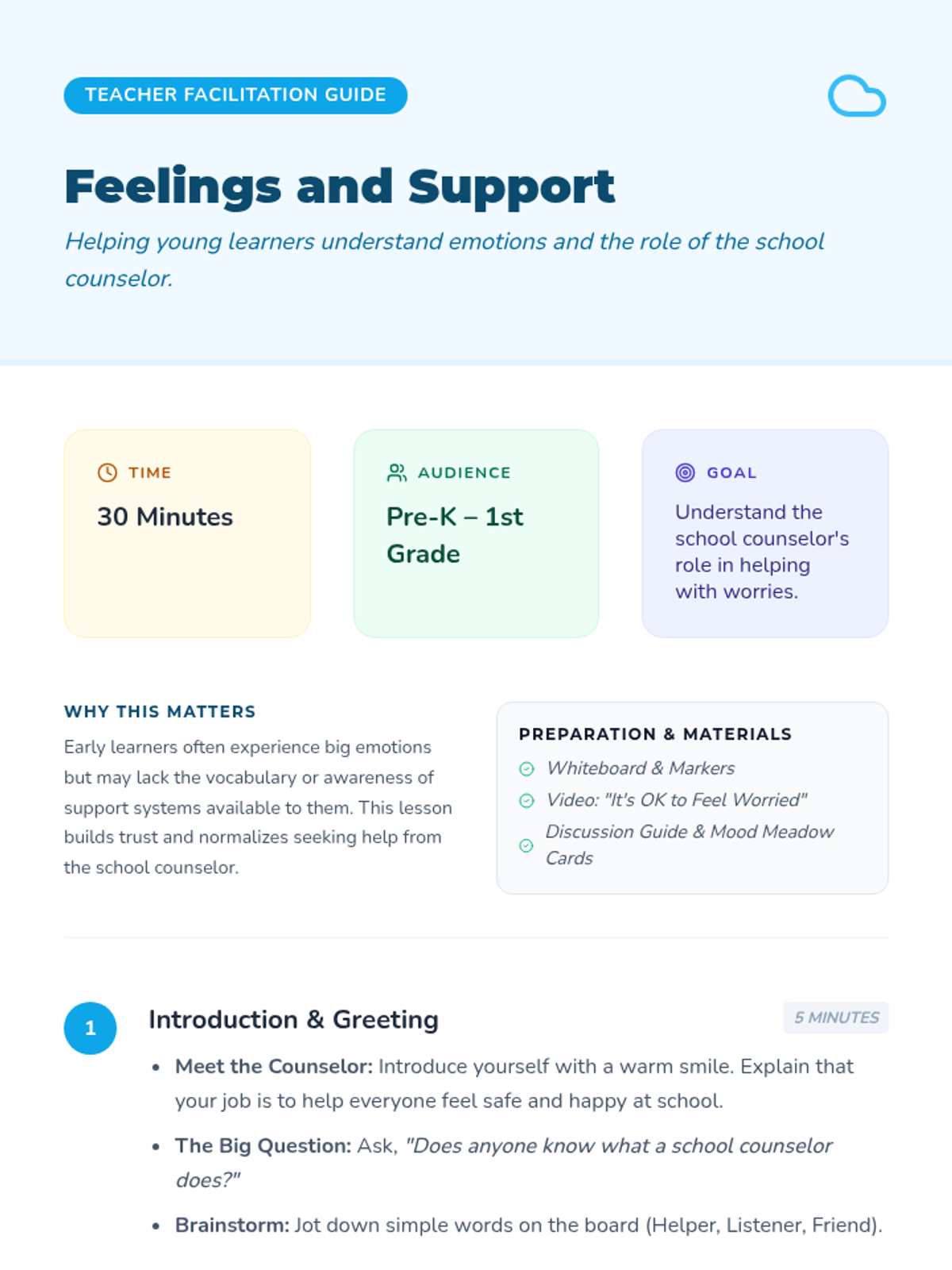 A gentle introduction for Pre-K to 1st-grade students to understand their emotions and the helpful role of the school counselor. Students will watch a short film about worry and use interactive feeling cards to express themselves.